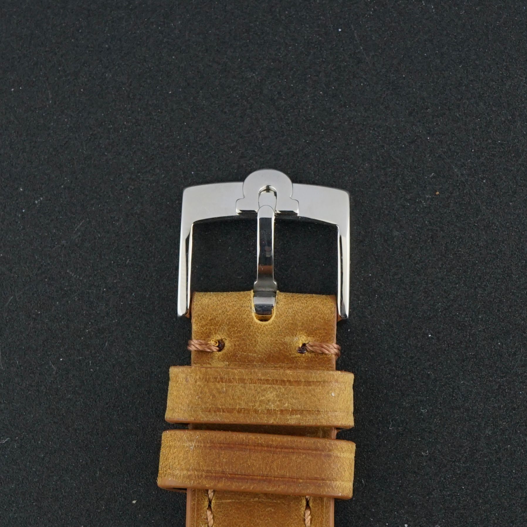 Este Omega Genève vintage fue producido en 1971. Presenta una caja de 35 milímetros y una esfera en color plata claro con efecto sol en increíble estado. El reloj tiene una ventana de fecha a las 3 en punto, gracias al movimiento automático calibre 1481, que fue revisado en febrero de 2026 y actualmente funciona bien. La función de cambio rápido de fecha al presionar la corona no funciona, sin embargo, la fecha cambia automáticamente después de 24 horas y se puede ajustar manualmente avanzando las manecillas en ciclos de 24 horas. Hemos decidido combinar este reloj con una correa de cuero marrón mate, que creemos que le queda muy bien. En general, la condición es excelente, lo que lo convierte en un compañero perfecto para el uso diario.