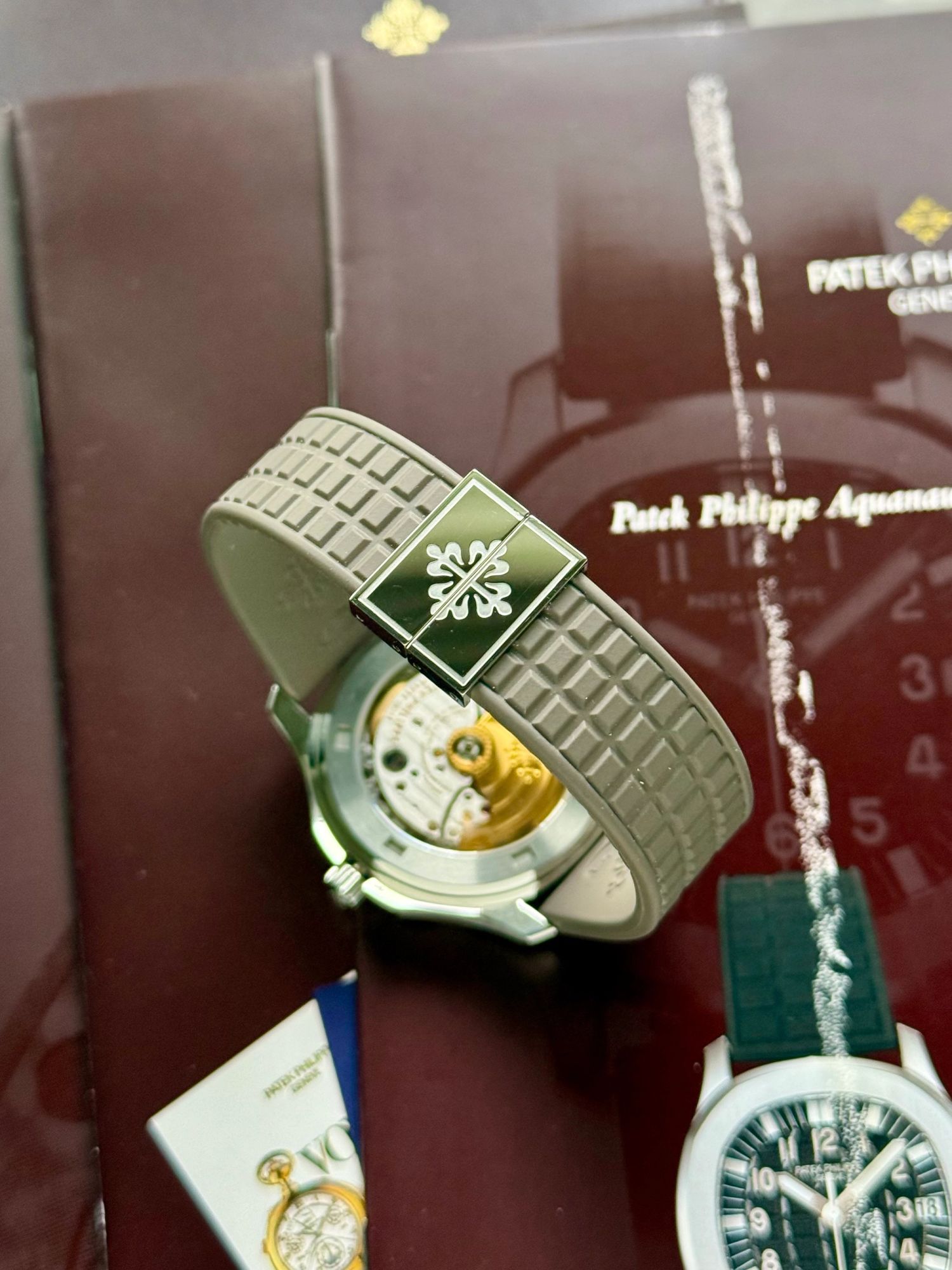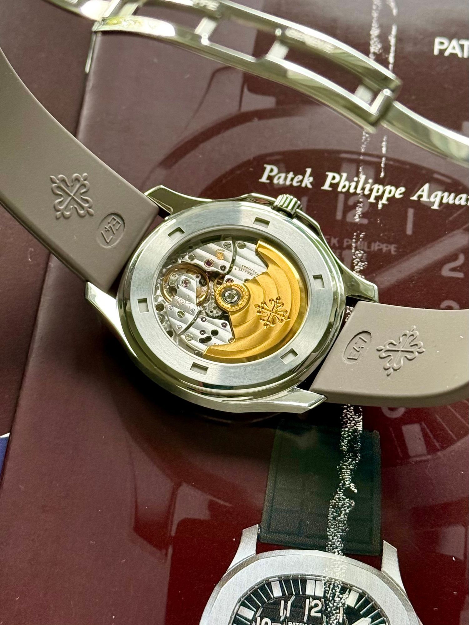 Si miras de cerca la esfera, verás la esfera semibrillante con el icónico patrón Aquanaut, que está perfectamente integrado con el perfil de la correa de goma. Todo esto completa el aspecto deportivo, lujoso y vintage de este Patek Philippe. En la esfera y las agujas encontramos luminova, lo que te permite consultar la hora cuando está oscuro.
