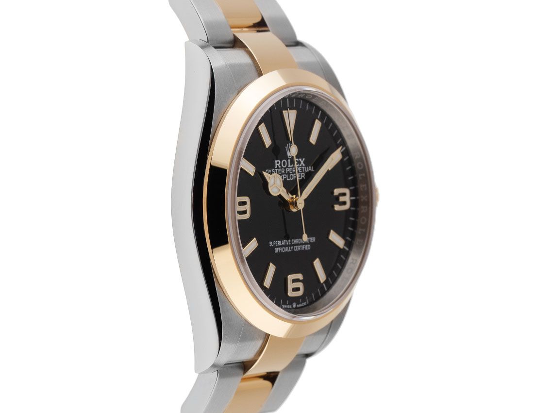 Rolex Explorer I Stahl 18kt Gelbgold Automatik Armband OysterGehäuse Edelstahl / 18kt Gelbgold poliert und satiniert, Gehäusedurchmesser ohne Krone 36mm, Gehäusehöhe 11,5mm. Lünette 18kt Gelbgold glatt und poliert. Armband Oyster Edelstahl / 18kt Gelbgold poliert und satiniert, Sicherheitsfaltschließe Edelstahl / 18kt Gelbgold mit Hersteller-Logo. Zifferblatt schwarz mit aufgesetzten gelbgoldenen arabischen Leuchtziffern und Leuchtindexen sowie gelbgoldenen Leuchtzeigern. Uhrwerk Automatik, Chronometer mit Zeugnis, Rolex Manufakturkaliber 3230 mit 31 Edelsteinen. Anzeige von Stunde, Minute und Sekunde über Zeiger aus der Mitte mit Sekundenstopp zur sekundengenauen Einstellung der Uhrzeit. Saphirglas kratzfest. Krone verschraubbar mit Hersteller-Logo. Boden Edelstahl verschraubt. Gewicht der Uhr inklusive Armband 126g, Länge des Armbandes inklusive Gehäuse 170mm. Referenznummer: 124273, Gehäusenummer: 12S7KXXX, ID: P2453180000226H-13800/13750, Artikelnummer: 10000084640. Original Rolex Box mit Umkarton und Garantie Papiere von November 2024, neue Rolex Garantie Karte ohne Ländercode sowie Beschreibung, Ledermäppchen und Rolex Chronometer-Siegel sowie Watchregister Auszug von Februar 2026, The Watch Register Zertifikat / ohne Eintrag (Internationale Datenbank für verlorene oder gestohlene Uhren), Full Set. Superschnäppchen, Kapitalanlage mit Wertsteigerungspotential, sehr seltenes Sammlerstück. Wie Neu. Lieferzeit sofort.