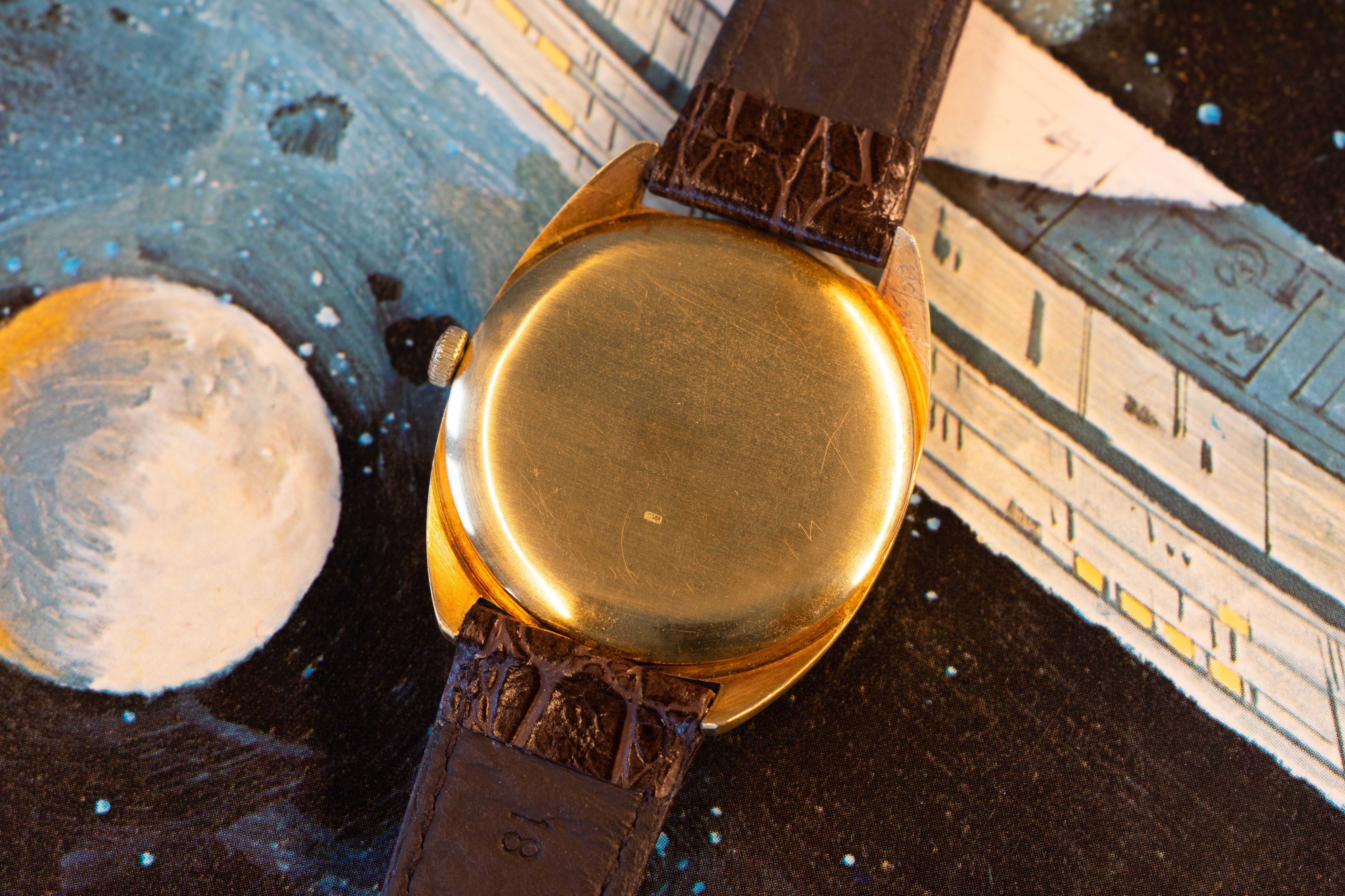 The ultimate bang-for-your-buck gold watch.This is a perfectly sized gentleman’s watch with a distinctive C-shaped case, produced by Guillod & Co for Zenith. Guillod was one of the great Swiss case makers, supplying cases to the very top of the industry including Vacheron Constantin, Cartier, Rolex, and Patek Philippe.
