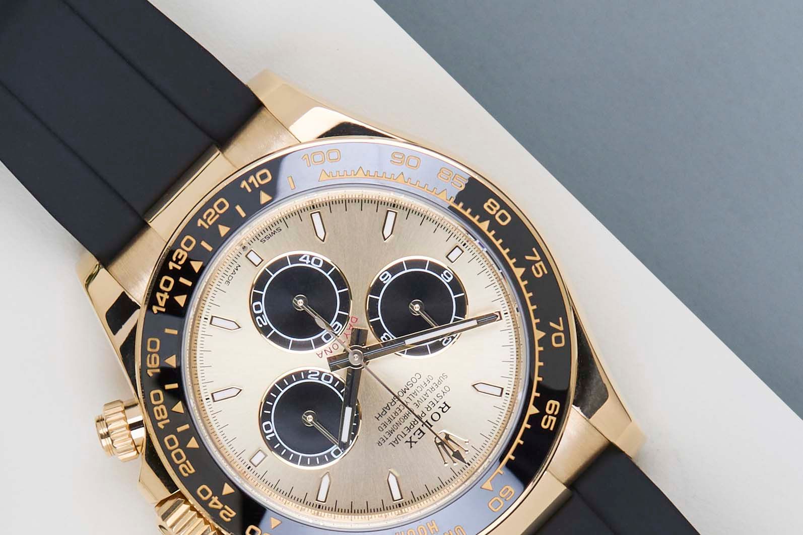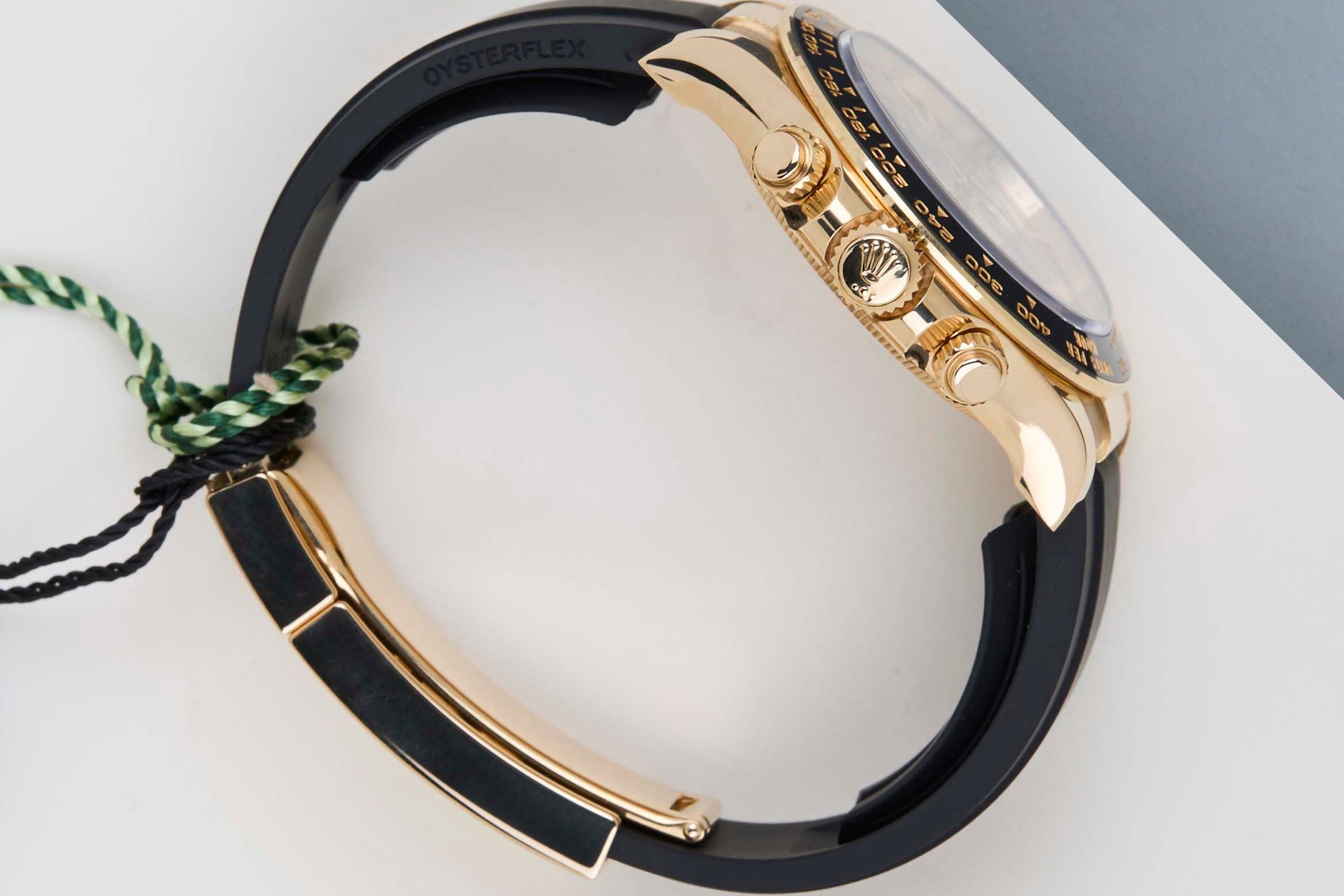La referencia 126518 LN está especialmente relacionada con un Daytona de 18k en oro amarillo equipado con una correa Oysterflex. La correa Oysterflex es un diseño interno que consiste en una hoja superplástica cubierta con un caucho de alta gama, resistente a los efectos ambientales. Esta referencia corresponde a la última generación de la línea Daytona, que presenta una esfera actualizada y un borde metálico alrededor del bisel de cerámica, en este caso hecho de oro amarillo.