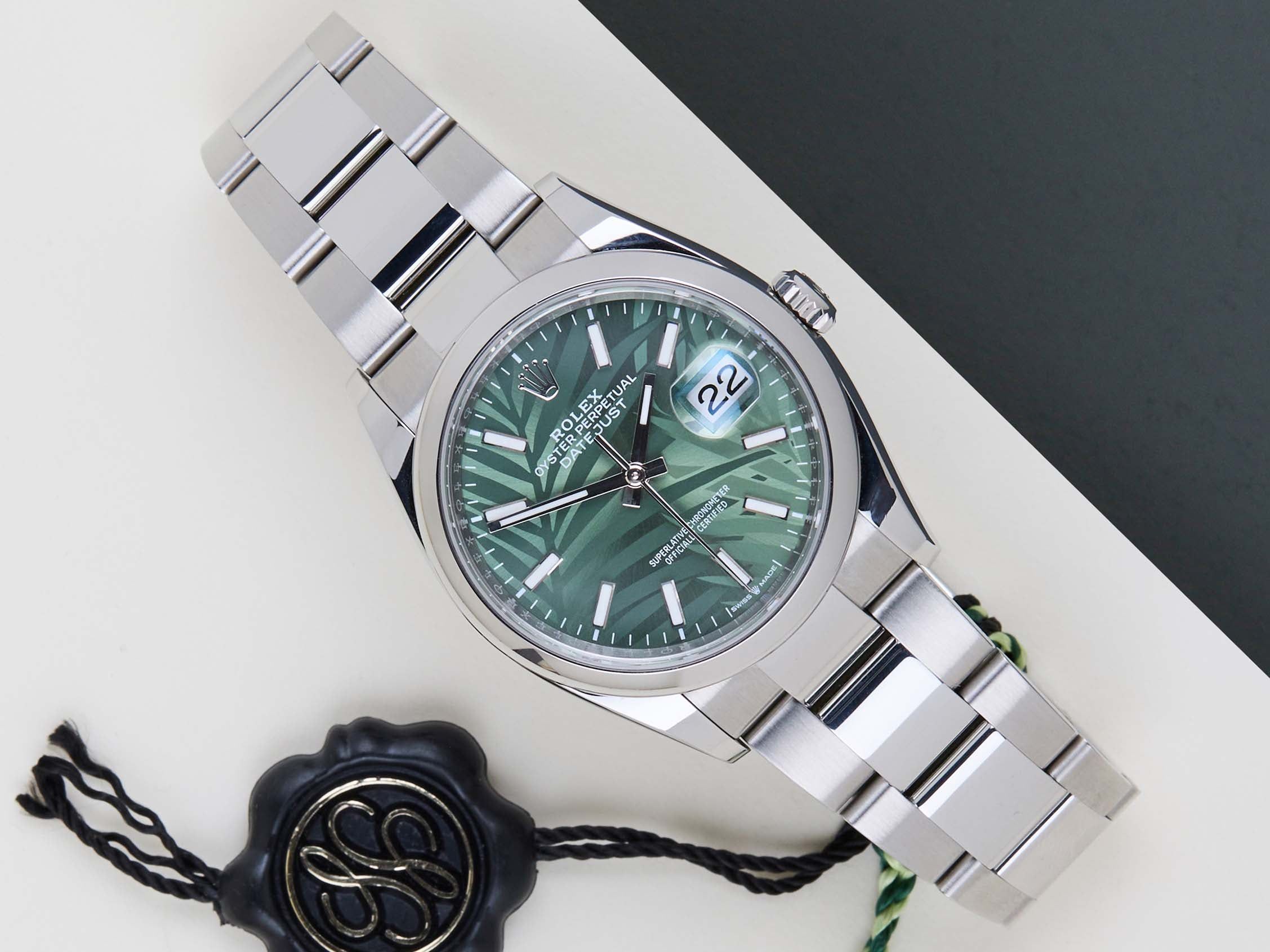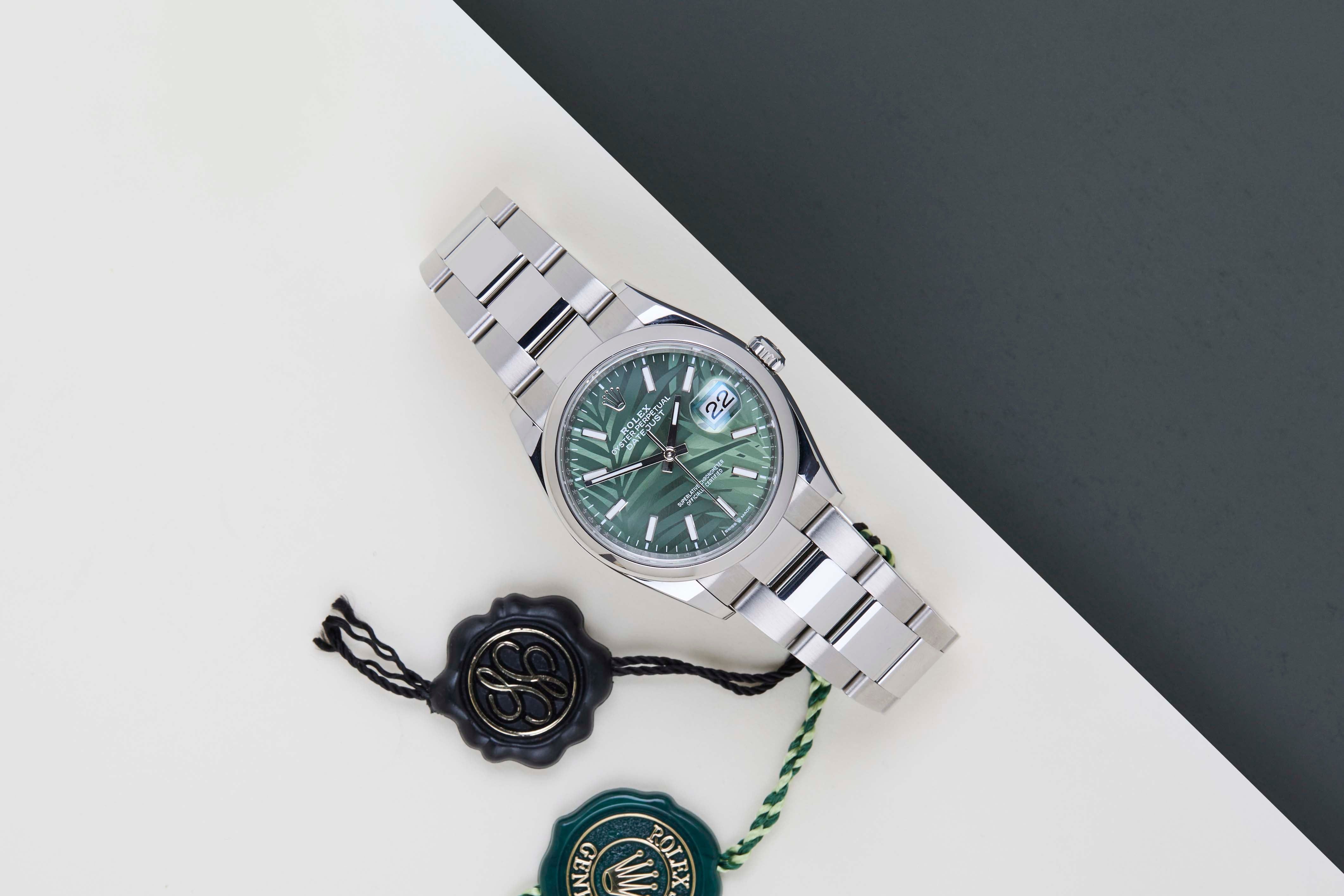 Full Set | International Rolex Warranty Until November 2028Rolex introduced the original Datejust in 1945 to celebrate the company's 40th anniversary. Due to the various case sizes and materials, the Datejust has been ingrained in Rolex's history and remains incredibly popular for 75 years.This Rolex Datejust 'Green Palm Motif Dial - Oyster' was sold for the first time in November 2023. This Datejust is made of stainless steel and is fitted with a Oyster Bracelet, which is equipped with the Easylink. This extension, allows the wearer to either extend or shorten the bracelet by 5 millimetres, improving the wearability and usability of the watch.This Rolex Datejust 36 is in Mint condition and comes with the original Rolex Warranty Card and Box. Furthermore, the watch still has worldwide Rolex Warranty until November 2028.
