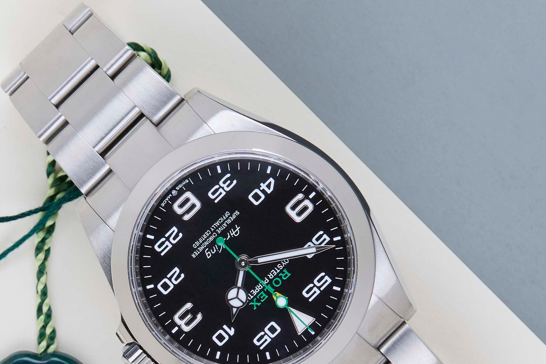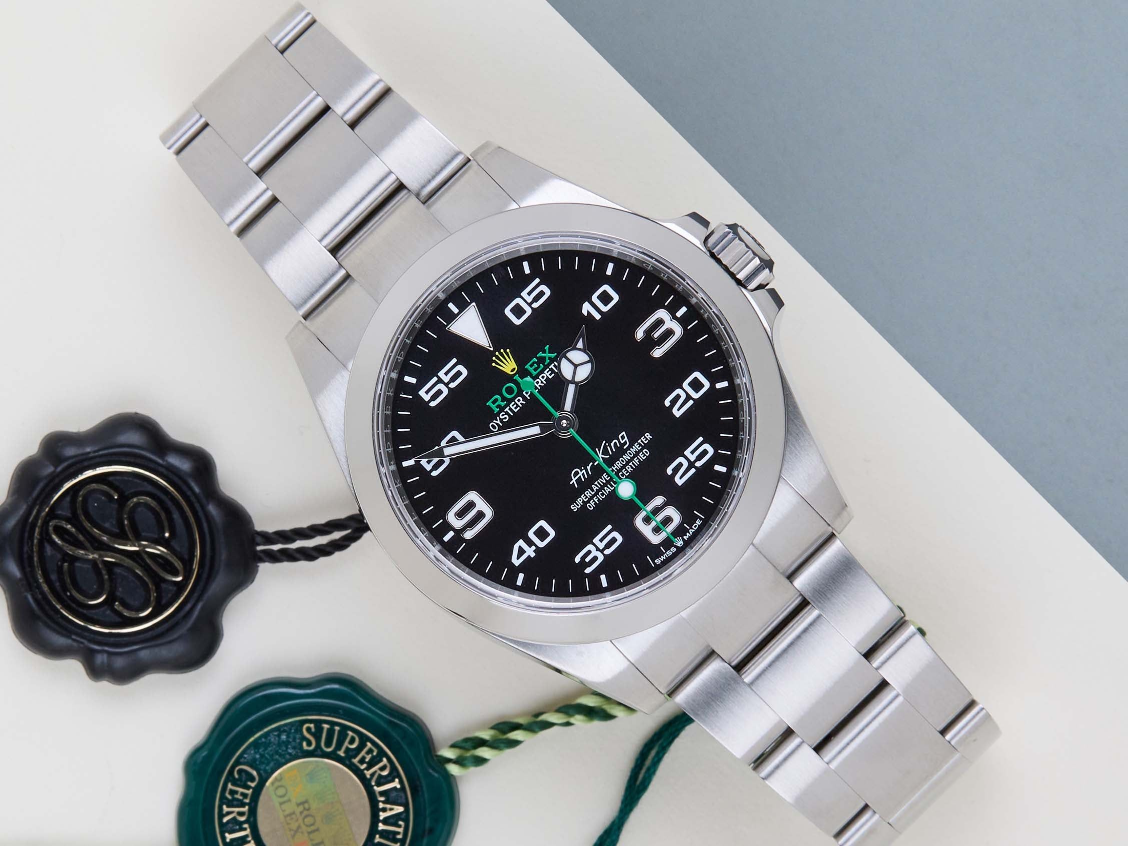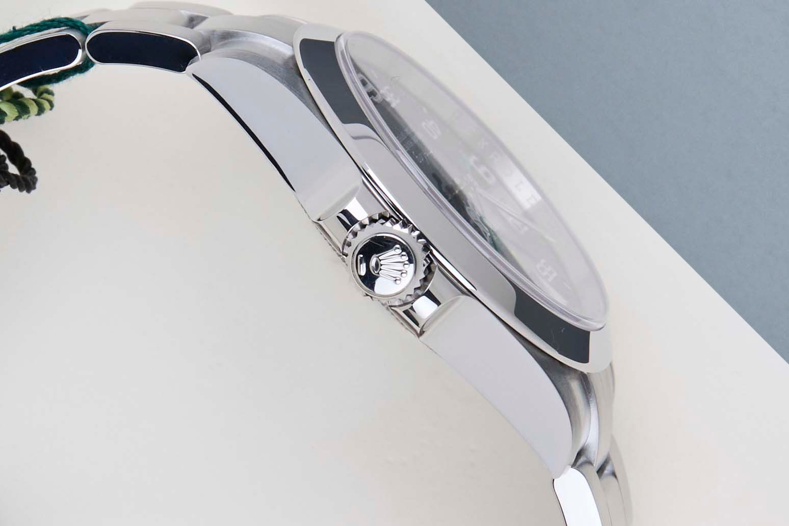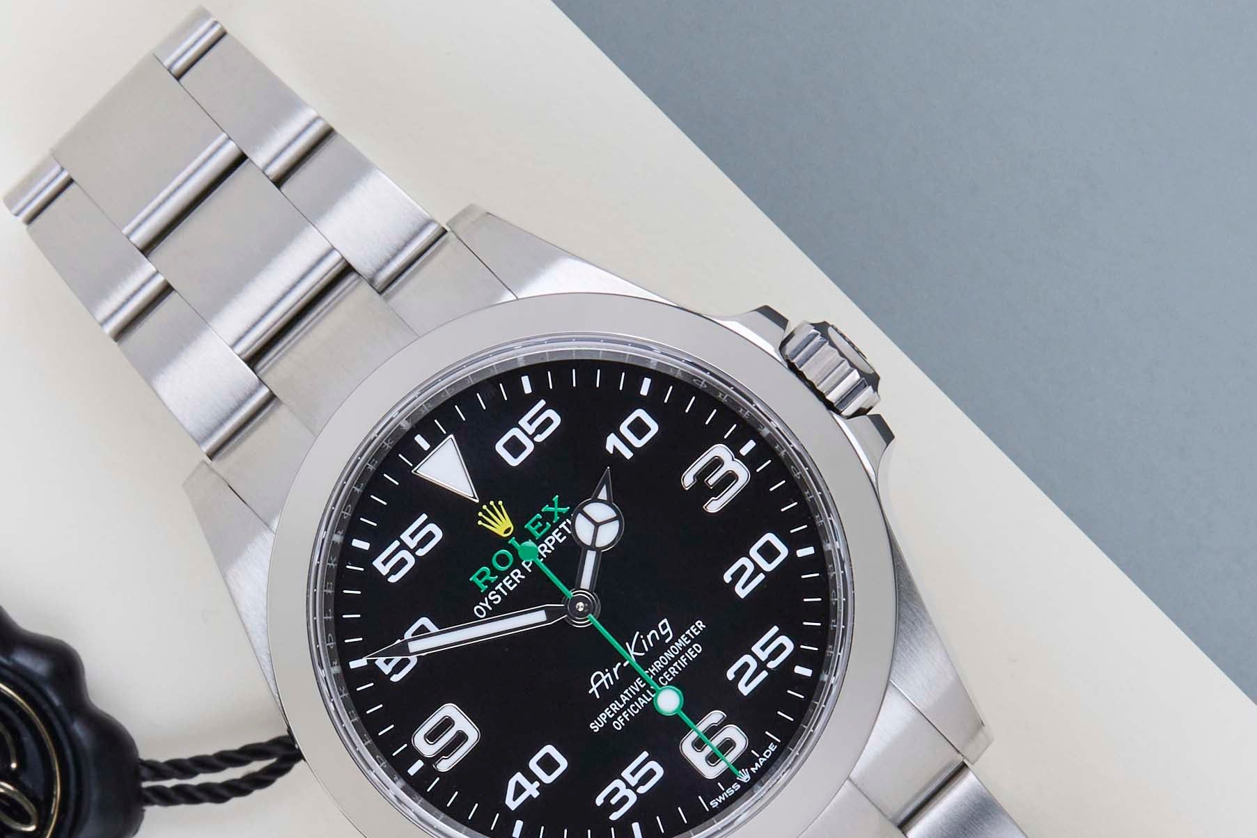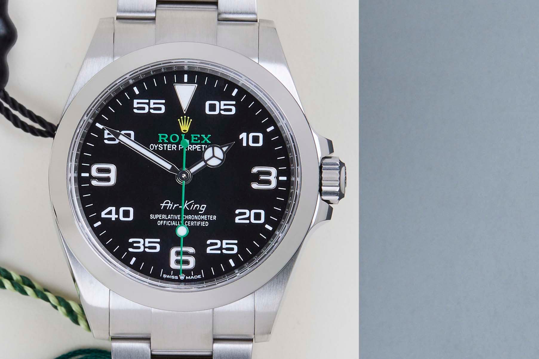 Full Set | International Rolex Warranty Until August 2029 | Including Rolex White TagThe Rolex Air-King was first introduced in the 1940s. It is named after the British Royal Air Force, which used Rolex watches as standard issue for its pilots during World War II.This Rolex Air-King was sold for the first time in August 2024.This Air-King is made of stainless steel and is fitted with an Oyster Bracelet, which is equipped with the Easylink. This extension, allows the wearer to either extend or shorten the bracelet by 5 millimeters, improving the wearability and usability of the watch.This Stunning Rolex Air-King is in Mint Condition and comes with the original Rolex Warranty Card and Box. Furthermore, the watch still has international Rolex warranty until August 2029.