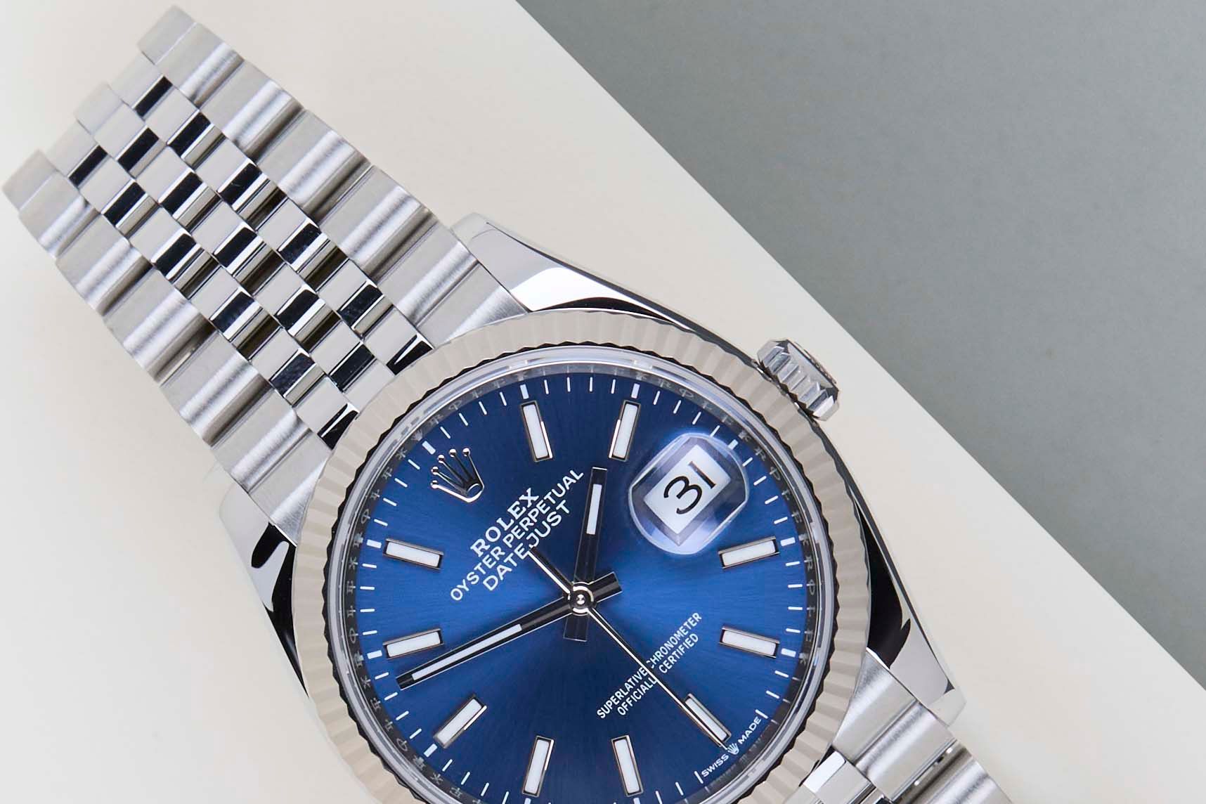 Full Set | International Rolex Warranty Until July 2026 Rolex introduced the original Datejust in 1945 to celebrate the company's 40th anniversary. Due to the various case sizes and materials, the Datejust has been ingrained in Rolex's history and remains incredibly popular for nearly 80 years.This Rolex Datejust 'Blue Dial - Jubilee' was sold for the first time in July 2021.This Datejust is made of a combination of 18k White Gold and stainless steel and is fitted with a Jubilee bracelet which is equipped with the Easylink. This extension, allows the wearer to either extend or shorten the bracelet by 5 millimeters, improving the wearability and usability of the watch.This Rolex Datejust 36 is in Mint condition and comes with the original Rolex Warranty Card & Box. Furthermore, the watch has been serviced by our watchmakers and therefore has One Year of Steiner Warranty.