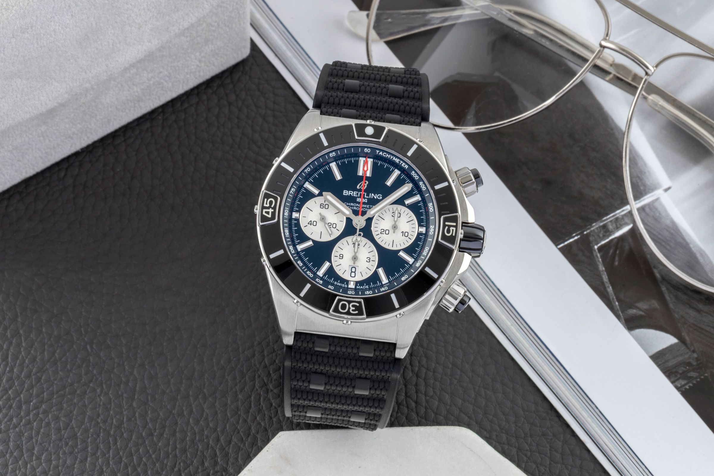 Alternative title: Breitling AB0136251B1S1 Super Chronomat B01 44 Stainless Steel / Black / Rubber; Breitling Super Chronomat B01 44 Chronograph Automatik Ref. AB0136251B1S1 B&P [2600258]