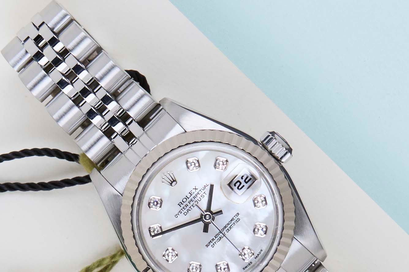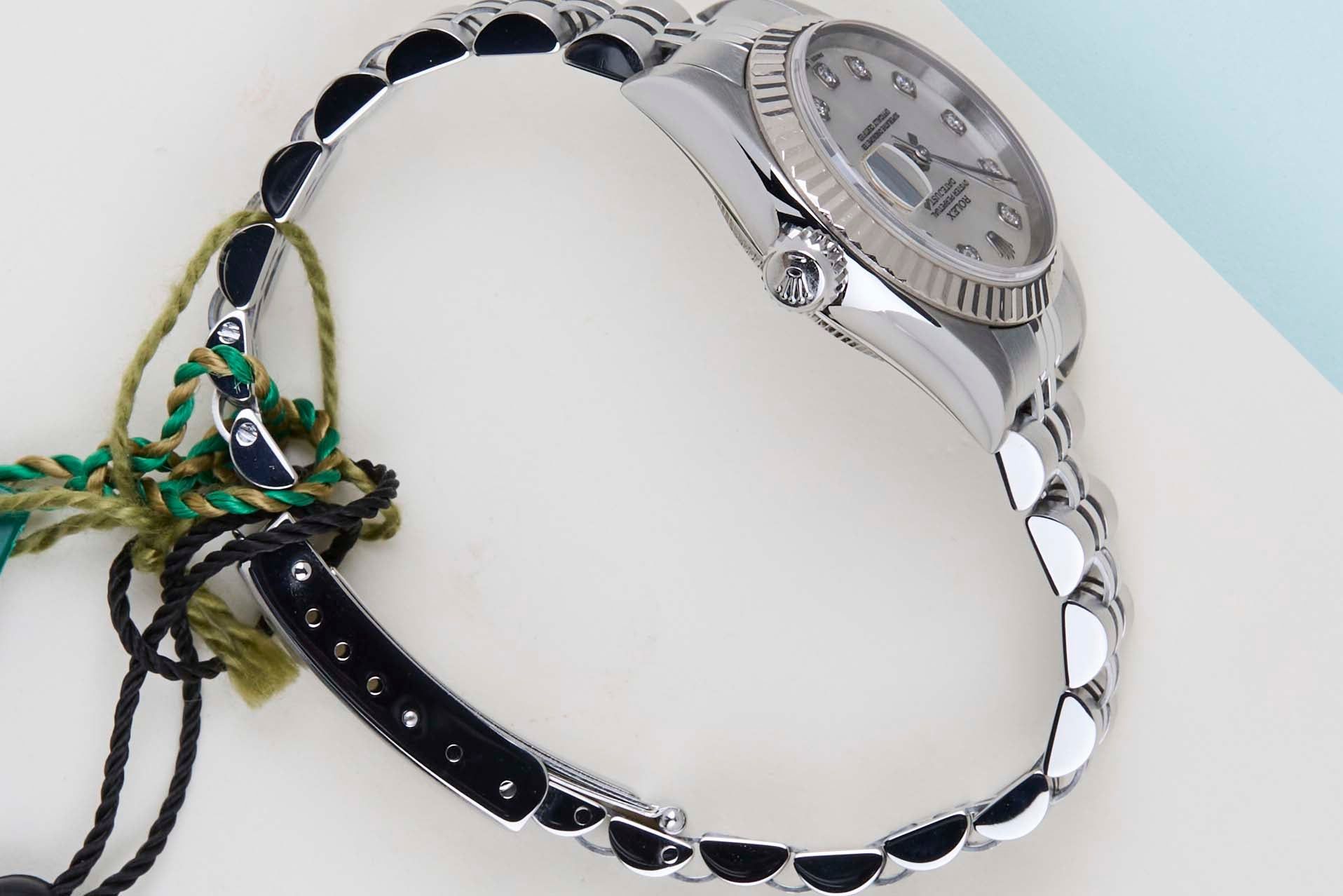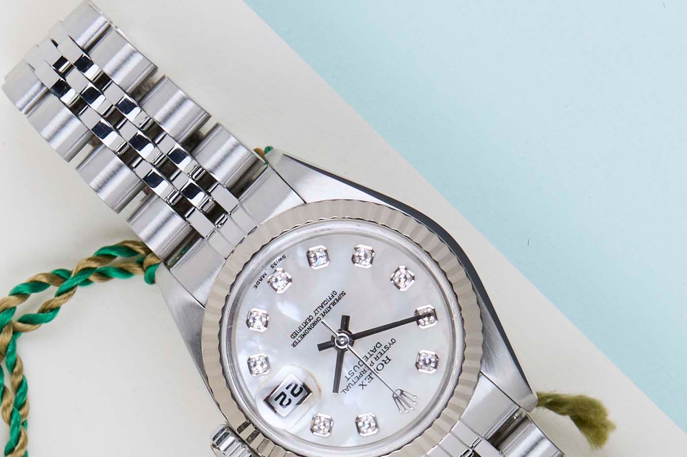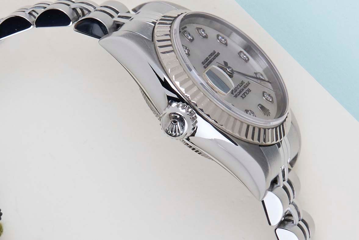 Full Set | Rolex Green Tag IncludedRolex introduced the original Datejust in 1945 to celebrate the company's 40th anniversary. Due to the enormous success, Rolex released the first Lady-Datejust in 1957.This Rolex Datejust 26 'Mother of Pearl Diamond Dial - Jubilee' dates back to September 2000.This Datejust is made of a combination of 18k White Gold and stainless steel and is fitted with a Jubilee bracelet.This Rolex Datejust 26 is in Mint condition and comes with the original Rolex Warranty Card and box. Furthermore, the watch has been serviced by our watchmakers and therefore it comes with One year of Steiner Warranty.