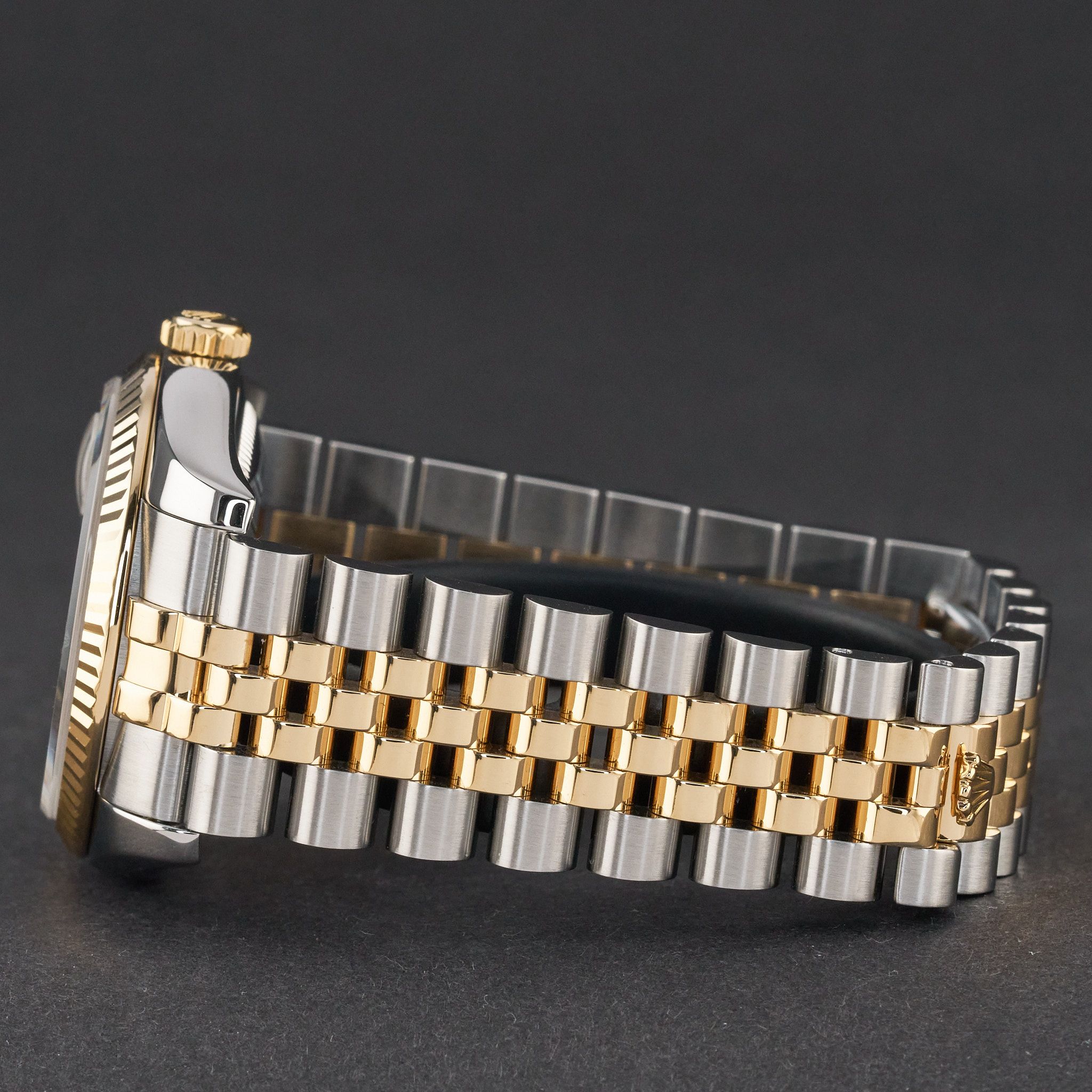 Este Rolex Datejust 116233 cuenta con una esfera de diamantes en color plata jubileo y está fabricado en oro amarillo de 18K y acero inoxidable, con un año de producción de 2004.
