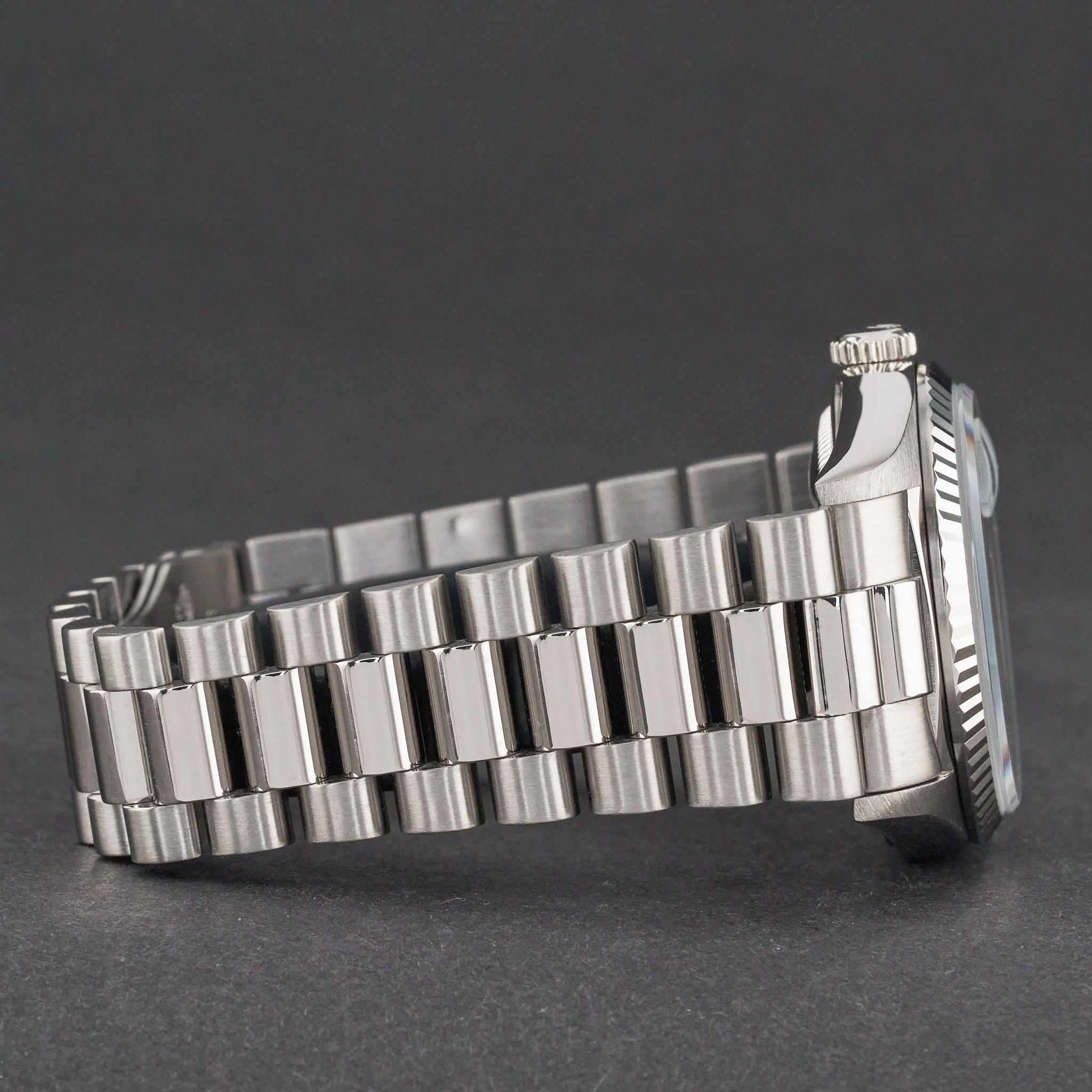 Este Rolex Day-Date 18239 presenta una esfera de diamantes pequeños con un degradado verde y está fabricado en oro blanco de 18K, con un año de producción de 1991.