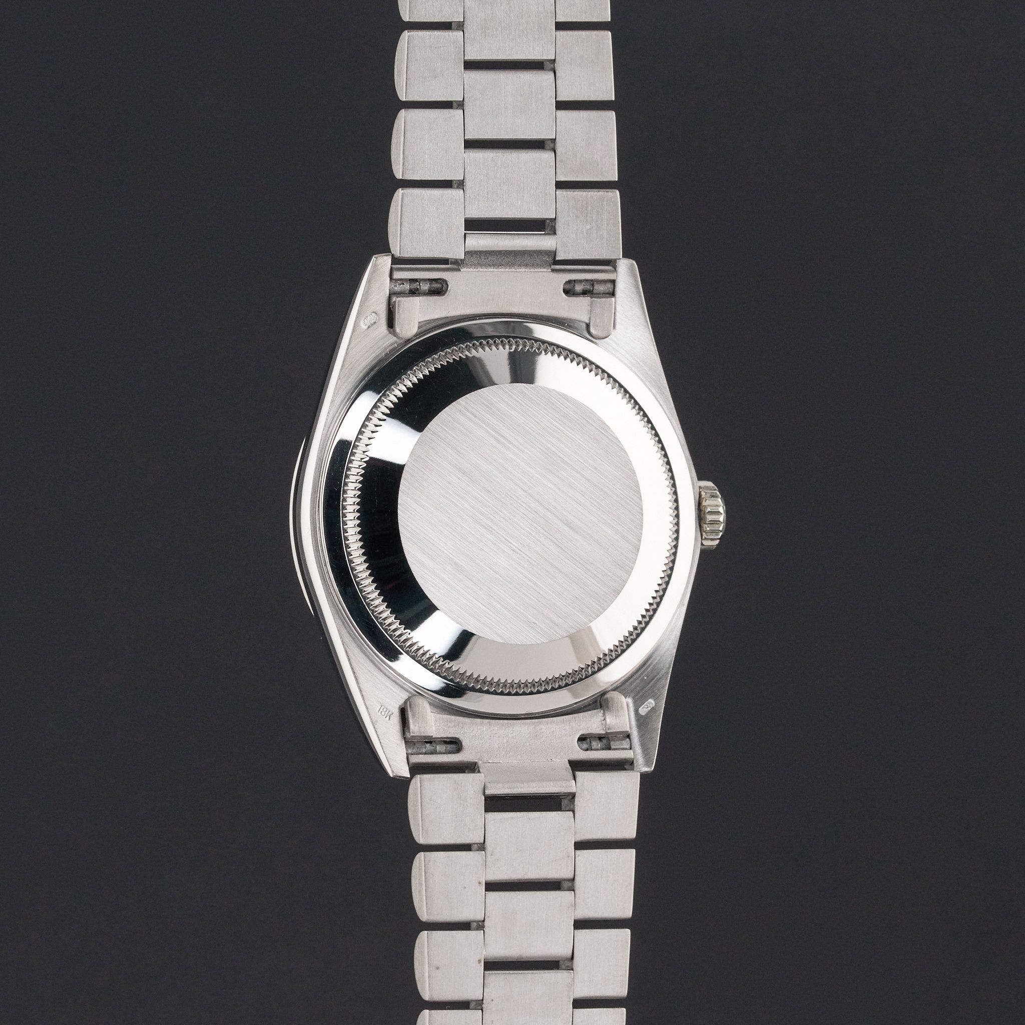 This Rolex Day-Date 18239 features a Green vignette small diamond dial and is crafted from 18K white gold, with a production year of 1991.Case No: X25XXXX