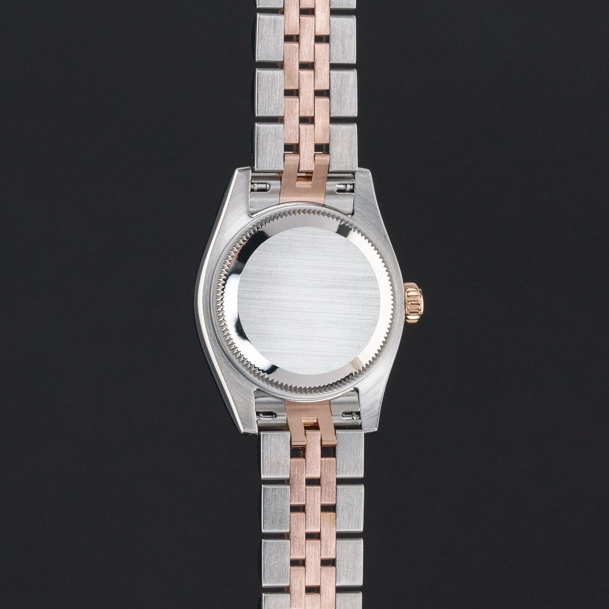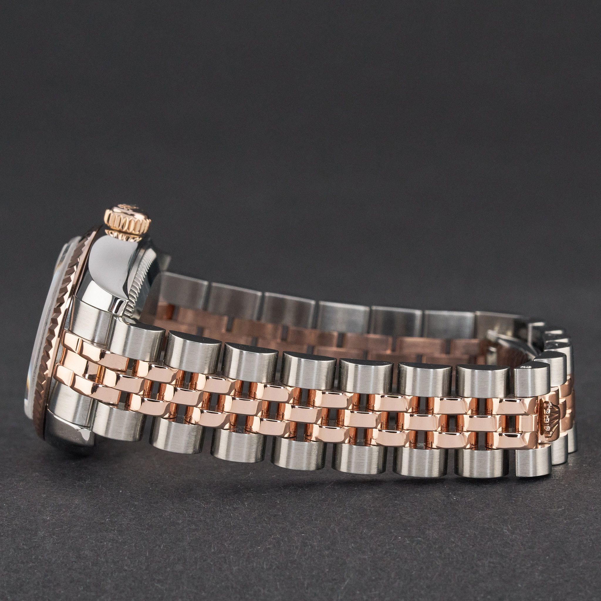 Este Rolex Lady-Datejust 179171 cuenta con una esfera de diamantes en color plata jubileo y está fabricado en oro rosa de 18K y acero inoxidable, con un año de producción de 2013.