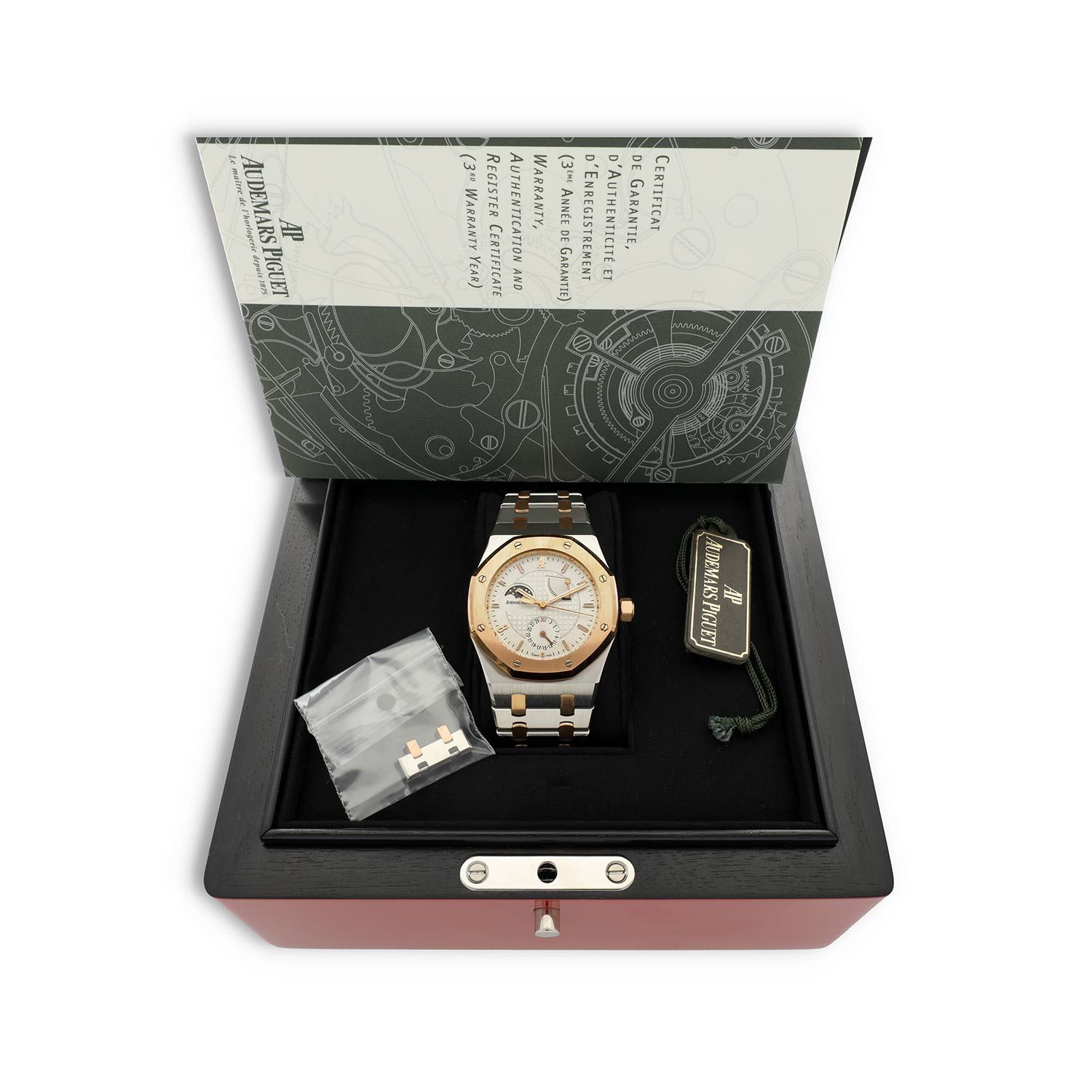 Este ejemplar en particular data de 2011 y se ofrece en condición sin usar. El reloj viene como un conjunto completo, incluyendo la caja original, papeles y accesorios acompañantes. Conservado en condiciones excepcionales, representa una rara oportunidad de adquirir un clásico Royal Oak que nunca ha sido usado, lo que lo hace especialmente atractivo para coleccionistas y entusiastas por igual.