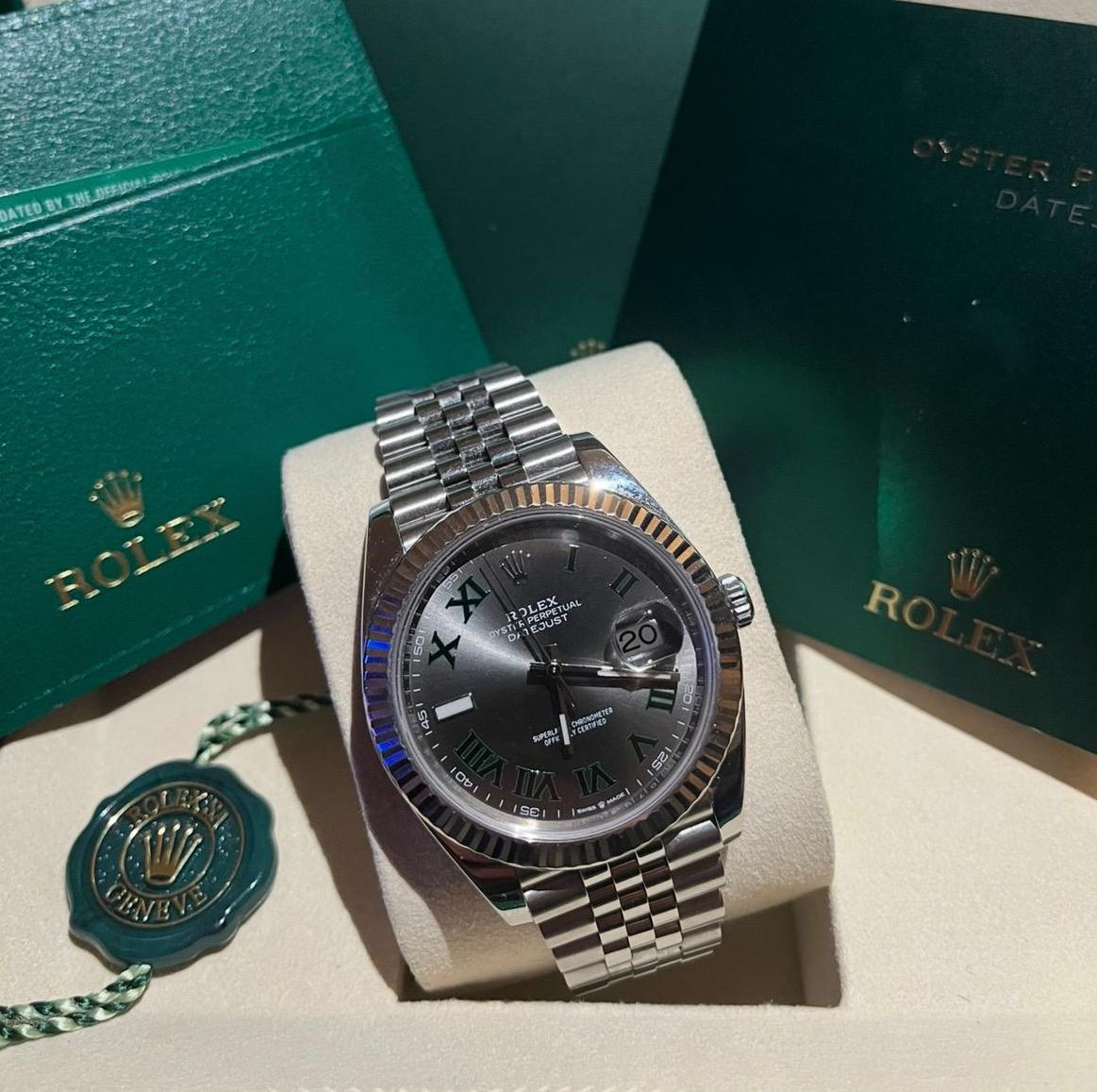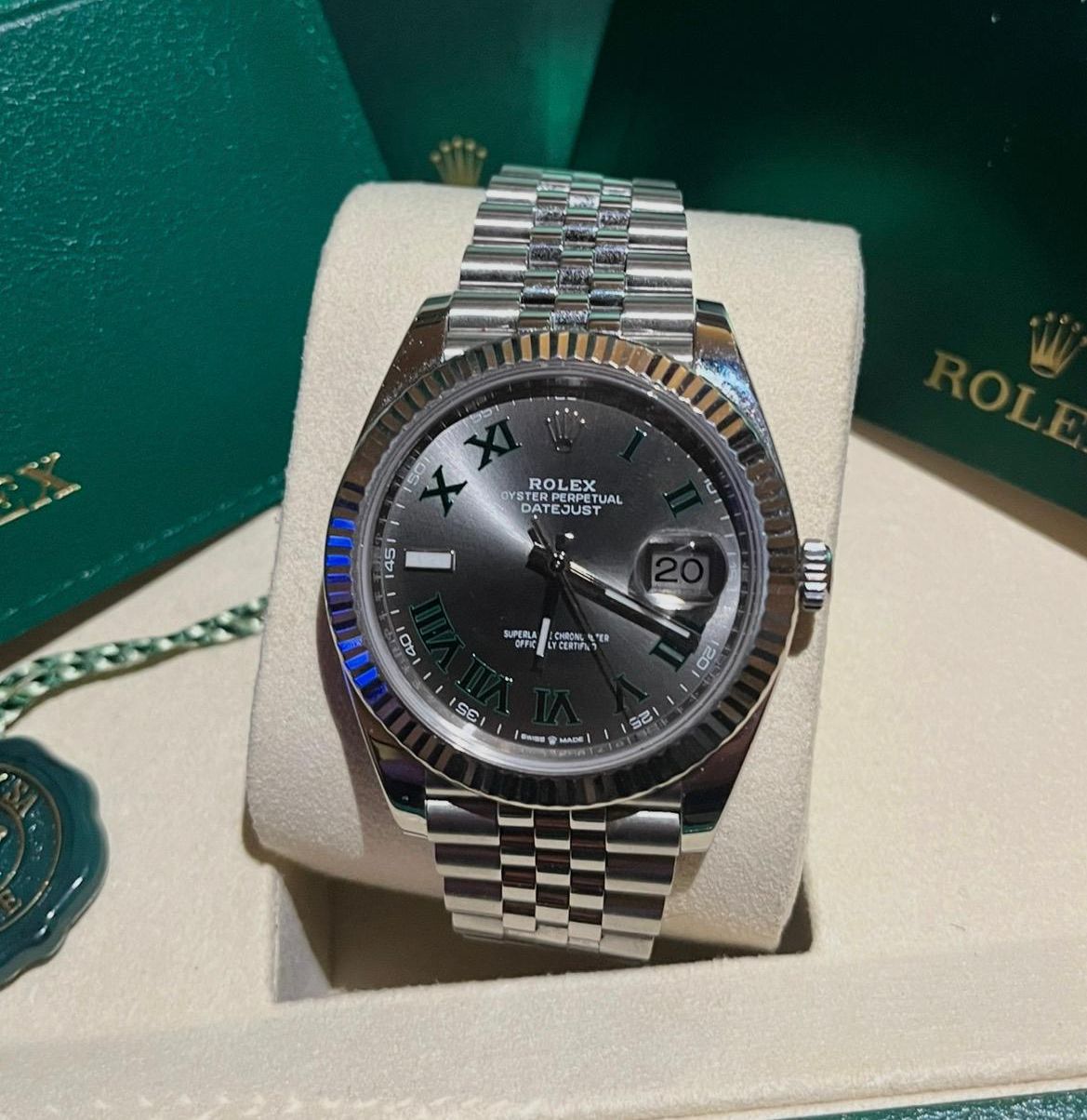 Este impresionante Rolex Datejust 41 ref. 126334 se presenta en la codiciada configuración de Wimbledon, con la distintiva esfera gris pizarra y números romanos verdes, combinada con la icónica pulsera Jubilee, una de las configuraciones más elegantes y deseables dentro de la colección Datejust.