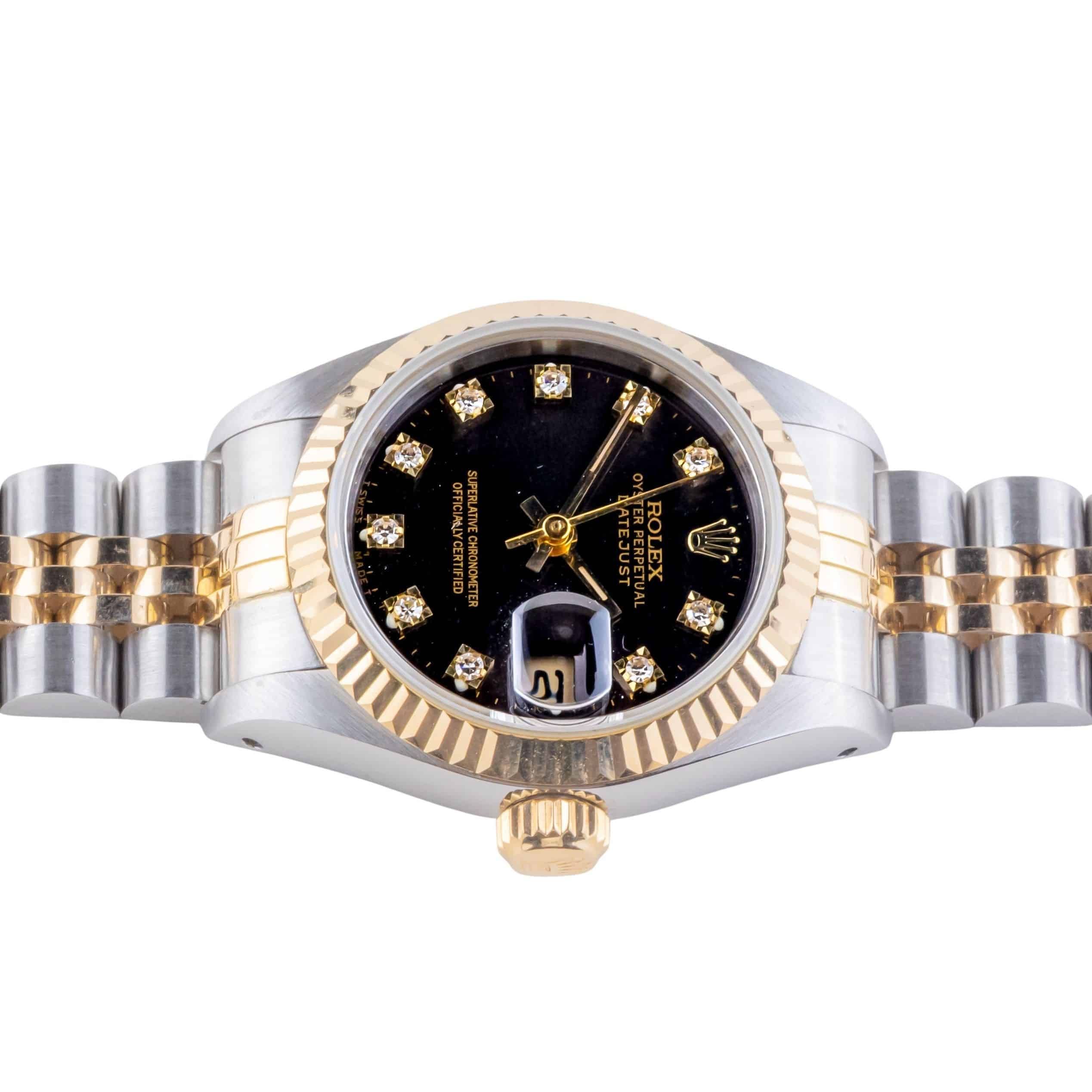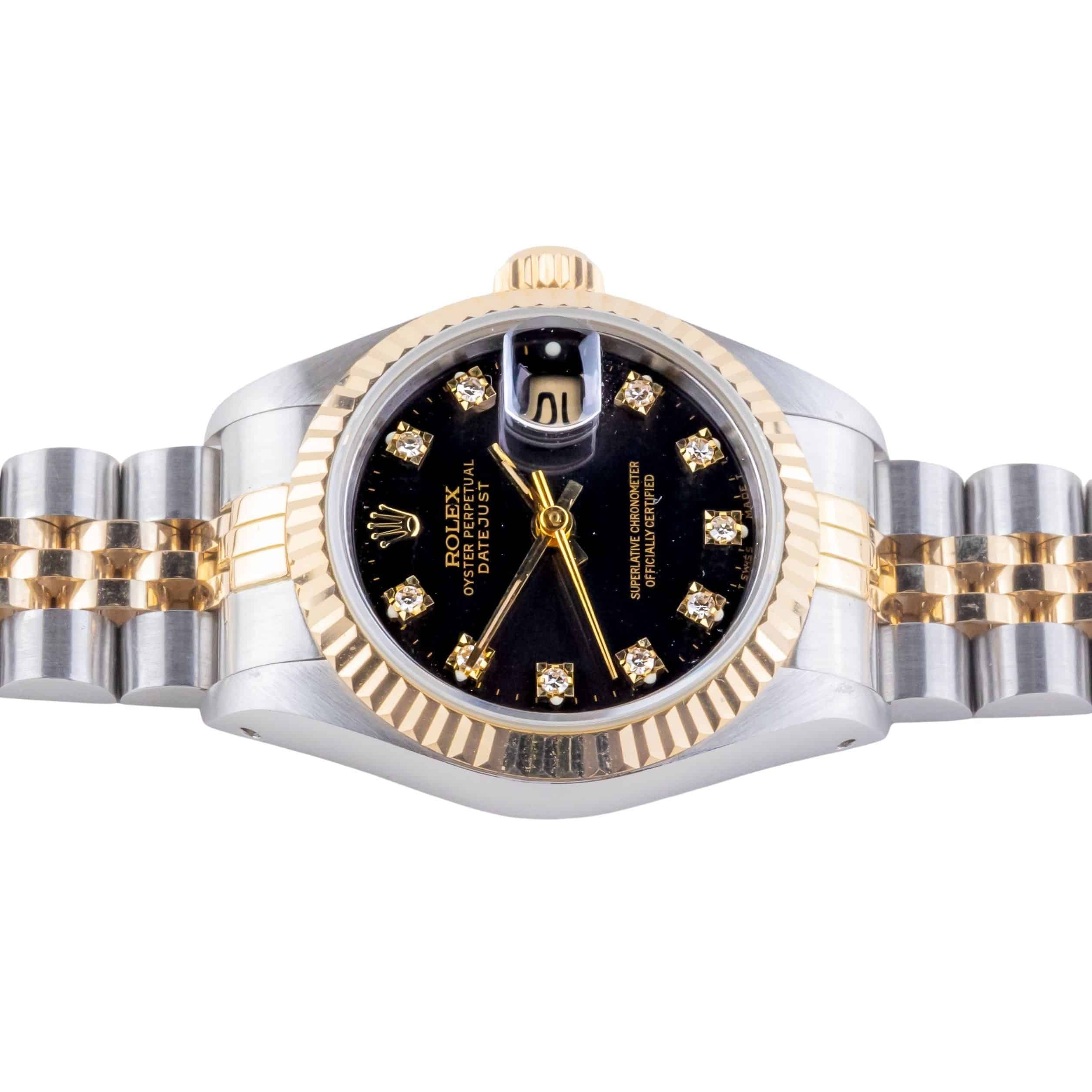 Rolex Oyster Perpetual Lady-Datejust referencia 69173 de 1991, incluyendo set completo. La Lady-Datejust 69173 tiene una caja de 26 mm en oro y acero inoxidable, pulsera jubilee bicolor y bisel estriado de oro de 14k. Esta Lady-Datejust 69173 cuenta con un movimiento automático calibre 2135 con función de fecha rápida, un cristal de zafiro resistente a los arañazos y una esfera negra con índices de diamante.