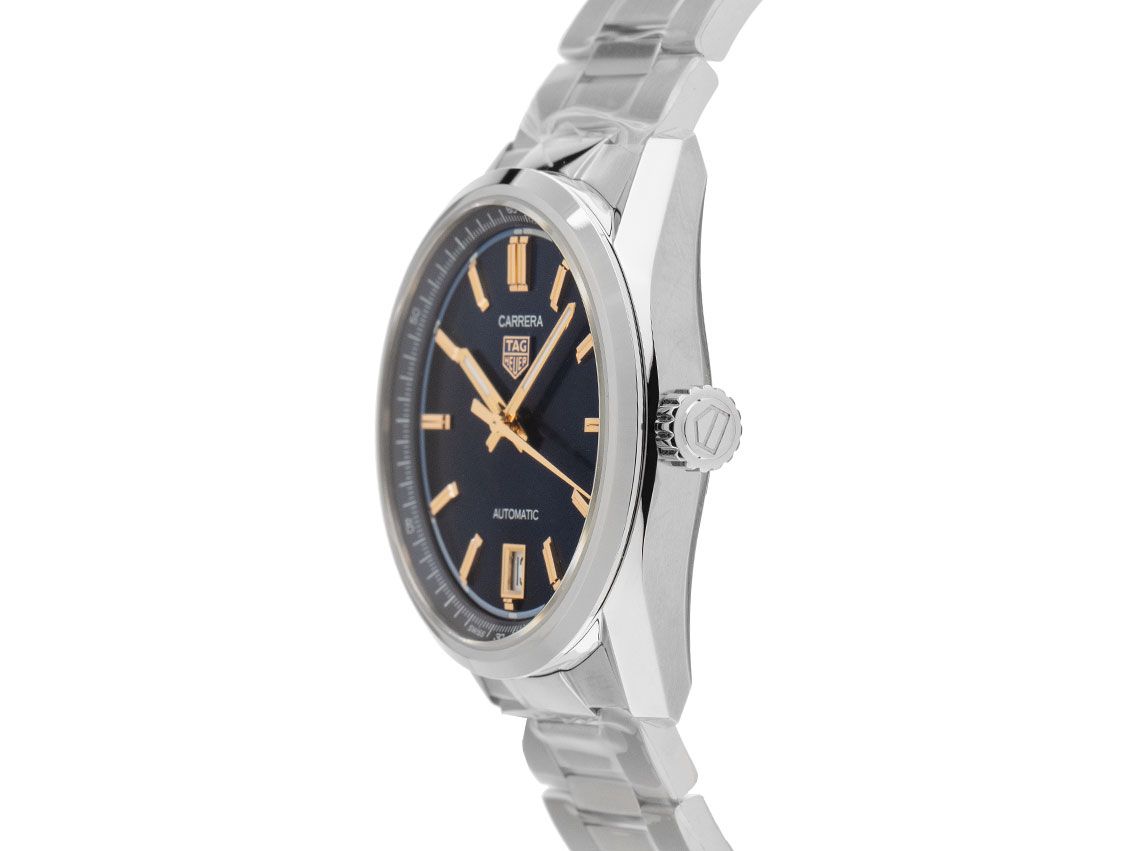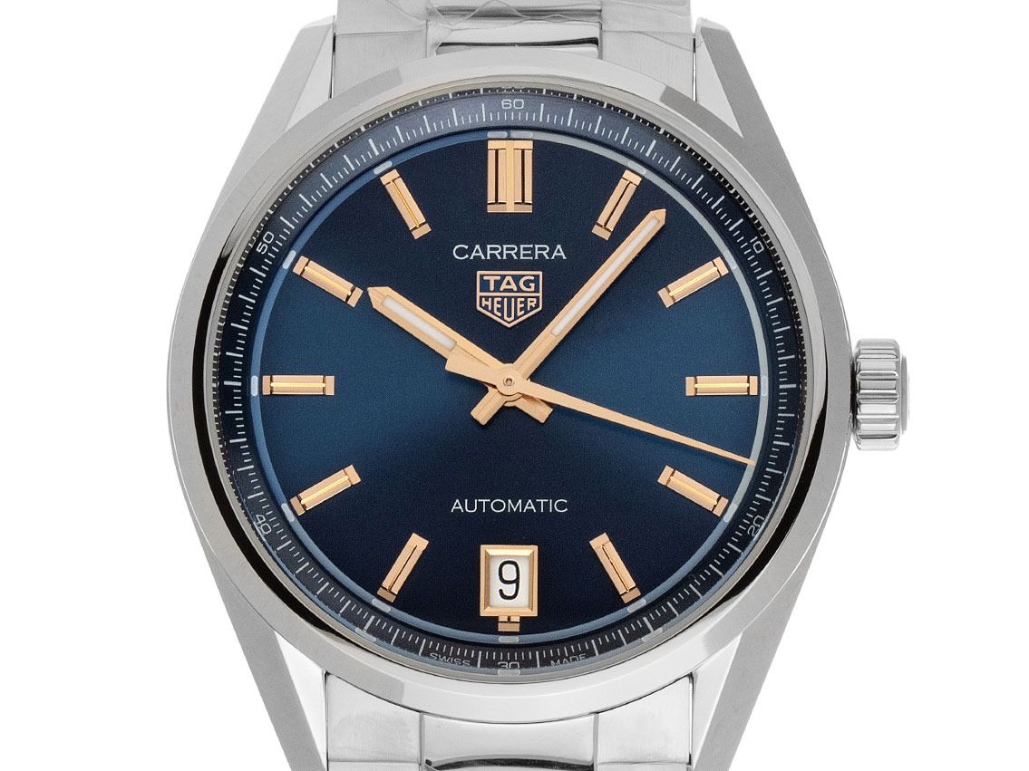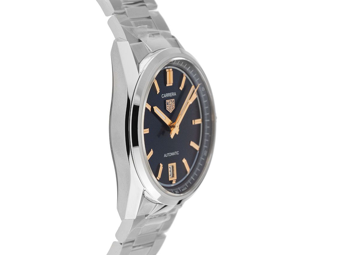 Tag Heuer Carrera Date Stahl Automatik Armband StahlGehäuse Edelstahl poliert und satiniert, Gehäusedurchmesser ohne Krone 36mm, Gehäusehöhe 10,2mm. Lünette Edelstahl glatt und poliert. Armband Edelstahl poliert und satiniert, Sicherheitsfaltschließe Edelstahl mit Hersteller-Logo. Zifferblatt blau mit aufgesetzten roségoldenen Indexen und roségoldenen Leuchtzeigern. Uhrwerk Automatik, Tag Heuer Calibre 7 mit 25 Edelsteinen, Gangreserve ca. 50 Stunden. Anzeige von Stunde, Minute und Sekunde über Zeiger aus der Mitte mit Sekundenstopp zur sekundengenauen Einstellung der Uhrzeit, Datumsanzeige mit Schnellverstellung bei 6 Uhr. Saphirglas kratzfest und gewölbt. Krone mit Hersteller-Logo. Boden Edelstahl verschraubt und graviert mit Saphirglas Sichtfenster. Gewicht der Uhr inklusive Armband 112g, Länge des Armbandes inklusive Gehäuse 195mm. Wasserdicht bis 5 ATM. Referenznummer: WBN2311.BA0001, ID: ST116045400226H-3700, Artikelnummer: 10000084829. Original Tag Heuer Box mit Umkarton und Garantie Papiere von 2026 sowie Beschreibung, Full Set. Ungetragen. Lieferzeit sofort.