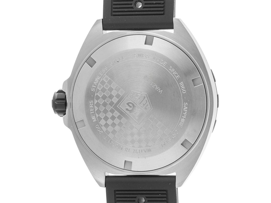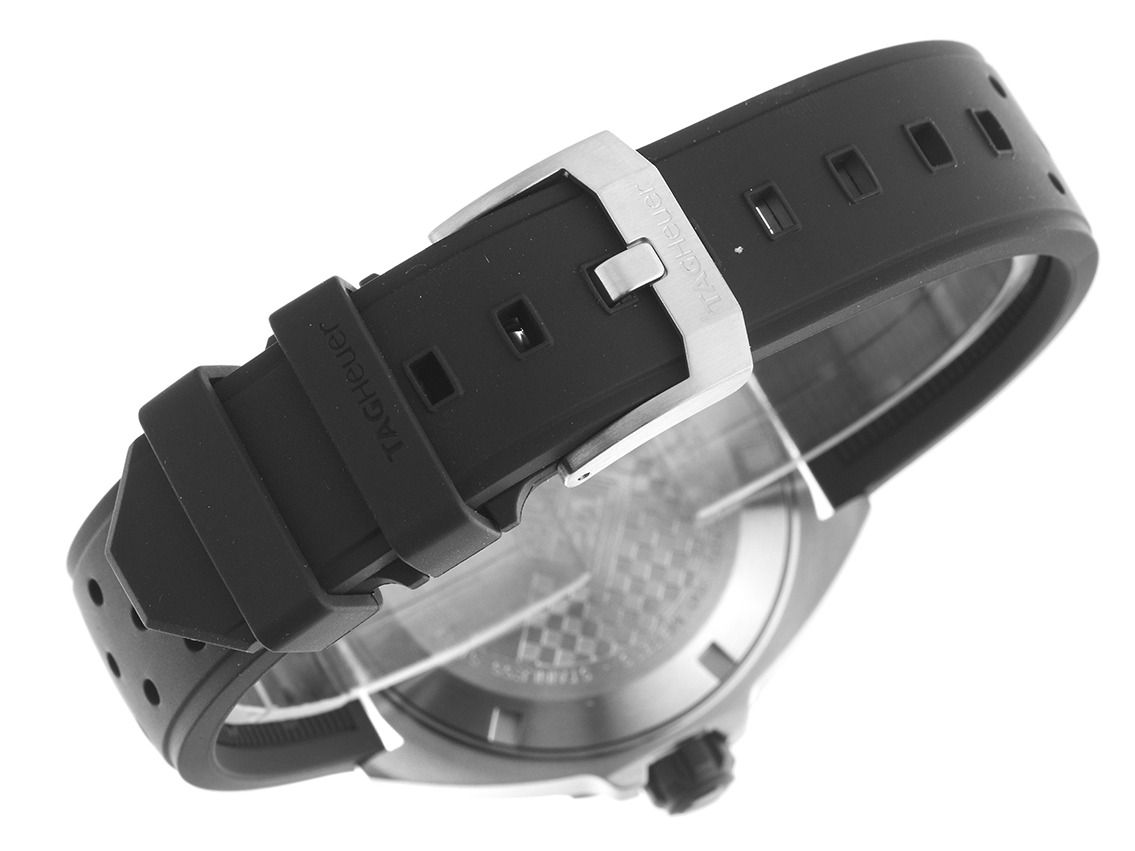 Caja de acero inoxidable satinada. Diámetro de la caja sin corona 41mm, altura de la caja 11,8mm. Bisagra de acero inoxidable PVD negra mate, con escala de 60 minutos, unidireccional. Pulsera de caucho negra, ancho de asas 20mm, hebilla de acero inoxidable con logo del fabricante. Esfera negra con índices luminosos de acero inoxidable y agujas luminosas de acero inoxidable. Movimiento de cuarzo. Indicador de hora, minuto y segundo a través de agujas centrales con parada de segundos para un ajuste preciso de la hora, indicador de fecha con ajuste rápido a las 3 en punto. Cristal de zafiro resistente a los arañazos. Corona atornillada con protección lateral y logo del fabricante. Fondo de acero inoxidable atornillado y grabado con relieve de Tag Heuer. Peso del reloj incluyendo la pulsera 95g. Resistente al agua hasta 20 ATM. Número de referencia: WAZ1110.FT8023, D: ST116021700226H-1850, número de artículo: 10000084832. Caja original de Tag Heuer con caja exterior y documentos de garantía de 2026, Full Set. Sin usar. Tiempo de entrega inmediato.