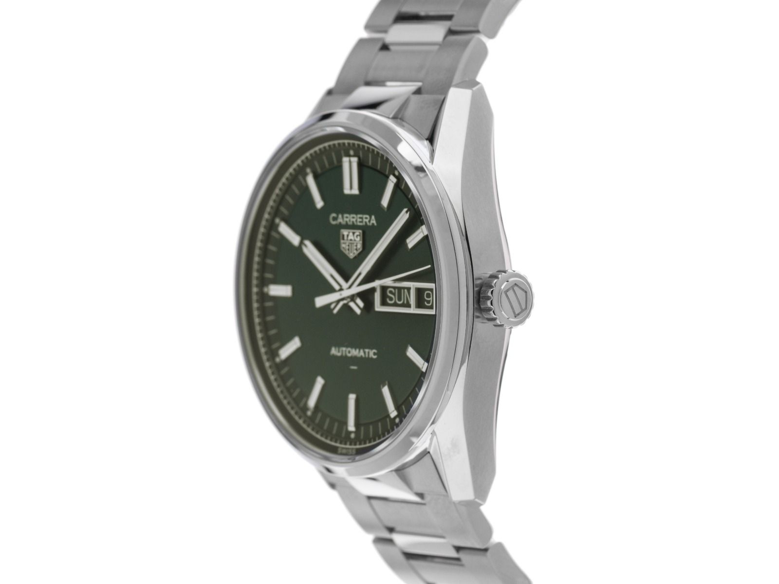 Tag Heuer Carrera Day Date Stahl Automatik Armband StahlGehäuse Edelstahl poliert und satiniert, Gehäusedurchmesser ohne Krone 41mm, Gehäusehöhe 12,6mm. Lünette Edelstahl glatt und poliert. Armband Edelstahl poliert und satiniert, Sicherheitsfaltschließe Edelstahl mit Hersteller-Logo. Zifferblatt grün mit aufgesetzten Edelstahl Indexen und Edelstahl Leuchtzeigern. Uhrwerk Automatik, Tag Heuer Kaliber TH31-02 mit 30 Edelsteinen, Gangreserve ca. 80 Stunden. Anzeige von Stunde, Minute und Sekunde über Zeiger aus der Mitte mit Sekundenstopp zur sekundengenauen Einstellung der Uhrzeit, Wochentagsanzeige in Englisch und Französisch sowie Datumsanzeige mit Schnellverstellung bei 3 Uhr. Saphirglas kratzfest und gewölbt. Krone mit Hersteller-Logo. Boden Edelstahl verschraubt und graviert mit Saphirglas Sichtfenster. Gewicht der Uhr inklusive Armband 153g, Länge des Armbandes inklusive Gehäuse 200mm. Wasserdicht bis 10 ATM. Referenznummer: WDA2115.BA0043, ID: ST116055940226H-4450, Artikelnummer: 10000084834. Original Tag Heuer Box mit Umkarton und Garantie Papiere, Full Set. Ungetragen. Lieferzeit sofort.