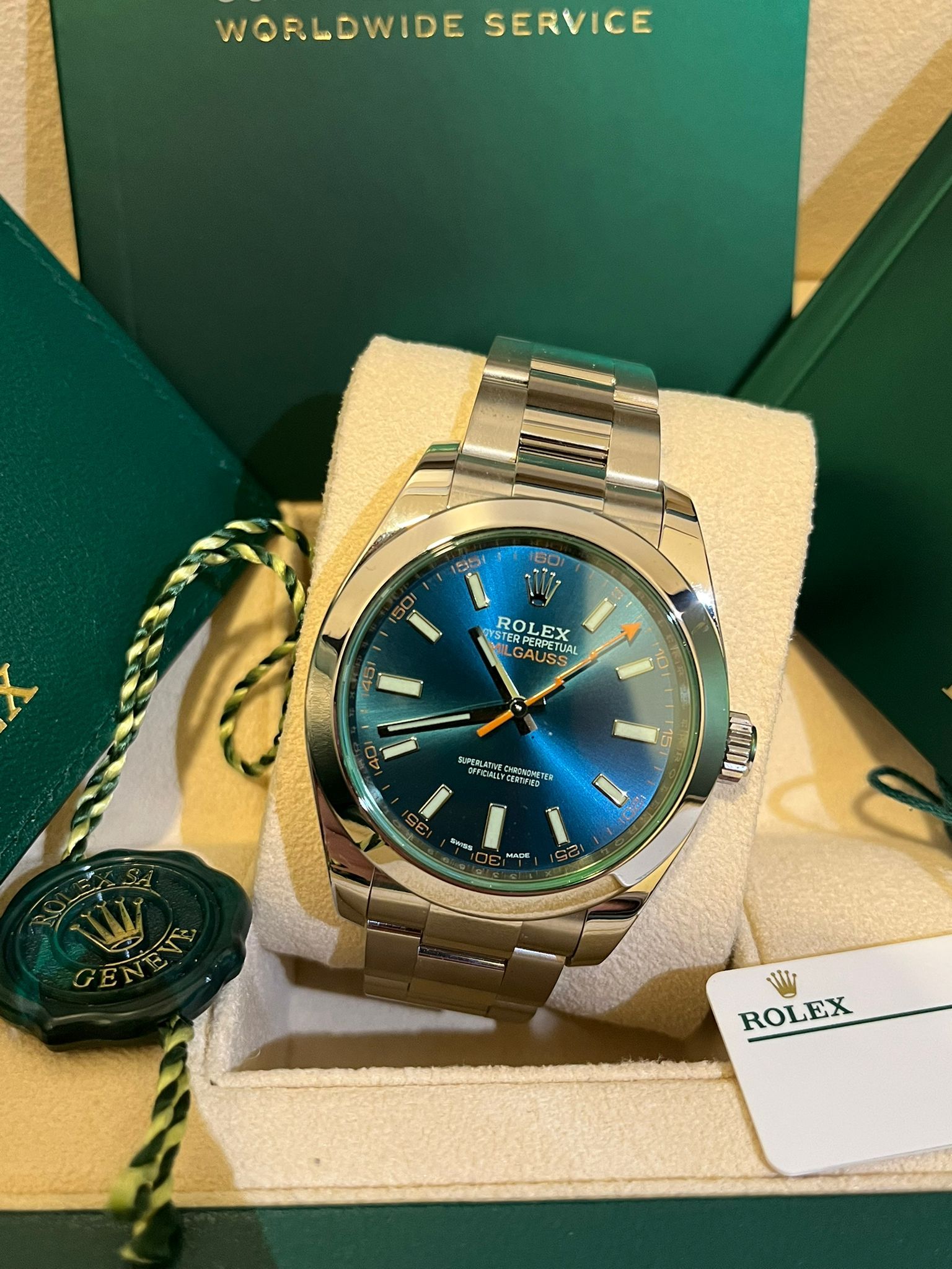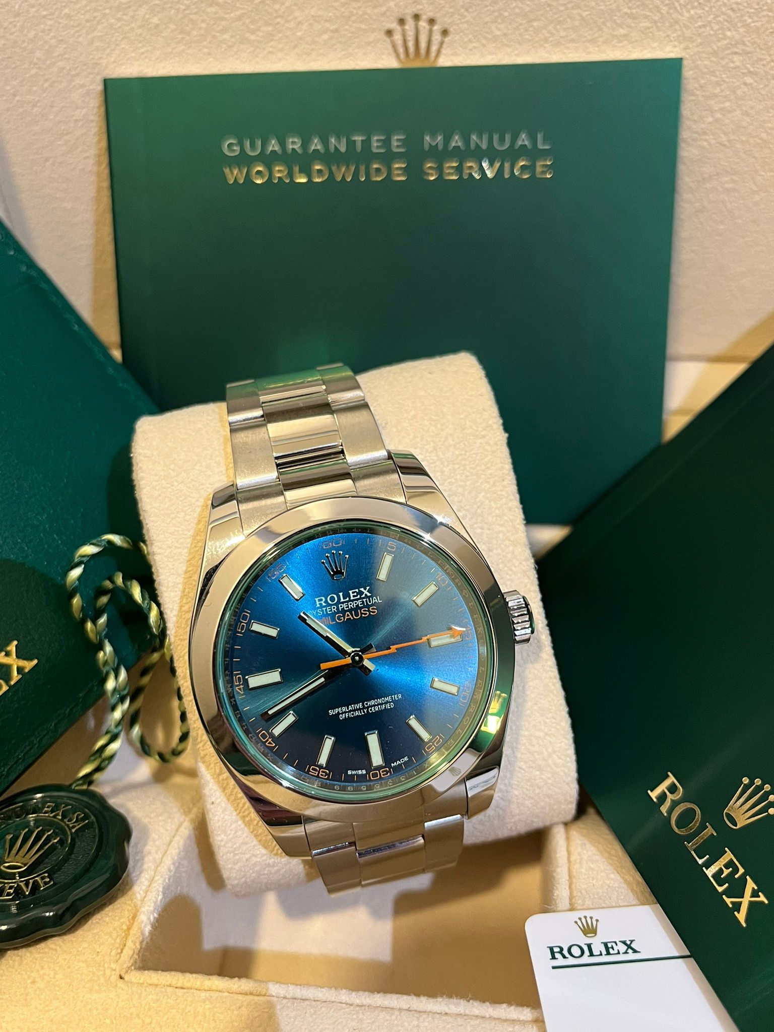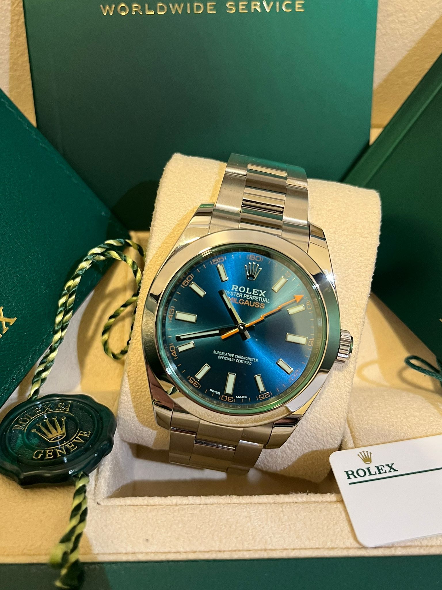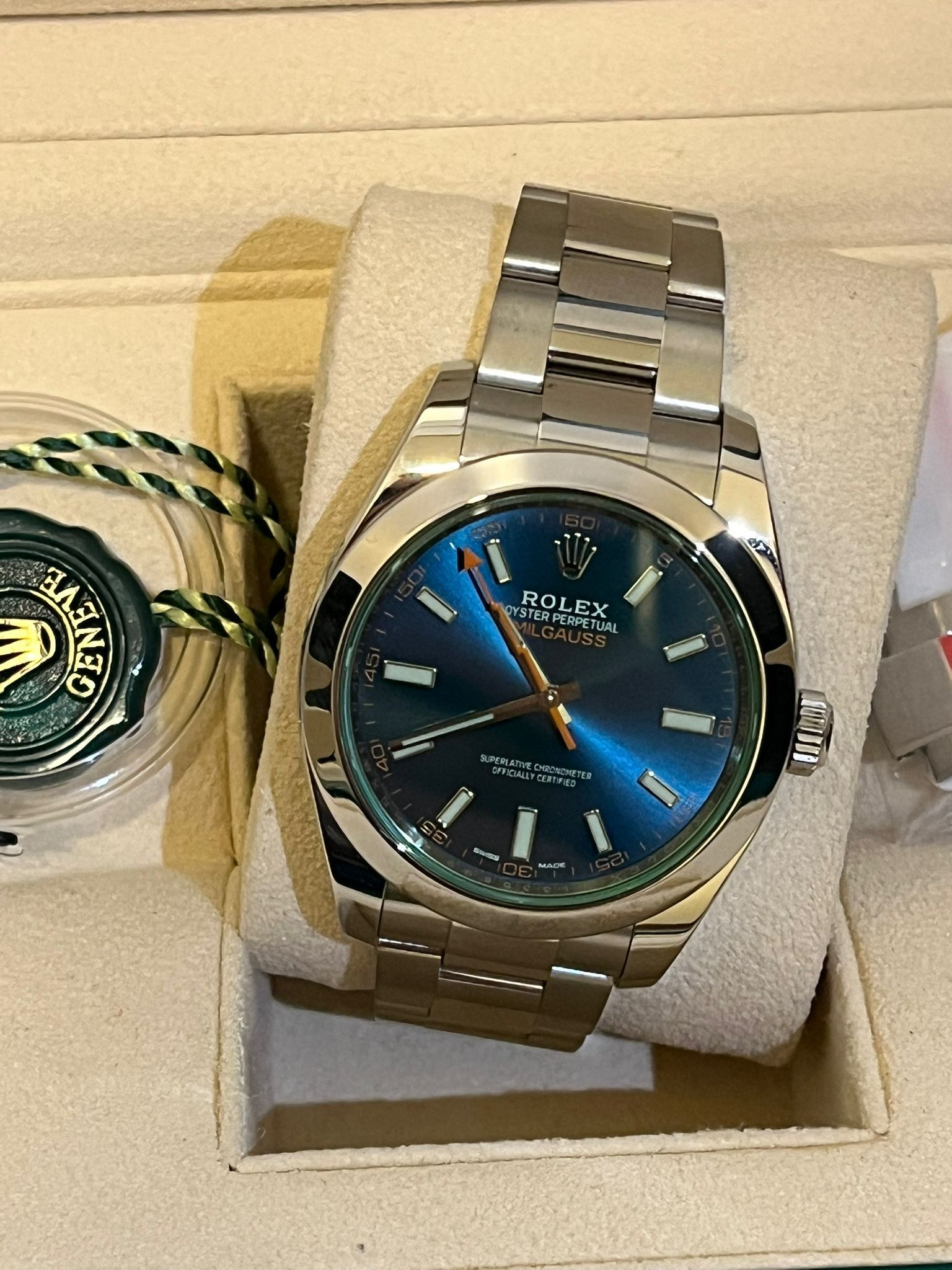 This stunning Rolex Milgauss ref. 116400GV is presented with the iconic green sapphire crystal (Glace Verte) and the distinctive blue dial featuring orange accents and the signature lightning bolt seconds hand—one of the most recognizable and characterful configurations within the Rolex Professional collection. The combination of the 40 mm Oyster case in stainless steel, the smooth polished bezel, and the vibrant details of the Milgauss dial results in a perfectly balanced timepiece that blends technical innovation with bold design.Originally sold in August 2021, this example is in good condition and remains a highly attractive piece for both collectors and daily wearers. The warranty card is dated 2023; this date was added later, which is not uncommon when a specific date is requested. The original sales date, however, is August 2021.