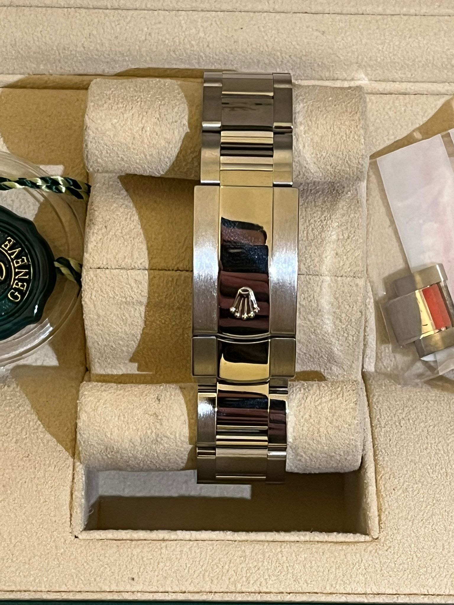 El reloj se entrega como un conjunto completo, incluyendo la caja original de Rolex, tarjeta de garantía, folletos y todos los eslabones originales completos.