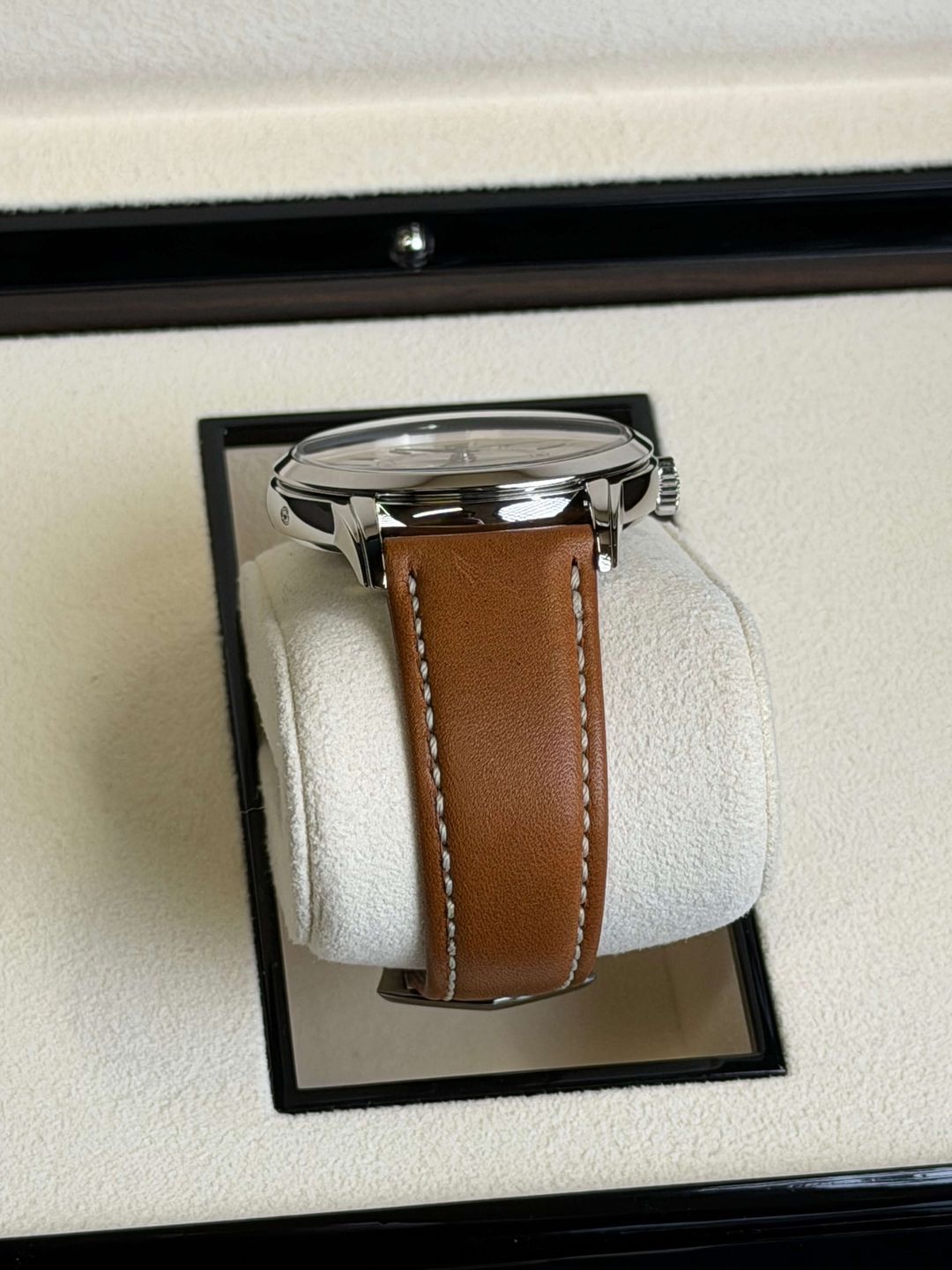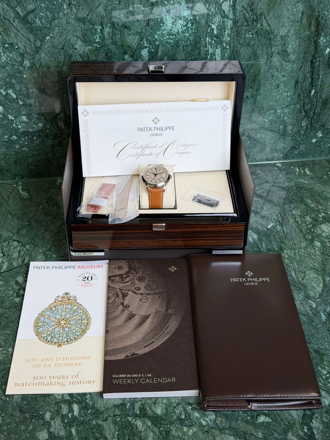 El Patek Philippe Calatrava Weekly Calendar ref. 5212A-001 es una de las versiones modernas de Calatrava más refinadas y originales. Este ejemplar de 2022 se encuentra en estado no usado y se entrega como un set completo con caja original, papeles y accesorios. La caja de acero inoxidable de 40 mm le da a esta Calatrava un aspecto fresco y contemporáneo. Lo que realmente hace especial a este modelo es la exclusiva esfera con tipografía estilo manuscrito, en la que se muestran no solo la fecha, sino también los números de semana y el día de la semana. Una complicación rara y extremadamente práctica que se ha integrado de manera elegante y clara. En su interior alberga el calibre automático 26-330 S C J SE, desarrollado especialmente para este calendario semanal. El movimiento combina refinamiento técnico con los estándares de acabado del Sello Patek Philippe y ofrece aproximadamente 45 horas de reserva de marcha. Una Calatrava excepcionalmente elegante e intelectual, perfecta para el aficionado que desea combinar la elegancia clásica con una complicación distintiva, en esta versión no usada y de set completo, especialmente atractiva para coleccionistas.