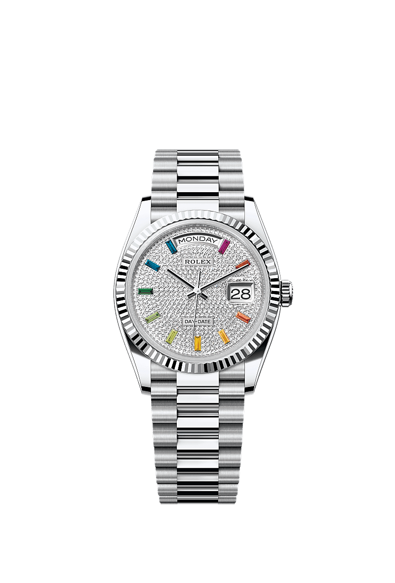 Rolex 128236-0003 Day-Date 36 Platinum - Fluted / Paved - Rainbow / President