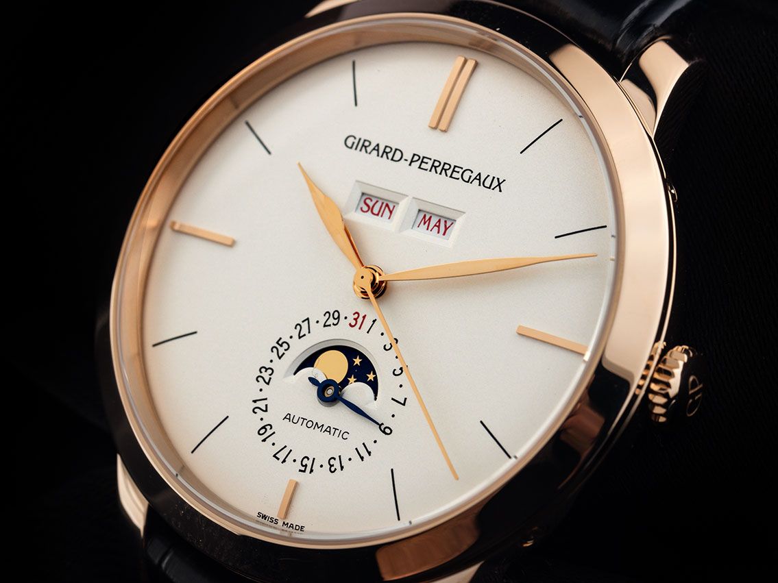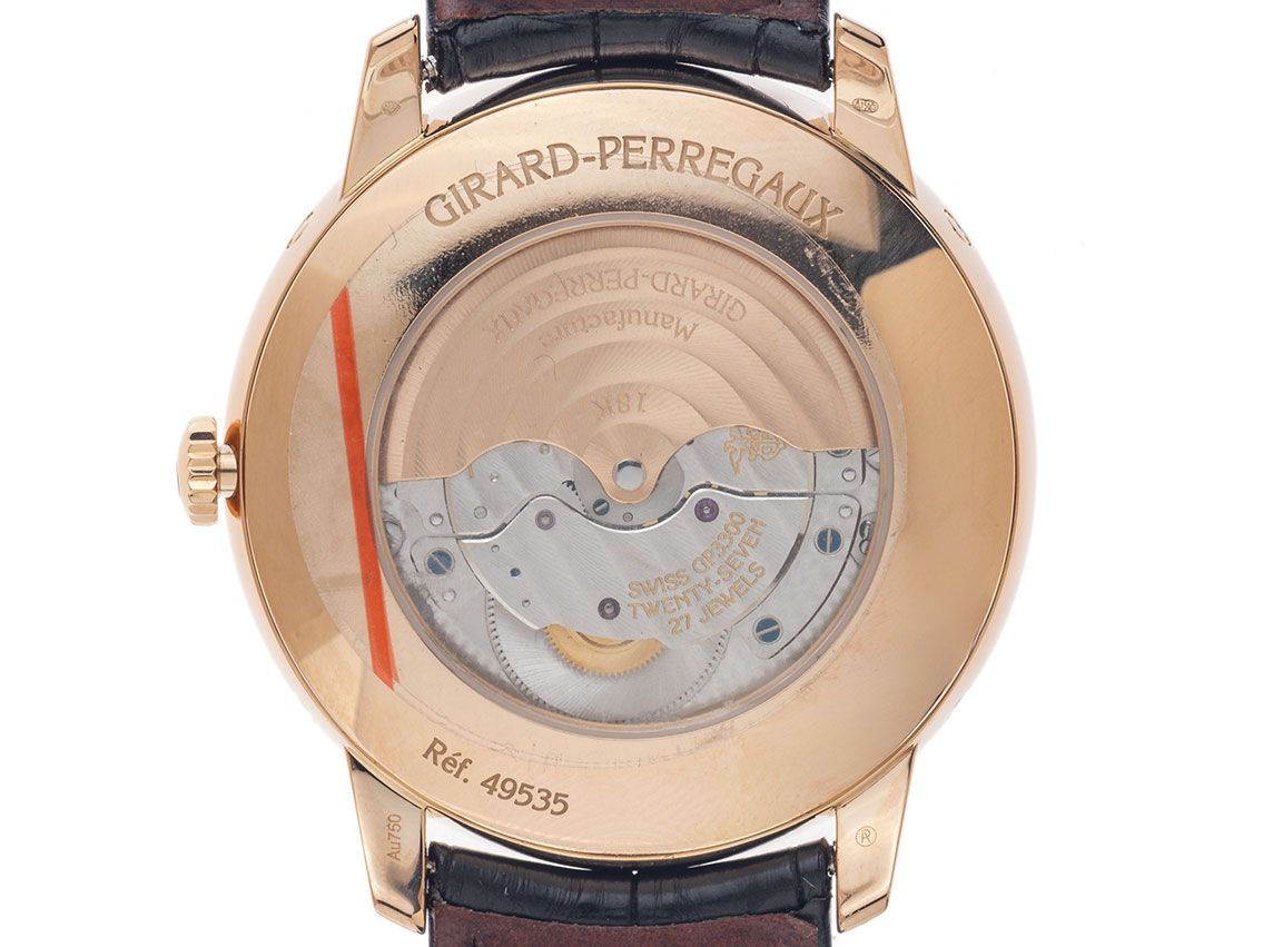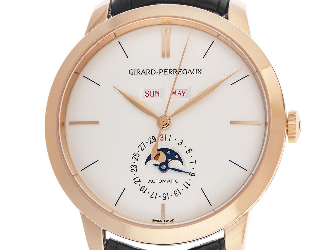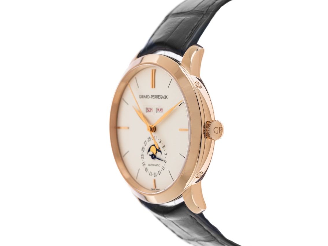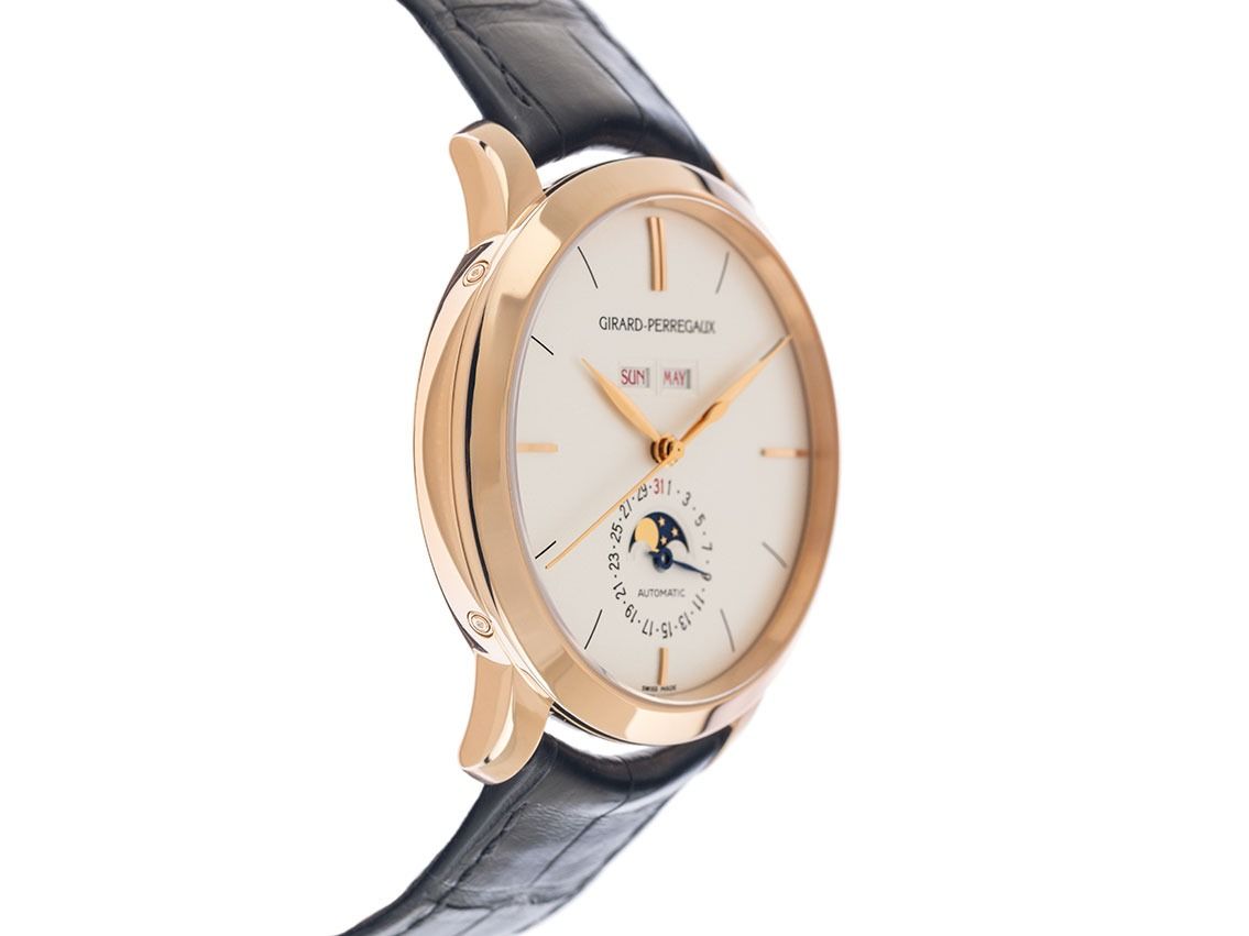 Caja de 18kt Roségold pulida, diámetro de la caja sin corona 40mm, altura de la caja 10,9mm. Bisela de 18kt Roségold lisa y pulida. Pulsera de cuero de cocodrilo negro con costura decorativa, ancho de asa 20mm, cierre de pin de 18kt Roségold pulido. Esfera blanca opalescente con índices y agujas en Roségold. Movimiento automático, calibre de manufactura Girard Perregaux GP03300 con 27 piedras preciosas, reserva de marcha de aproximadamente 46 horas. Indicador de hora, minuto y segundo a través de agujas centrales con parada de segundos para un ajuste preciso de la hora, indicador de día de la semana y mes con ajuste rápido a las 12 en punto, ajustable mediante pulsador a las 10 y 2 en punto, indicador de fecha con ajuste rápido legible a través de la aguja a las 6 en punto, ajustable mediante pulsador a las 4 en punto, indicador de fase lunar con ajuste rápido a las 6 en punto ajustable mediante pulsador a las 8 en punto. Cristal de zafiro resistente a los arañazos y abombado. Corona con logo del fabricante. Fondo de 18kt Roségold atornillado y grabado con ventana de cristal de zafiro. Peso del reloj incluyendo la pulsera 80g. Número de referencia: 49535-52-151-BK6A, número de caja: 3XXX, ID: P0952180000525H-33800, número de artículo: 10000080428. Con control de marcha y completa restauración exterior de mayo de 2025. Caja original de Girard Perregaux con caja exterior y documentos de garantía de diciembre de 2019, así como descripción y extracto del registro de relojes de mayo de 2025, certificado de The Watch Register / sin entrada (base de datos internacional de relojes perdidos o robados), Full Set. Como nuevo. Tiempo de entrega inmediato.