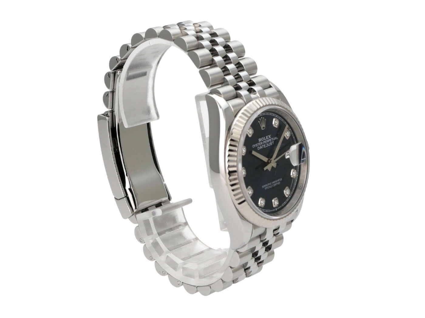 Rolex Datejust 36 Oystersteel White Gold Ref. 126234 Diamond Blue Jubilee BraceletCase made of polished and satin-finished Oystersteel stainless steel, case diameter 36 mm, bezel made of 18 kt white gold, Jubilee stainless steel bracelet with folding clasp, blue dial with 10 applied diamonds, self-winding, Rolex manufacture caliber 3235, 70 hours power reserve, date display, chronometer, sapphire crystal, screw-down crown, screwed stainless steel back, water-resistant up to 10 bar.