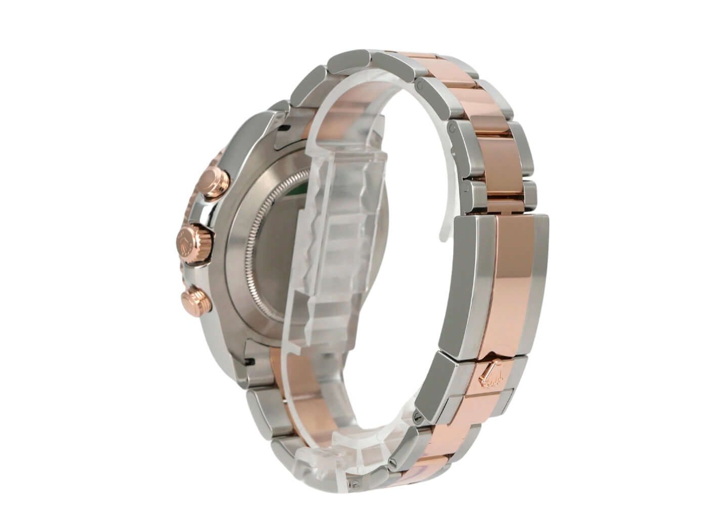 Caja hecha de acero inoxidable y oro Everose de 18 quilates, pulida y satinada, diámetro de la caja 44 mm, bisel hecho de oro Everose de 18 quilates pulido con disco de números de cerámica azul, bisel giratorio 90 grados en ambas direcciones, pulsera Oyster hecha de acero inoxidable y oro Everose de 18 quilates pulida y satinada con cierre desplegable, esfera blanca con marcadores en oro Everose, marcador de hora triangular a las 12 en punto, manecillas luminosas, movimiento automático, calibre 4161 de manufactura Rolex con 42 rubíes, frecuencia de 28,800 vibraciones por hora, cronómetro, segundero pequeño a las 6 en punto, cristal de zafiro resistente a los arañazos, fondo de acero inoxidable atornillado, resistente al agua hasta 10 bar.