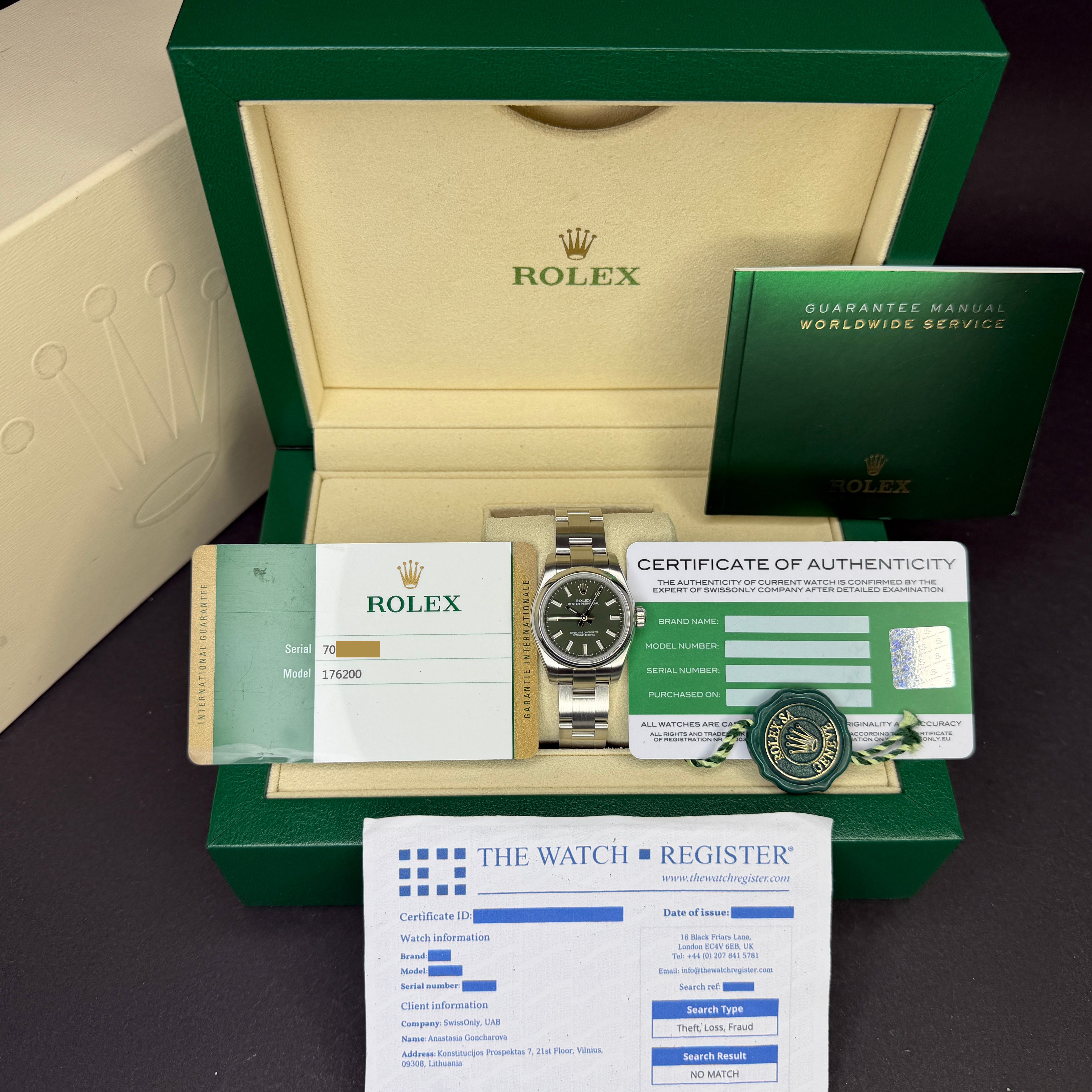 Rolex Oyster Perpetual, 176200, 26mm, 2016, Steel, Olive dial, Fullset, 1y warranty