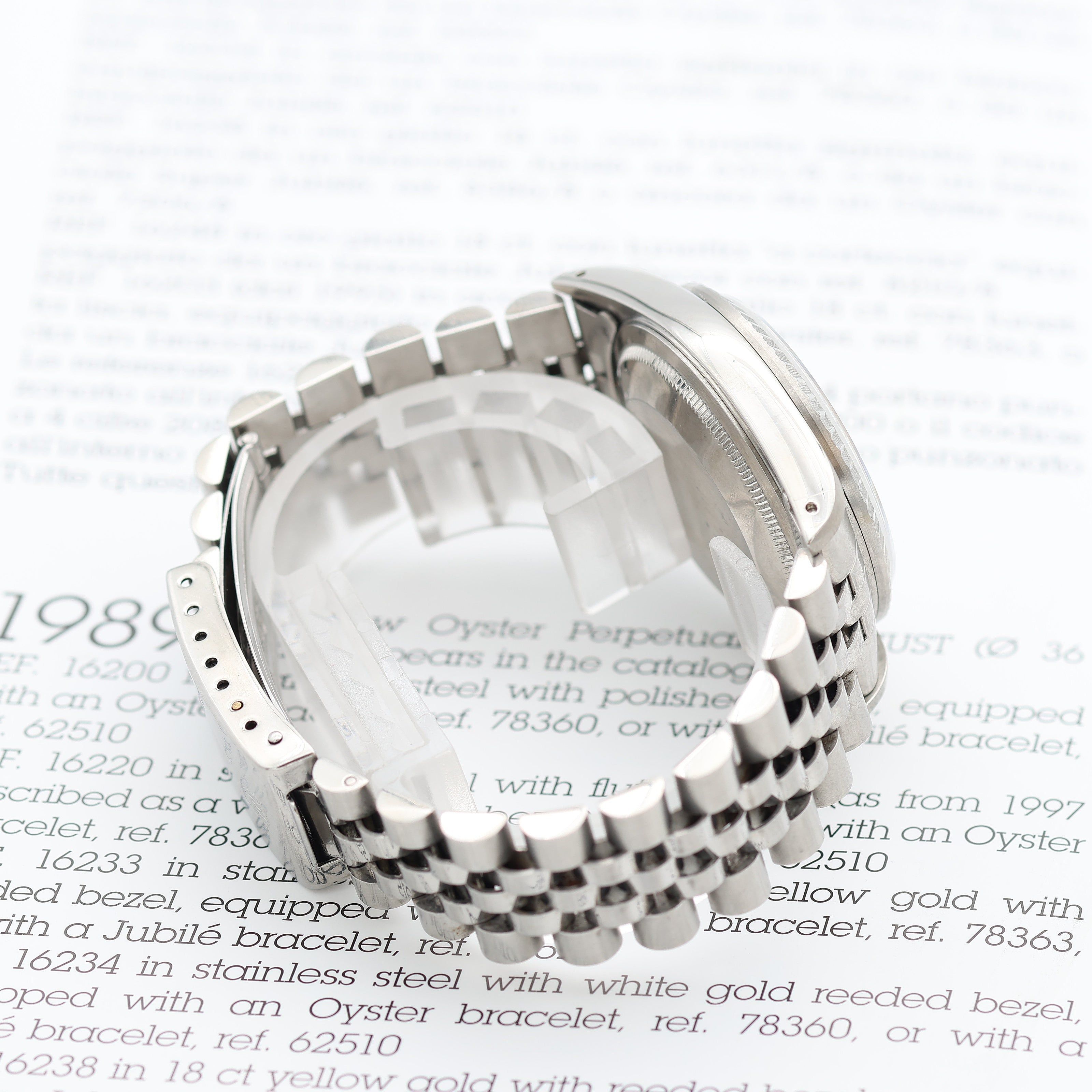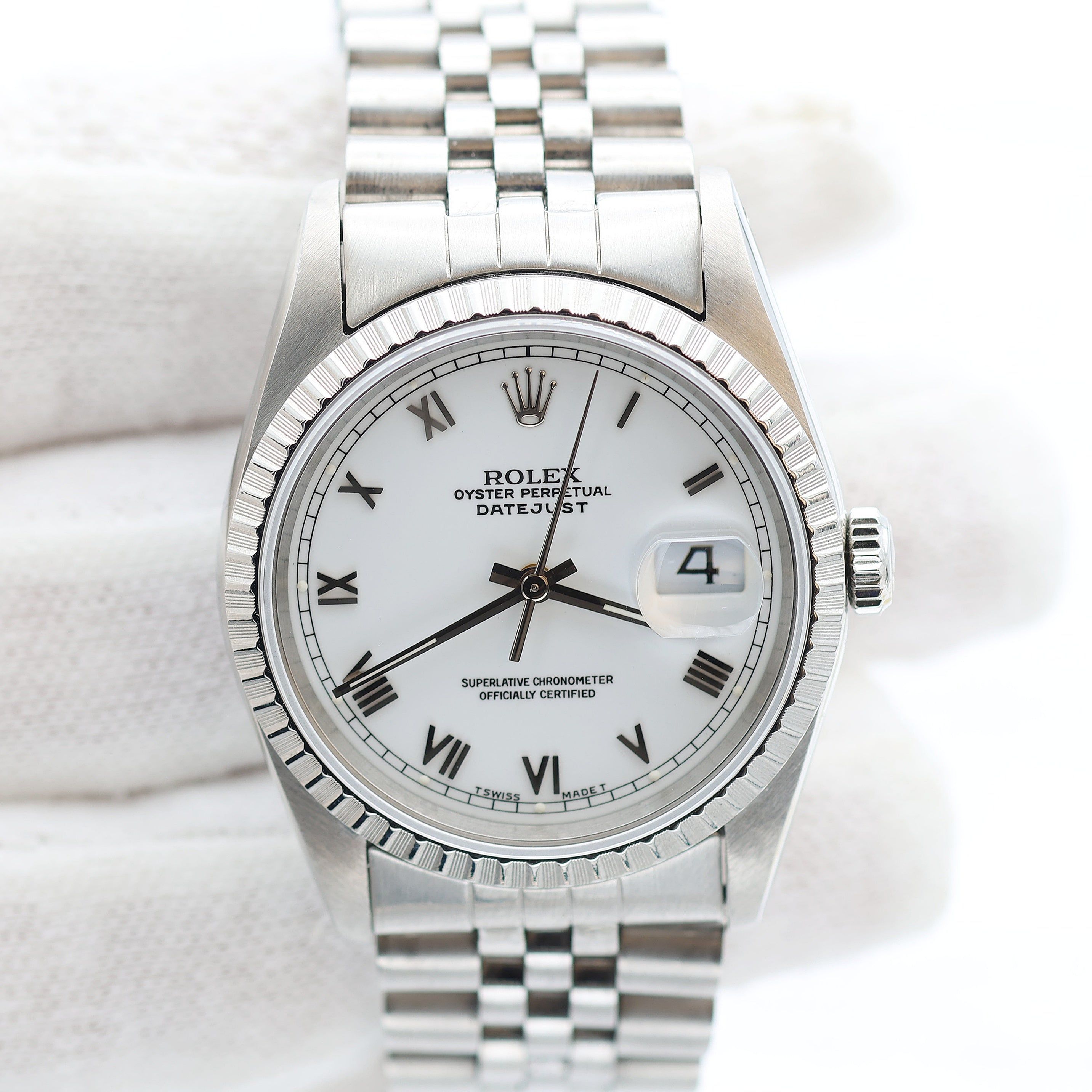 For sale at Debonar Watches: pre-owned Rolex Datejust 16220, on a classic Jubilee bracelet. This Rolex Datejust 16220 presents an amazing white roman dial (small numbers).With its unorthodox engine-turned bezel, the ref. 16220 represented the top of the line of the all steel Datejusts. A bit of its story: Rolex’s ref. 162XX series of Datejust watches first emerged in 1988, a replacement for the relatively short-lived ref. 160XX range. The ref. 16220 was introduced the following year in 1989: this Datejust represents that fine line between all-out dress piece and something robust and versatile enough to be worn everyday. BRAND ROLEX MODEL DATEJUST REFERENCE 16220 CASE MATERIAL STEEL MOVEMENT AUTOMATIC DIMENSION 36 MM DIAL WHITE ROMAN BEZEL STEEL (Fluted) CRYSTAL SAPPHIRE BRACELET TYPE JUBILEE BRACELET MATERIAL BRACELET BRACELET LENGHT 17 CM ORIGINAL BOX NO ORIGINAL PAPERS NO YEAR APPROX. '90s CONDITION VERY GOOD