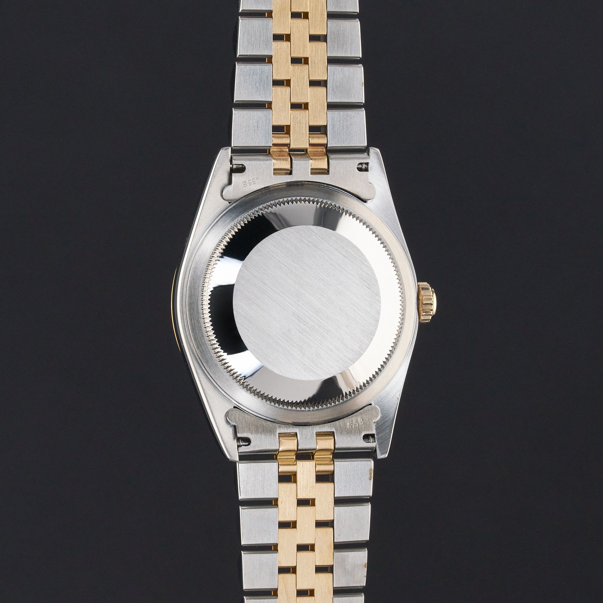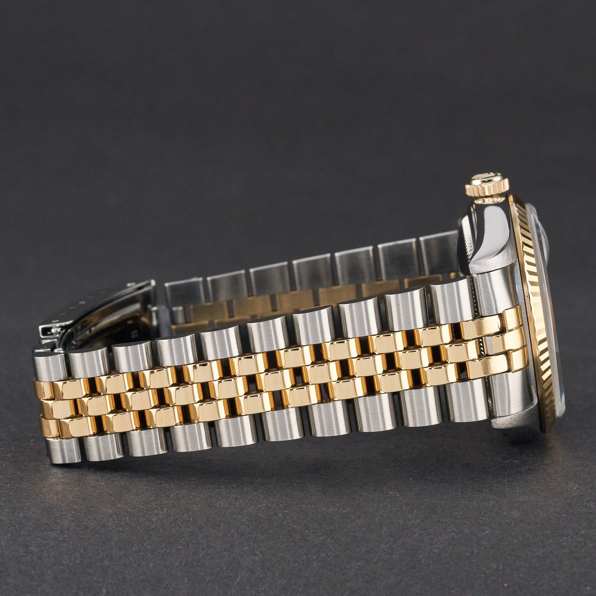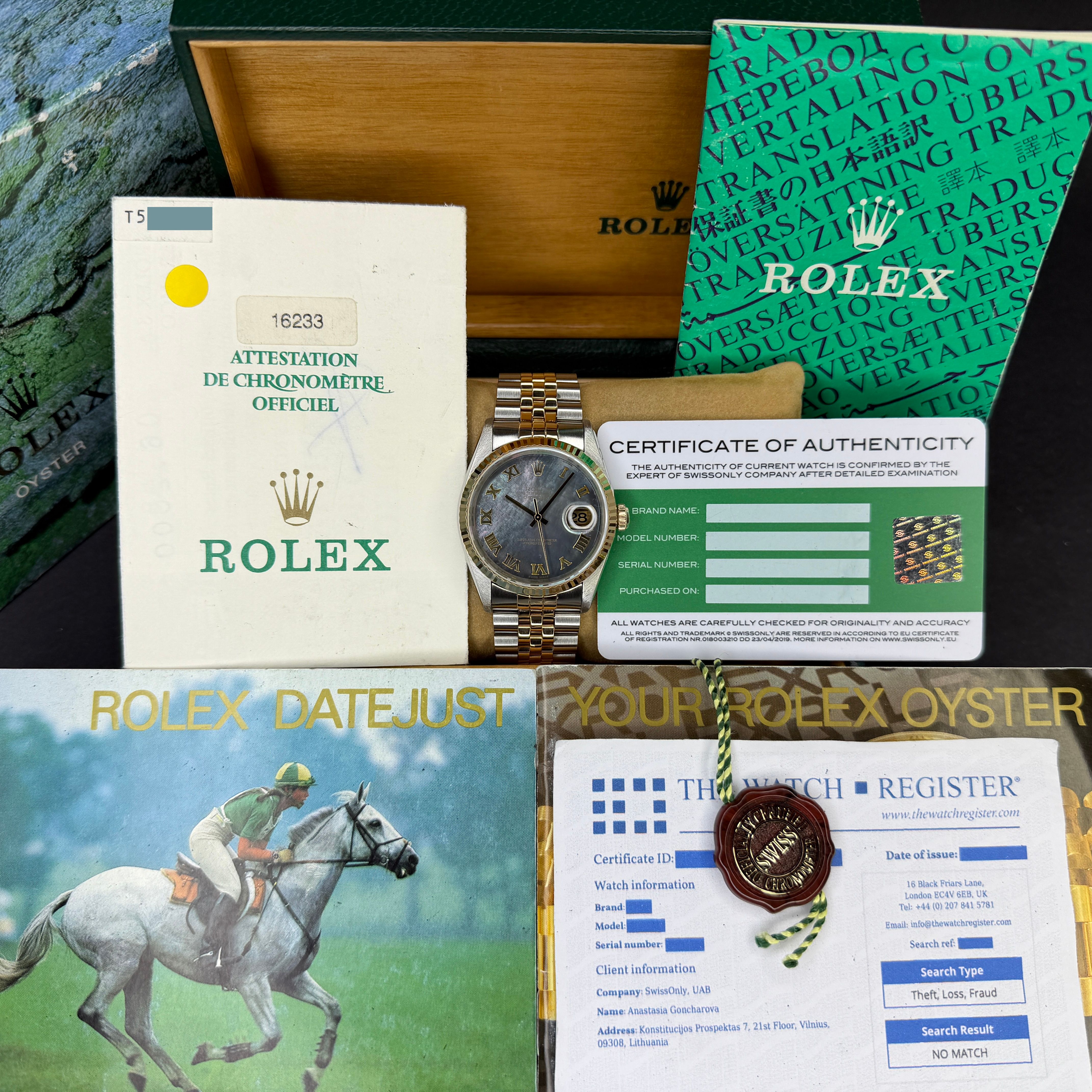 This Rolex Datejust 16233 features a Tahitian Mother of Pearl Roman dial and is crafted from 18K yellow gold and stainless steel, with a production year of 1996.Case No: T57XXXX