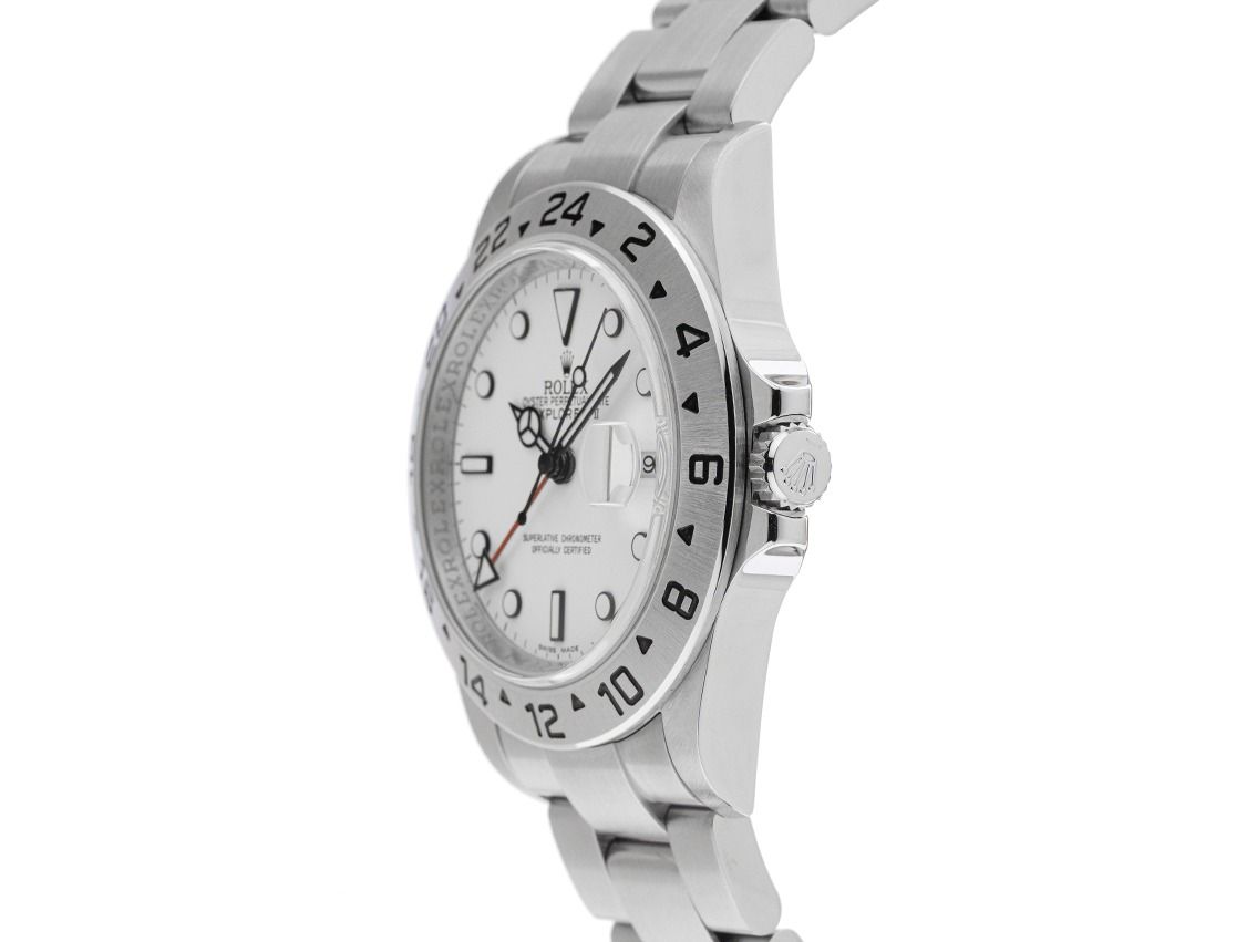 Rolex Explorer II Stahl Automatik Armband OysterGehäuse Edelstahl poliert und satiniert, Gehäusedurchmesser ohne Krone 40mm, Gehäusehöhe 12,1mm. Lünette Edelstahl satiniert mit 24-Stunden Skala. Armband Oyster Edelstahl poliert und satiniert, Faltschließe Edelstahl mit Hersteller-Logo. Zifferblatt weiß mit aufgesetzten Indexen und schwarzen Zeigern. Uhrwerk Automatik, Chronometer, Rolex Manufakturkaliber 3185 mit 31 Edelsteinen. Anzeige von Stunde, Minute und Sekunde über Zeiger aus der Mitte mit Sekundenstopp zur sekundengenauen Einstellung der Uhrzeit, Datumsanzeige mit Schnellverstellung unter Glaslupe bei 3 Uhr, zweite Zeitzone (GMT) ablesbar über Lünette, einstellbar über roten Zeiger aus der Mitte. Saphirglas kratzfest. Krone verschraubbar mit Flankenschutz und Hersteller-Logo. Boden Edelstahl verschraubt. Gewicht der Uhr inklusive Armband 120g, Länge des Armbandes inklusive Gehäuse 180mm. Referenznummer: 16570, Gehäusenummer: W273XXX, Baujahr: 1995, ID: P2573134200226H-9900, Artikelnummer: 10000084902. Mit Gangkontrolle und kompletter äußerlicher Aufarbeitung von Februar 2026. Original Rolex Box mit Umkarton sowie Beschreibung, Ledermäppchen, Rolex Chronometer-Siegel, Tag und Watchregister Auszug von Februar 2026, The Watch Register Zertifikat / ohne Eintrag (Internationale Datenbank für verlorene oder gestohlene Uhren). Superschnäppchen, Kapitalanlage mit Wertsteigerungspotential, sehr seltenes Sammlerstück. Sehr guter Zustand. Lieferzeit sofort.