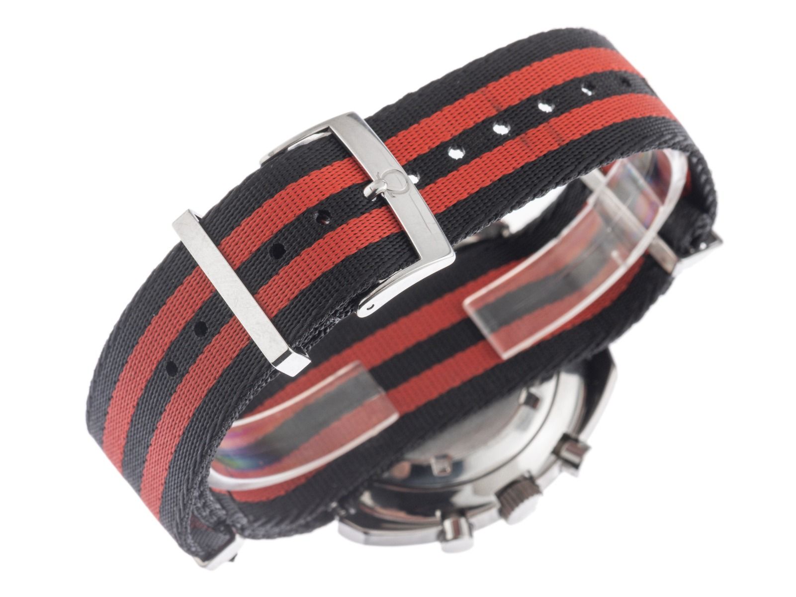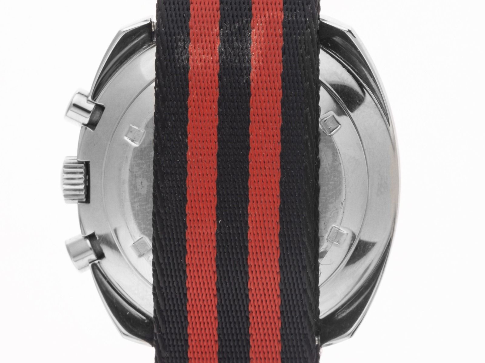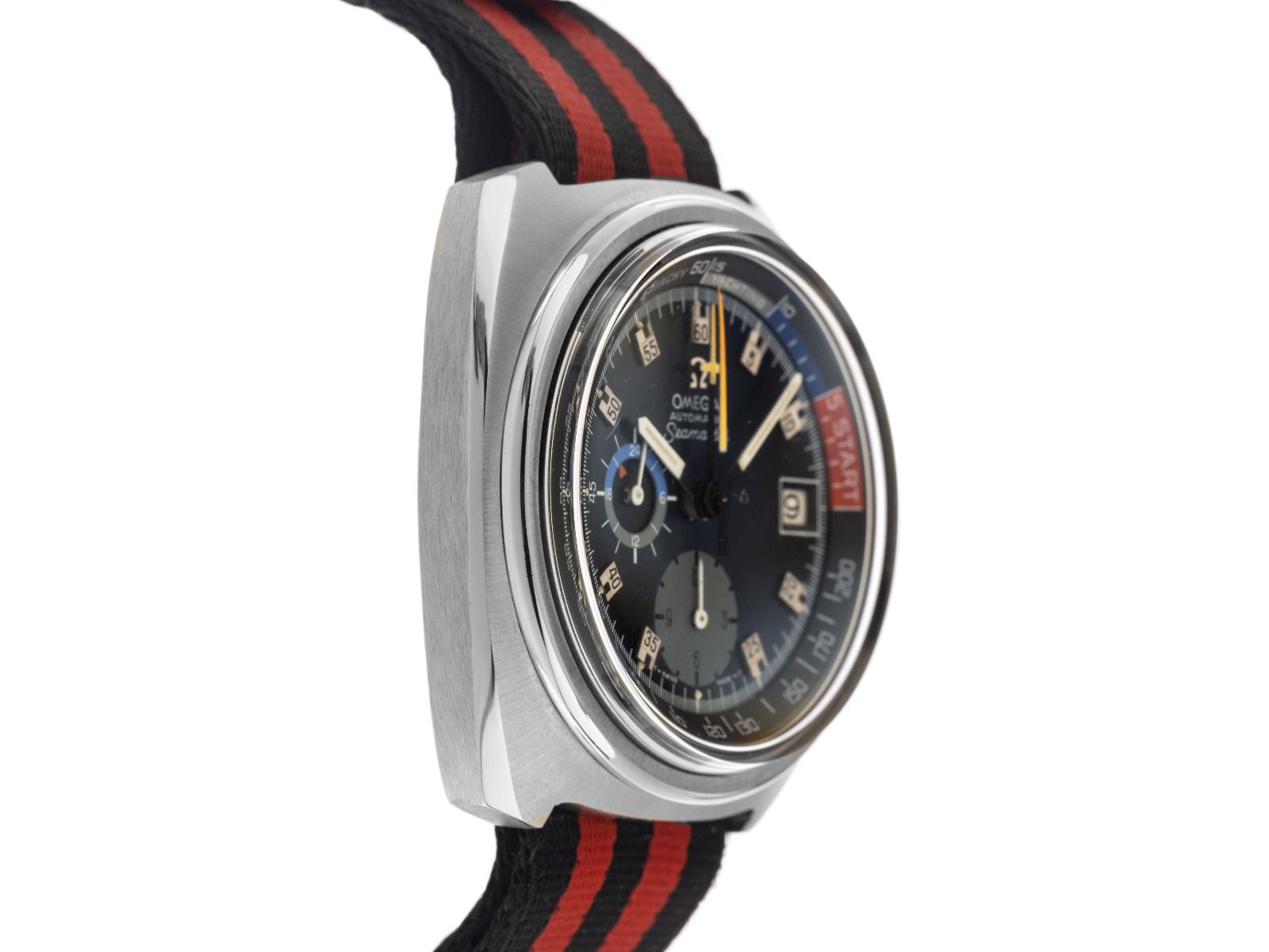 Caja de acero inoxidable pulido y satinado, diámetro de la caja sin corona 44mm, altura de la caja 15,8mm. Escala taquimétrica bajo cristal. Correa textil negra / roja, ancho de asa 21mm, hebilla de pasador de acero inoxidable con logo del fabricante. Esfera azul oscuro con números árabes e índices aplicados, así como agujas blancas. Movimiento automático, cronógrafo, calibre de manufactura Omega 1040 con 22 piedras preciosas. Indicador de horas y minutos a través de agujas centrales, segundero pequeño a las 9 en punto, indicador de fecha con ajuste rápido a las 3 en punto, cuenta atrás de regata y visualización de 24 horas. Cristal acrílico abombado. Corona estriada con logo del fabricante. Fondo de acero inoxidable atornillado con relieve de Seamaster. Peso del reloj incluyendo la correa 109g. Número de referencia: 176.010, número de caja: 35604XXX, año de fabricación: 1972, ID: P232316000126H-6800, número de artículo: 10000084352. Con control de marcha y completa restauración exterior de febrero de 2026. Caja original de Omega y extracto del registro de relojes de febrero de 2026, certificado de The Watch Register / sin entrada (base de datos internacional de relojes perdidos o robados). Superoferta, pieza de colección extremadamente rara. Muy buen estado. Tiempo de entrega inmediato.