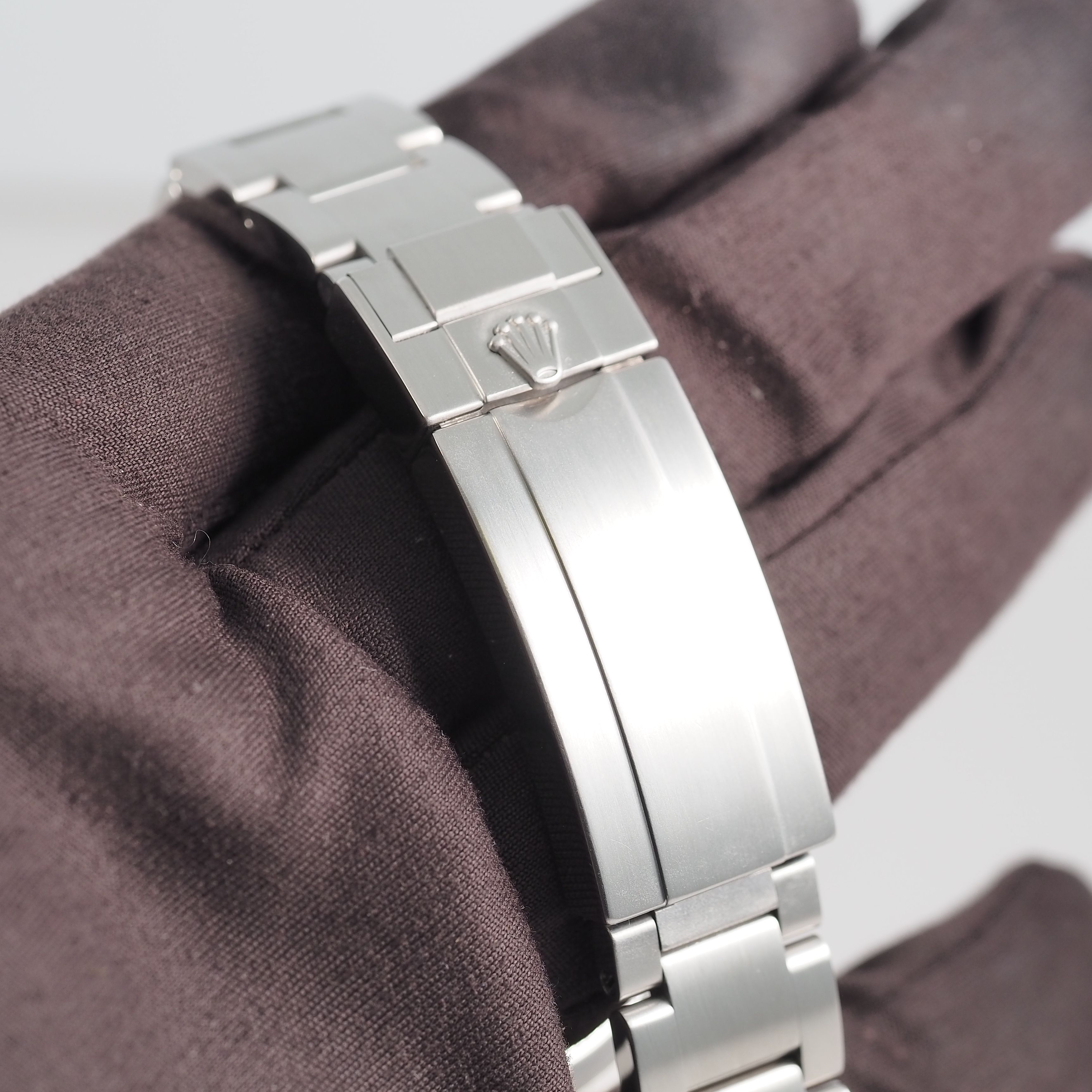 El reloj cuenta con la pulsera de eslabones de ostra cepillada, hasta el cierre de eslabón rápido largo. El reloj está montado en la caja de Rolex con acabado cepillado / brillo alto. El bisel negro alberga el cristal de zafiro con la lupa magnificada, mostrando la nítida esfera negra.