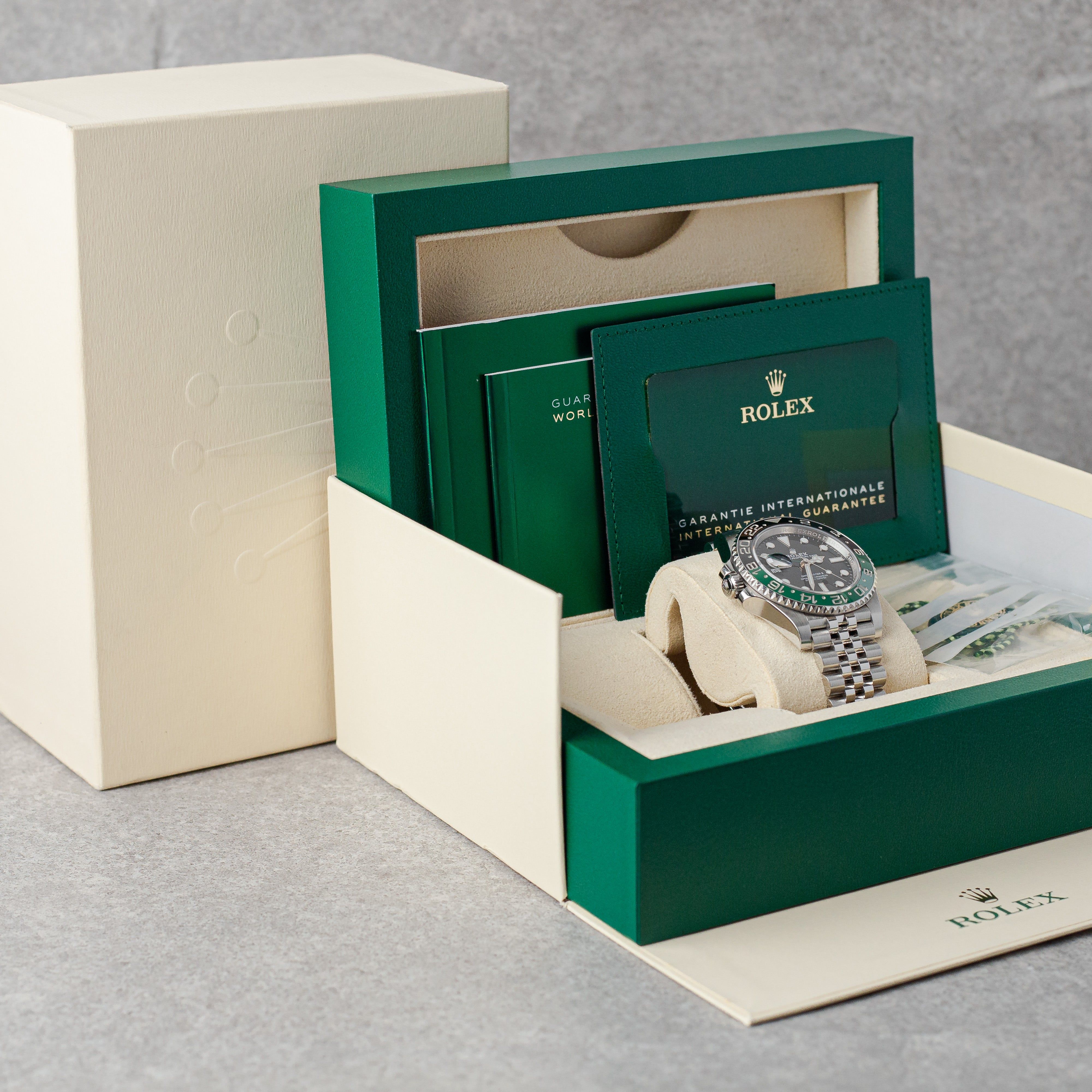 The Rolex GMT-Master II "Sprite" ref. 126720VTNR features a distinctive 40mm stainless steel case with a green and black Cerachrom bezel and a unique left-hand crown placement. Designed for world travelers, it includes a green GMT hand to track an additional time zone. Powered by the Rolex Caliber 3285 movement, it offers a 70-hour power reserve. This full set, in perfect condition from August 2022, comes with a 5-year international Rolex guarantee, making it a unique and functional choice for collectors and GMT enthusiasts.