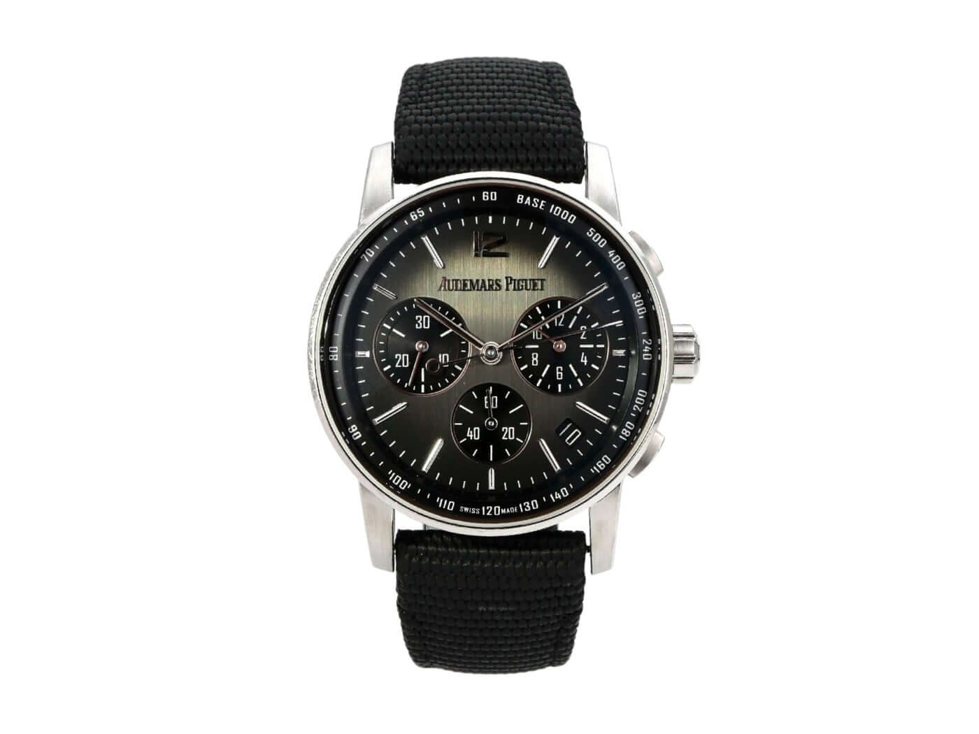 Audemars Piguet Code 11.59 Chronograph 26393NB.OO.A002KB.01Case made of ceramic / polished and satin-finished white gold, case diameter 41 mm, case height 12.6 mm, polished white gold bezel, rubberized strap with white gold pin buckle, smoky black dial with white gold indices and hands, tachymeter scale, automatic movement, manufacture caliber 4401 with 40 jewels, frequency 28,800 A/h, power reserve of approx. 70 hours, date display, anti-reflective sapphire crystal, exhibition case back, water-resistant up to 3 bar.
