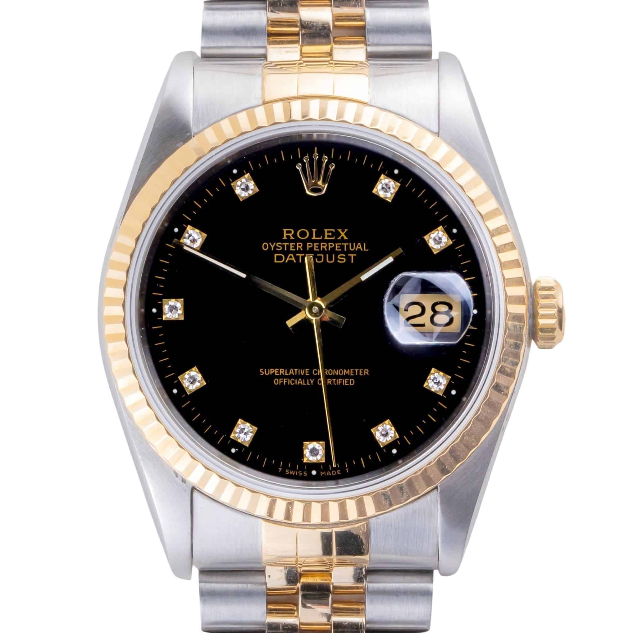Rolex Oyster Perpetual Datejust referencia 16233 de 1991, incluyendo conjunto completo. El Datejust 16233 tiene una caja de 36 mm de oro y acero inoxidable, pulsera Jubilee bicolor y bisel estriado de oro de 18k. Este Datejust 16233 cuenta con un movimiento automático calibre 3135 con función de fecha rápida, un cristal de zafiro resistente a los arañazos y una esfera negra con manecillas de tritio y marcadores de diamante.