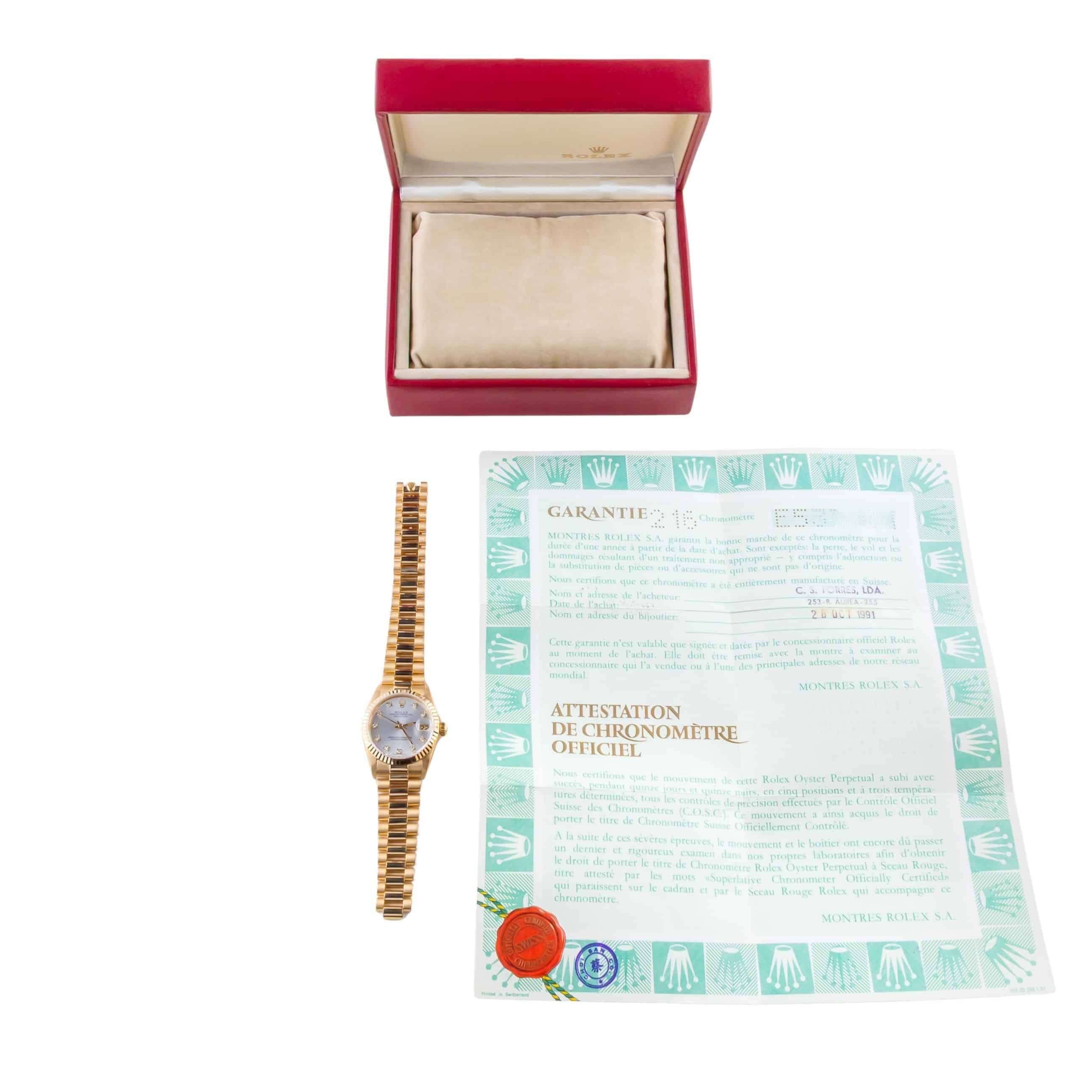Rolex Oyster Perpetual Lady-Datejust referencia 68278 de 1990, incluyendo set completo. La Lady-Datejust 68278 tiene una caja de oro de 31 mm, pulsera President de oro y un bisel estriado de oro de 18k. La Lady-Datejust 68278 cuenta con un movimiento automático calibre 2135 con función de fecha rápida, cristal de zafiro y una esfera plateada con marcadores de diamante.