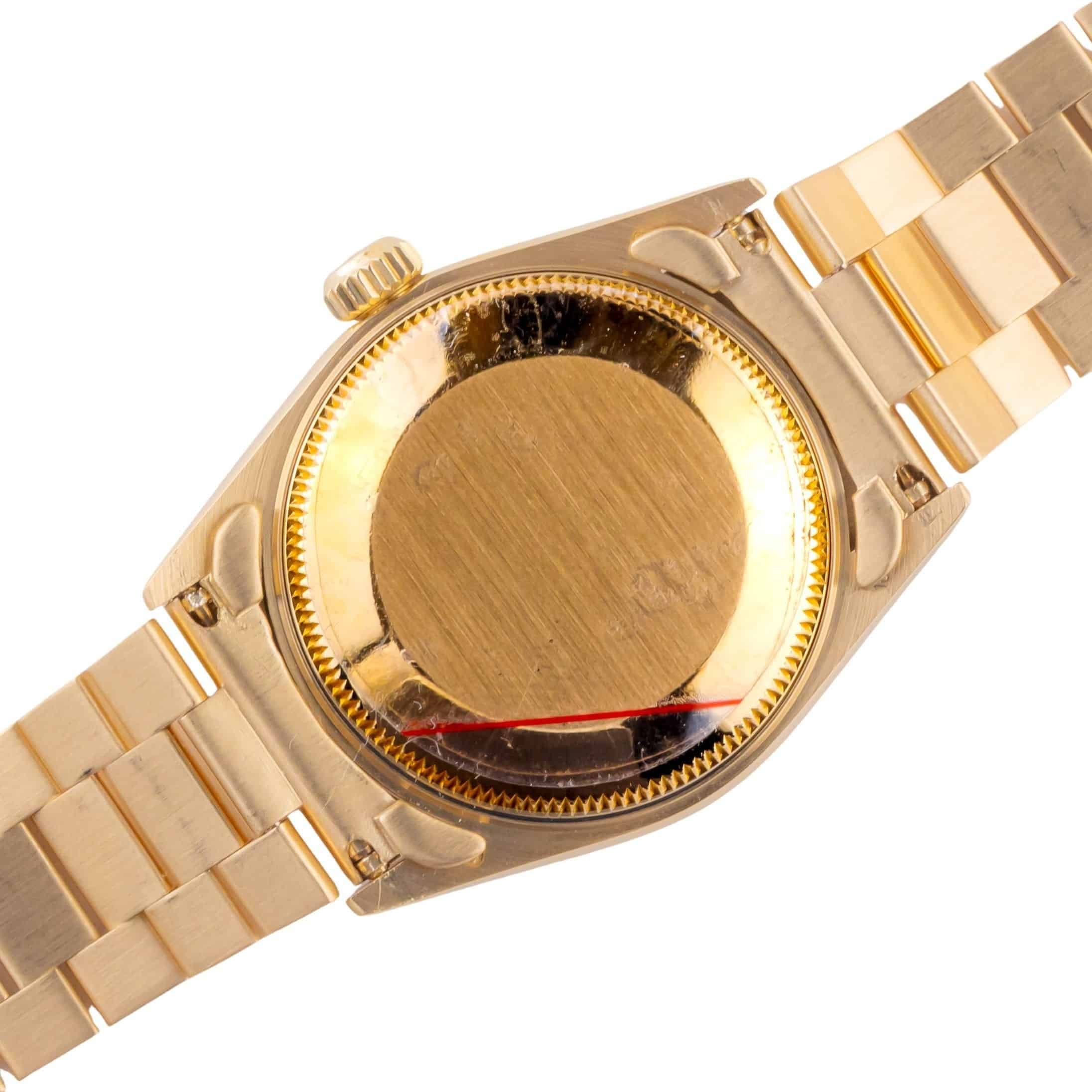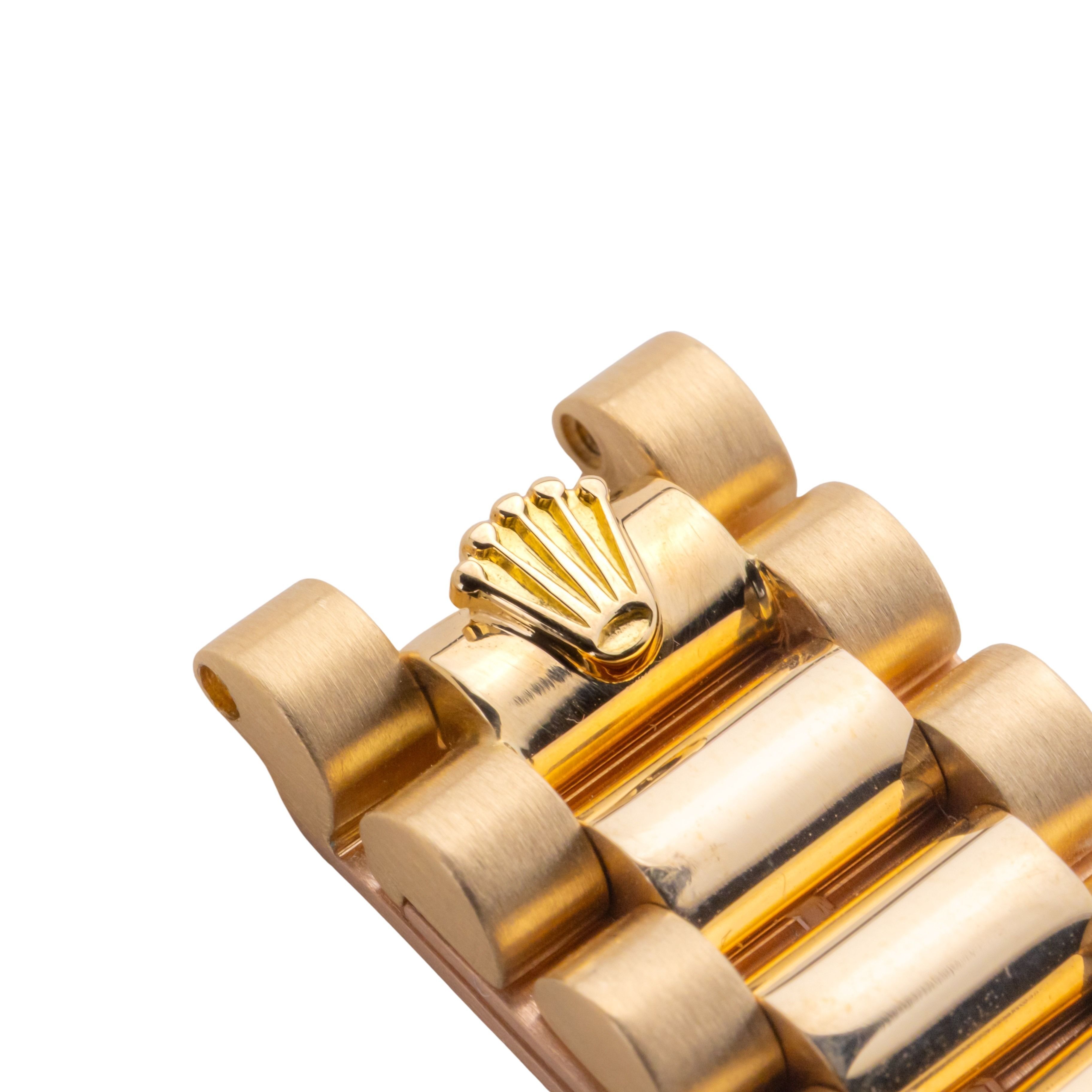 Rolex Oyster Perpetual Lady-Datejust reference 68278 from 1990 including full set. The Lady-Datejust 68278 measures a 31mm gold case, gold President bracelet, and fluted 18k gold bezel. The Lady-Datejust 68278 features an automatic movement caliber 2135 with quickset date function, sapphire crystal and a silver stick dial with diamond markers.Every watch sold by Langedyk Vintage Watches is included with a LVW watch box, Authenticity report and free worldwide (insured) shipment. In addition, every pre-owned watch is offered with our 12-month warranty from the date of purchase.