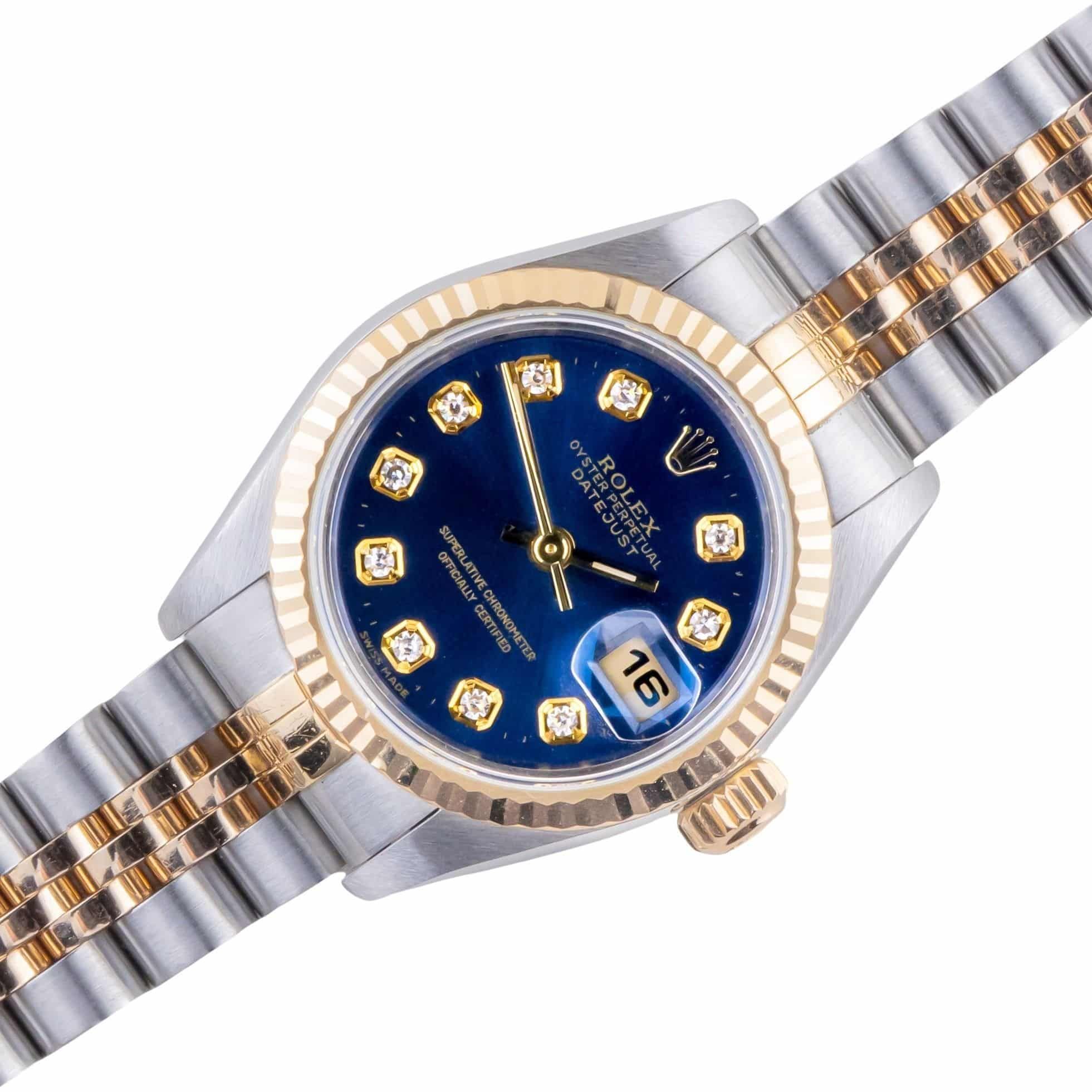 Rolex Oyster Perpetual Lady-Datejust referencia 79173 de 1999, incluyendo set completo. La Lady-Datejust 79173 tiene una caja de 26 mm en oro y acero inoxidable, una pulsera jubilee bicolor y un bisel estriado de oro de 18k. Esta Lady-Datejust 79173 cuenta con un movimiento automático calibre 2235 con función de fecha rápida, un cristal de zafiro resistente a los arañazos y una esfera azul con marcadores de diamante.