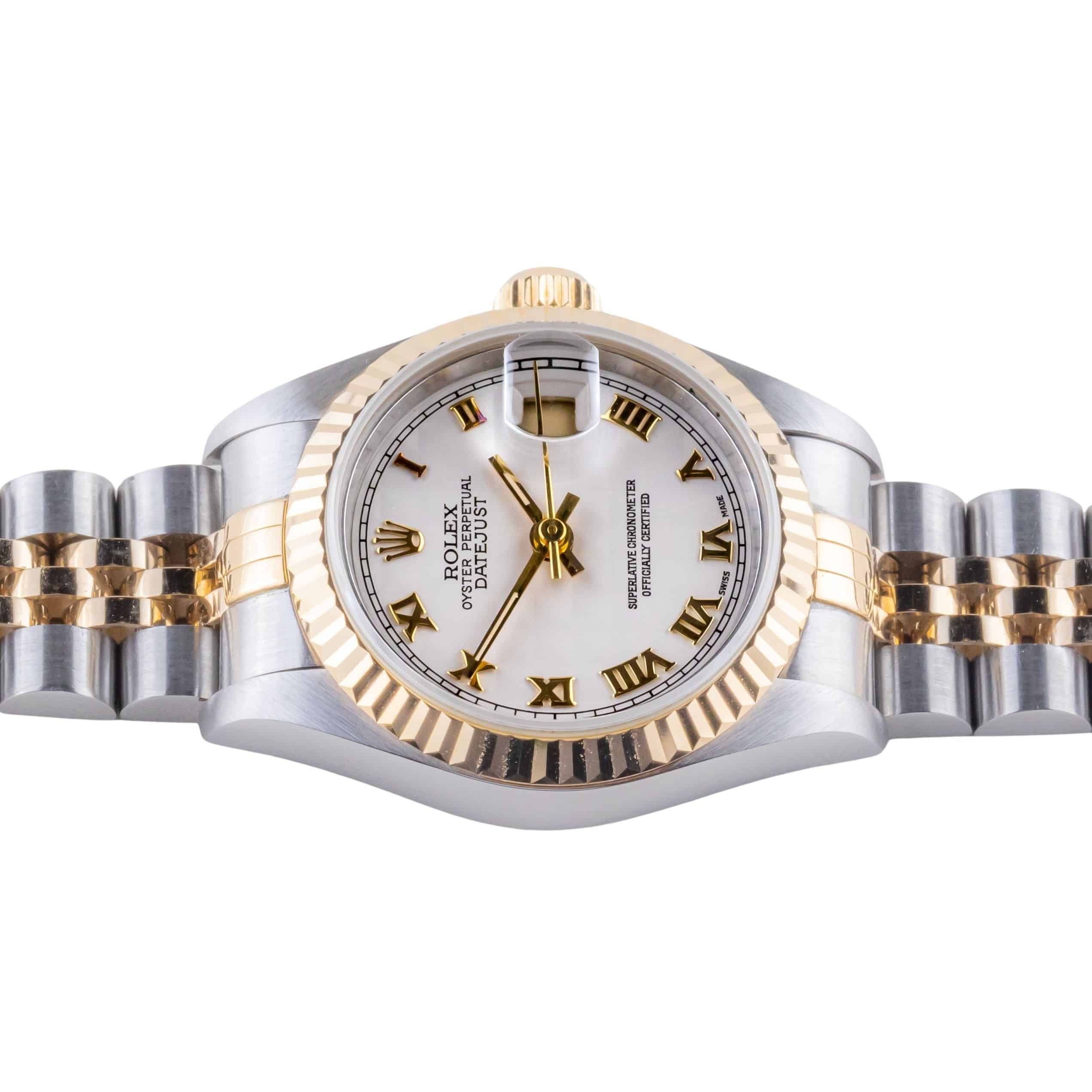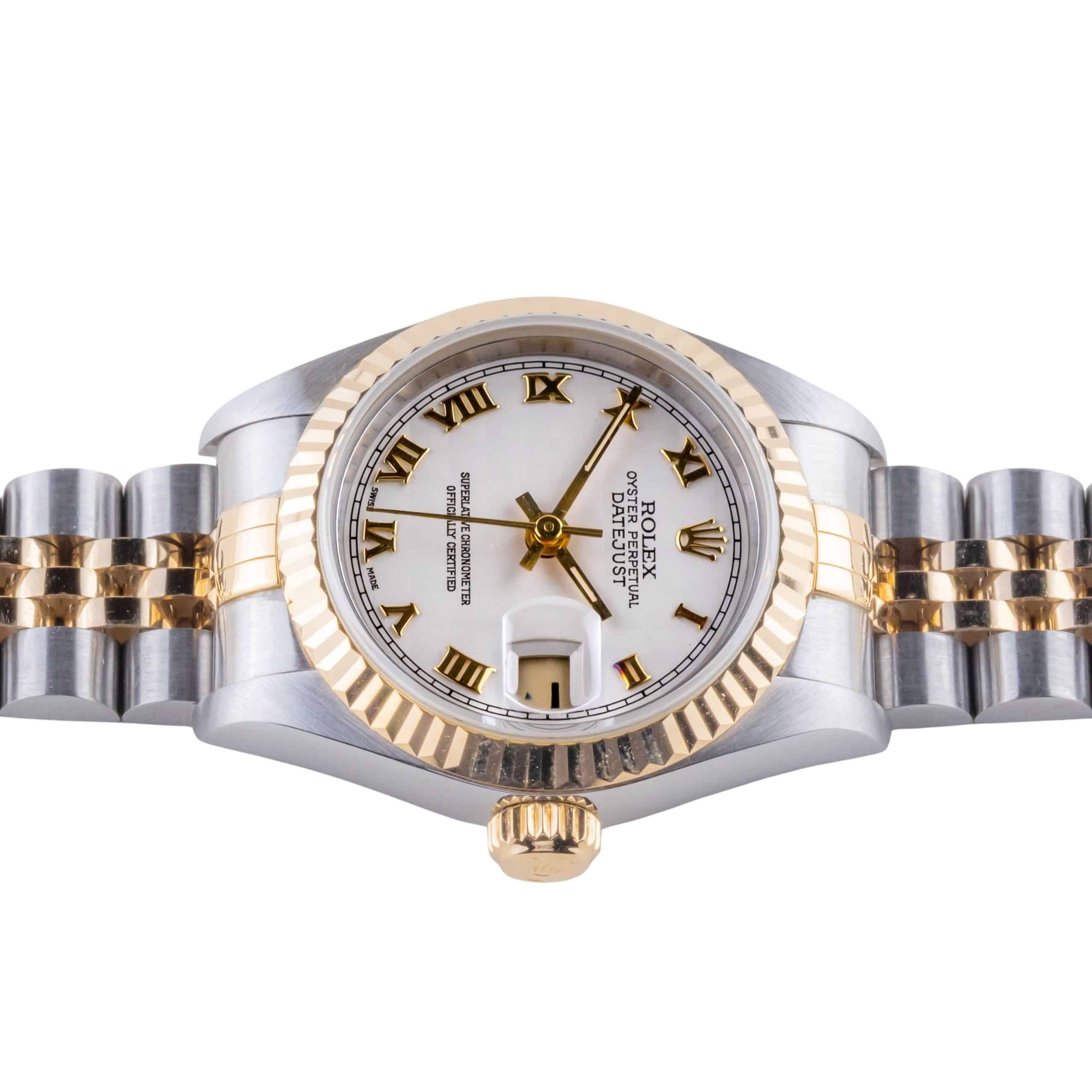 Rolex Oyster Perpetual Lady-Datejust reference 79173 from 1996 including full set. The Lady-Datejust 79173 measures a 26mm gold and stainless steel case, a two-tone jubilee bracelet and a fluted 18k gold bezel. This Lady-Datejust 79173 features an automatic movement caliber 2235 with quickset date function, a scratch resistance sapphire crystal and a Creme Pyramid dial.Every watch sold by Langedyk Vintage Watches is included with a LVW watch box, Authenticity report and free worldwide (insured) shipment. In addition, every pre-owned watch is offered with our 12-month warranty from the date of purchase.