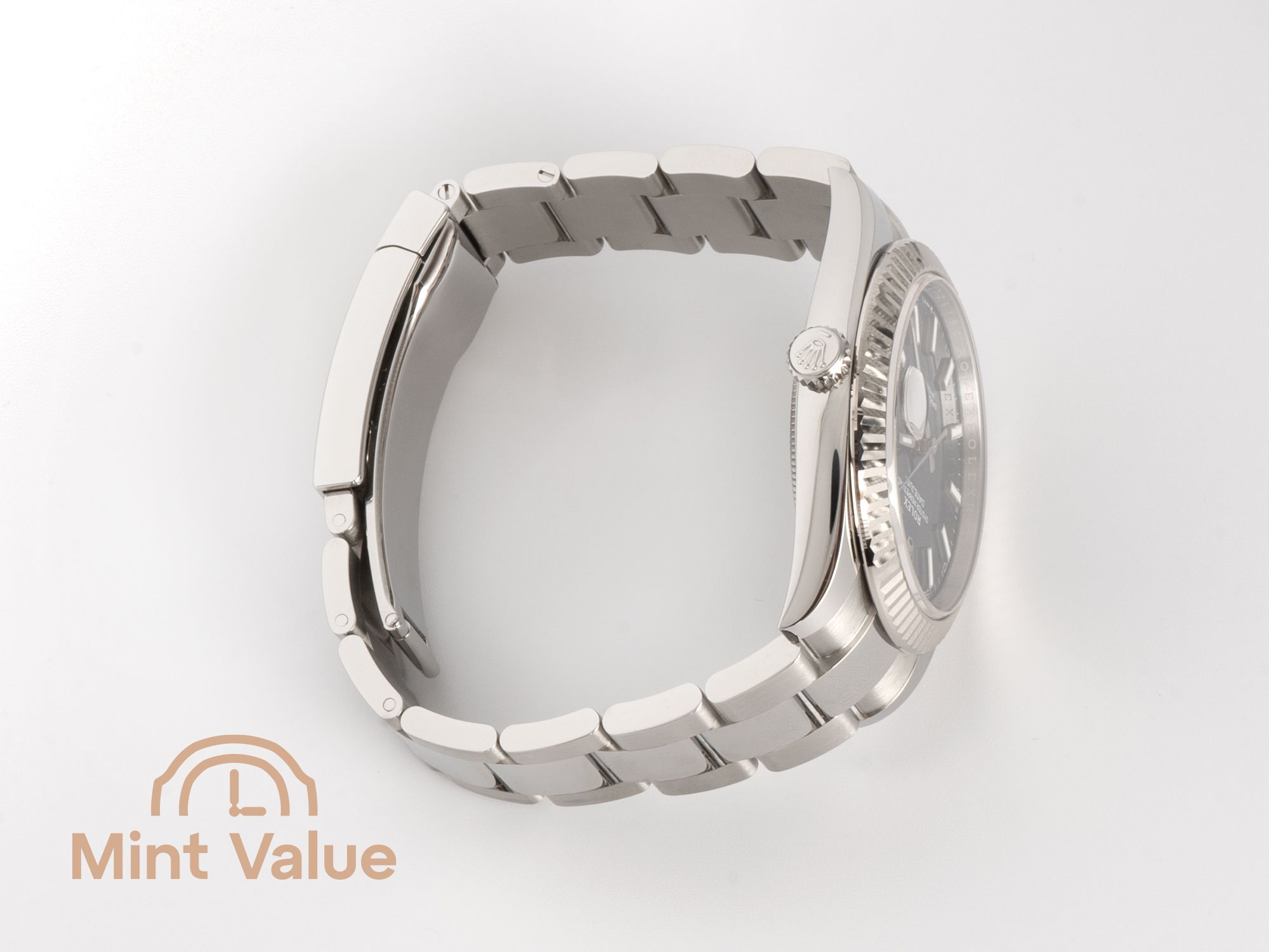 The combination of Oystersteel’s durability and white gold’s brilliance gives the watch a confident presence. The fluted bezel refracts light like a series of finely cut facets, while the deep blue dial adds a contemporary note that complements both formal and casual settings. The Oyster bracelet enhances the watch’s sporty elegance and provides a secure, comfortable fit for everyday wear.