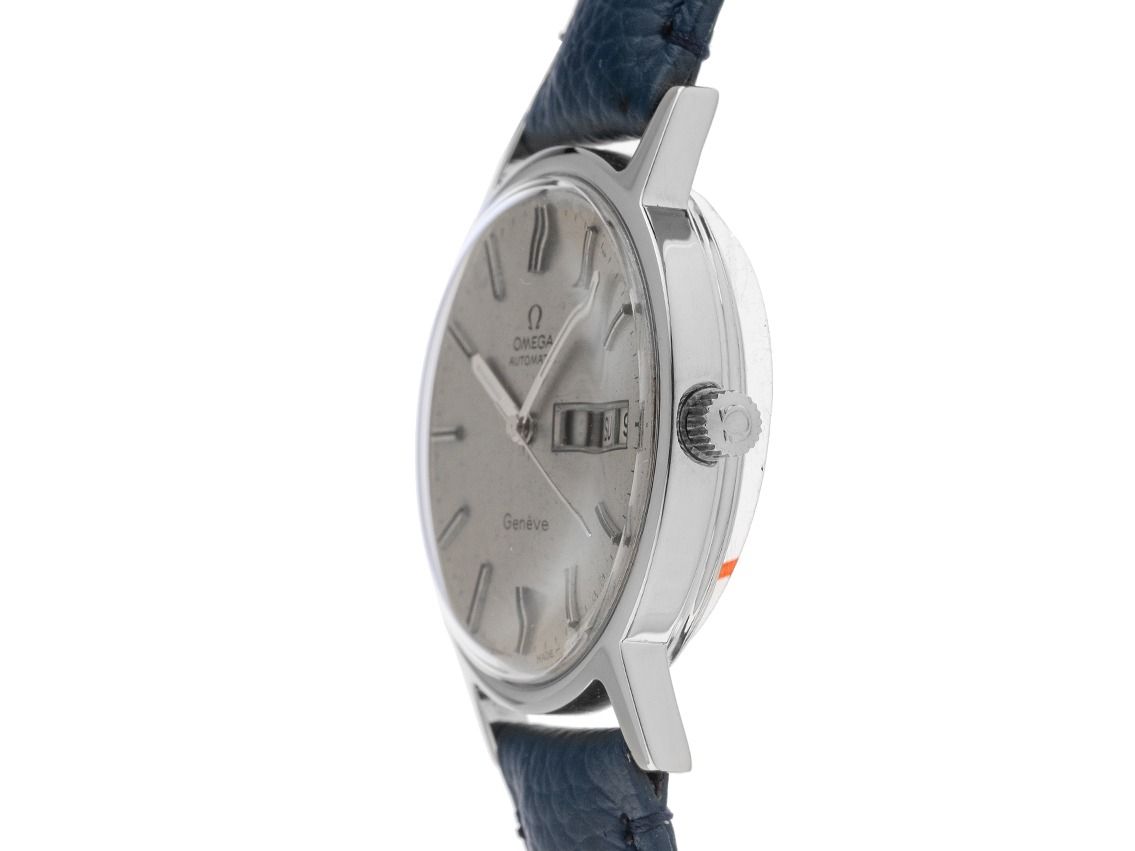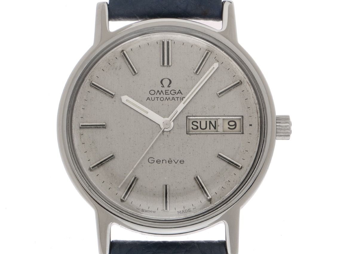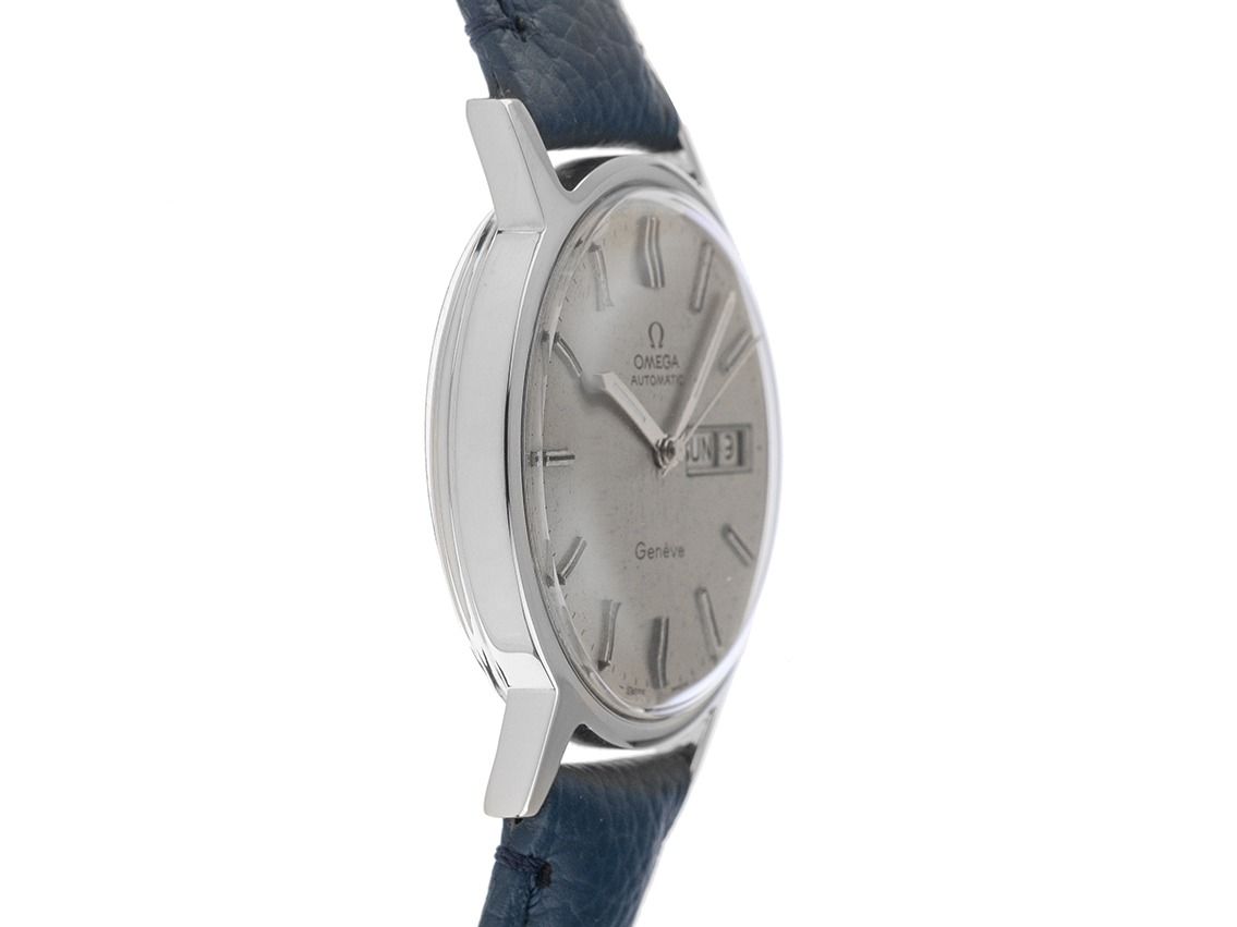 Omega Genevé Day-Date Stahl Automatik Armband LederGehäuse Edelstahl poliert, Gehäusedurchmesser ohne Krone 35mm, Gehäusehöhe 10,6mm. Armband Leder dunkelblau mit Ziernaht, Anstoßbreite 18mm, Stiftschließe Edelstahl. Zifferblatt silberfarben mit Patina, aufgesetzten Edelstahl Indexen und Edelstahl Zeigern. Uhrwerk Automatik, Omega Kaliber 1022 mit 23 Edelsteinen. Anzeige von Stunde, Minute und Sekunde über Zeiger aus der Mitte, Wochentagsanzeige in Englisch und Datumsanzeige mit Schnellverstellung bei 3 Uhr. Plexiglas gewölbt. Krone geriffelt. Boden Edelstahl verschraubt. Gewicht der Uhr inklusive Armband 44g. Referenznummer: 1660163, Baujahr: 1978, Gehäusenummer: 41264XXX ID: P239016500126H-3100, Artikelnummer: 10000084524. Mit neuer Uhrwerk Revision und kompletter äußerlicher Aufarbeitung von Februar 2026. Original Omega Box und Watchregister Auszug von Januar 2026, The Watch Register Zertifikat / ohne Eintrag (Internationale Datenbank für verlorene oder gestohlene Uhren). Superschnäppchen, extrem seltenes Sammlerstück. Sehr guter Zustand. Lieferzeit sofort.