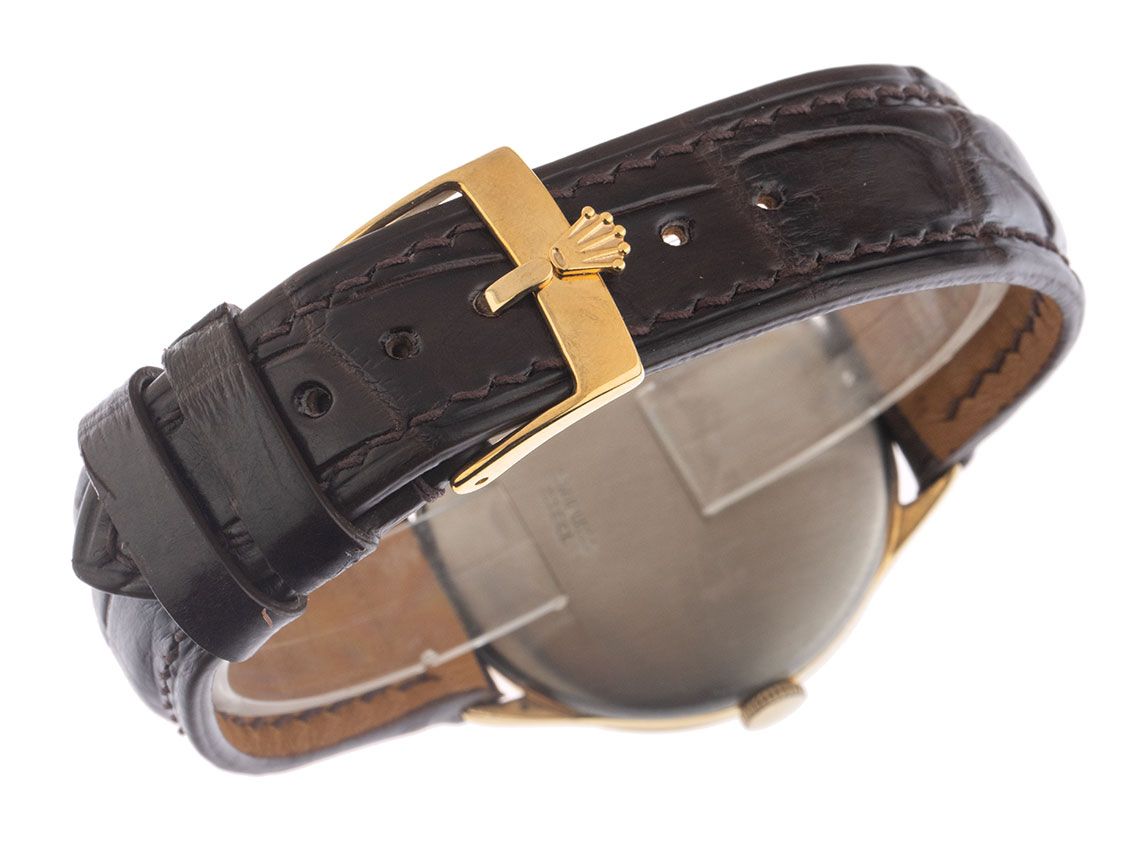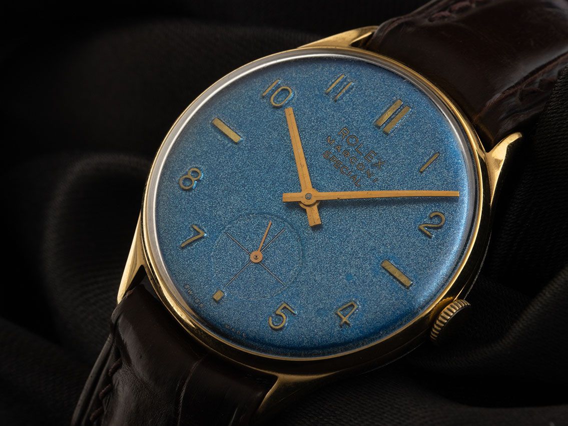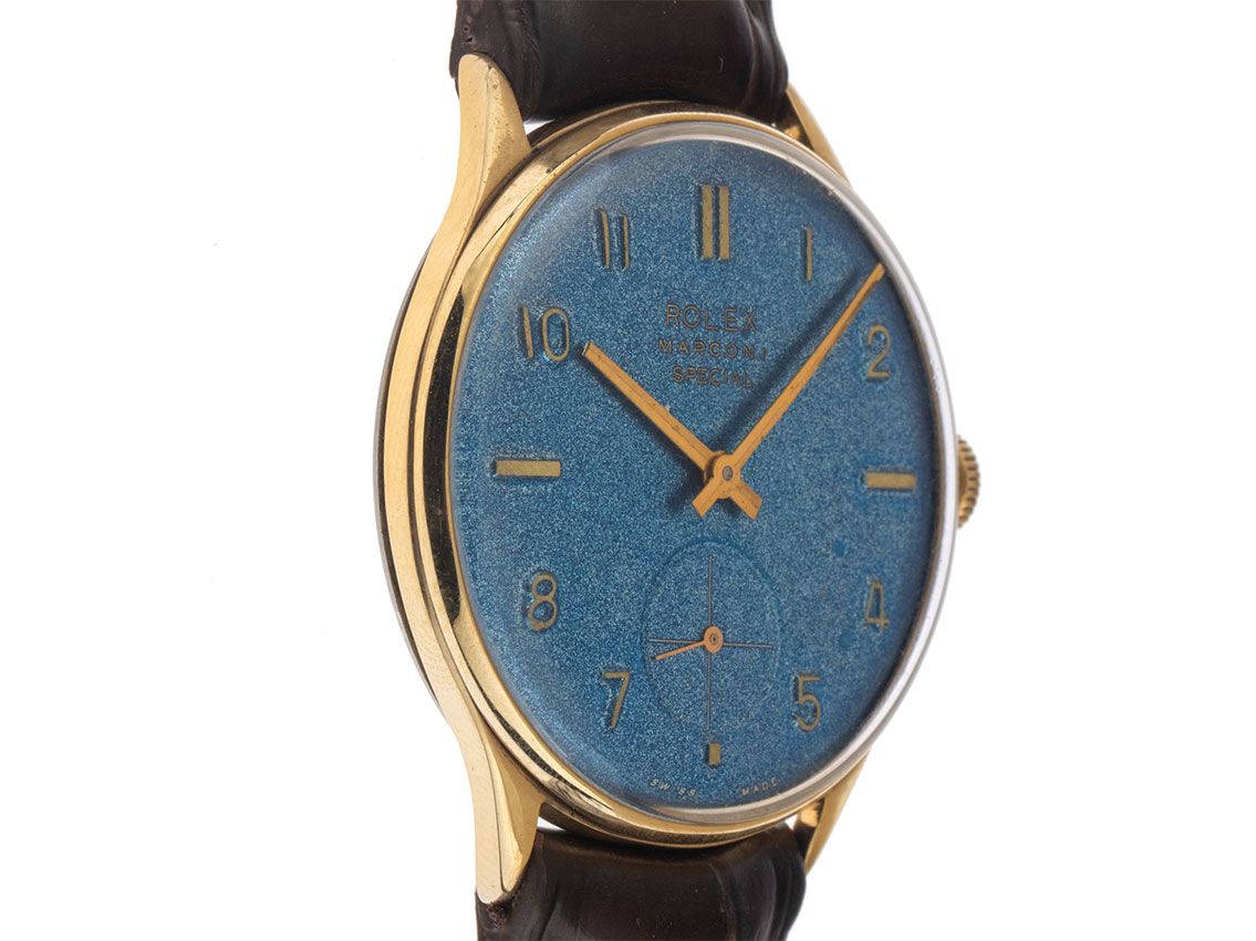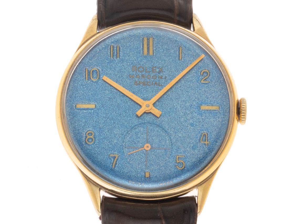 Rolex Marconi Special Acero Manual Correa de Cocodrilo Caja de Oro Amarillo chapada y pulida, diámetro de la caja sin corona 33,5mm, altura de la caja 8,1mm. Correa de cocodrilo marrón de Rolex, ancho de asas 18mm, hebilla de pasador de Rolex chapada en oro amarillo con el logo del fabricante. Esfera azul con números árabes y marcadores en oro amarillo ligeramente patinados, así como agujas en oro amarillo. Movimiento manual, calibre Marconi. Indicación de horas y minutos a través de agujas centrales, pequeño segundero a las 6 en punto. Plexiglás. Corona estriada. Fondo de acero inoxidable grabado. Peso del reloj incluyendo la correa 35g. Los relojes Rolex Marconi generalmente no tienen números de referencia clásicos de Rolex. Número de caja: 754XXX, año de fabricación: 1940, ID: P255911880226HW-2850, número de artículo: 10000084882. Caja original de Rolex con estuche y folleto de traducción. Original sin pulir, se puede restaurar gratuitamente a petición. Tiempo de entrega inmediato.