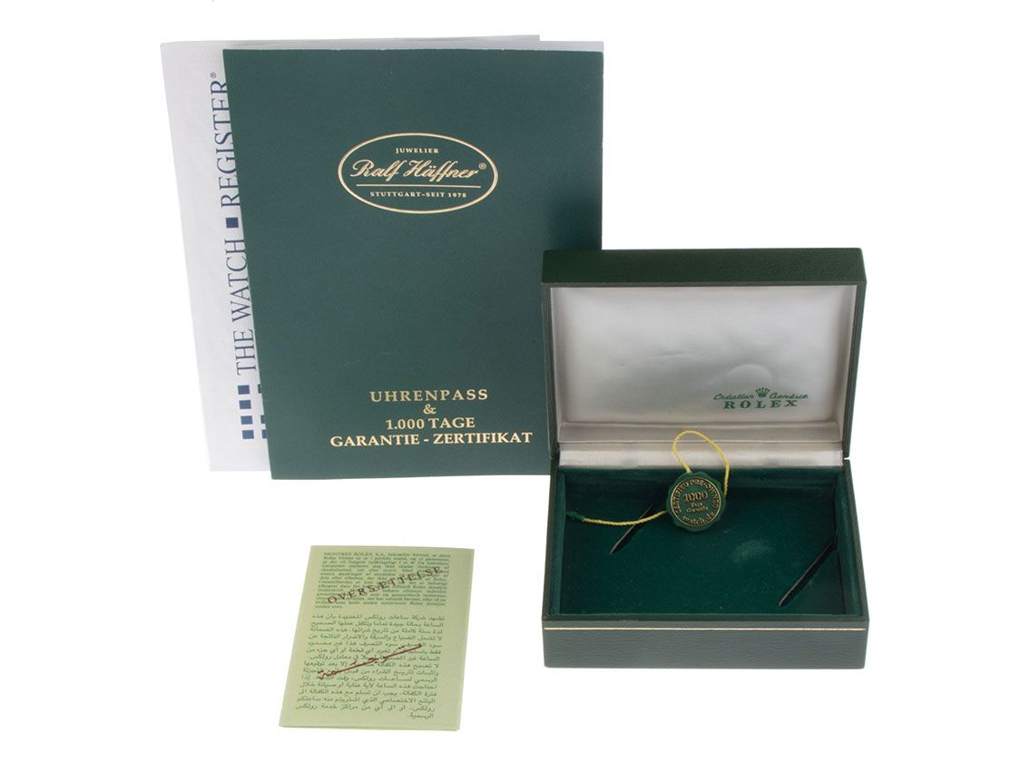 Incluye sello de certificado de segunda mano / pasaporte del reloj con una imagen a color, la descripción exacta y el valor de reposición del reloj superior a 2850,-€ y 1000 días de garantía a partir de la fecha de compra.