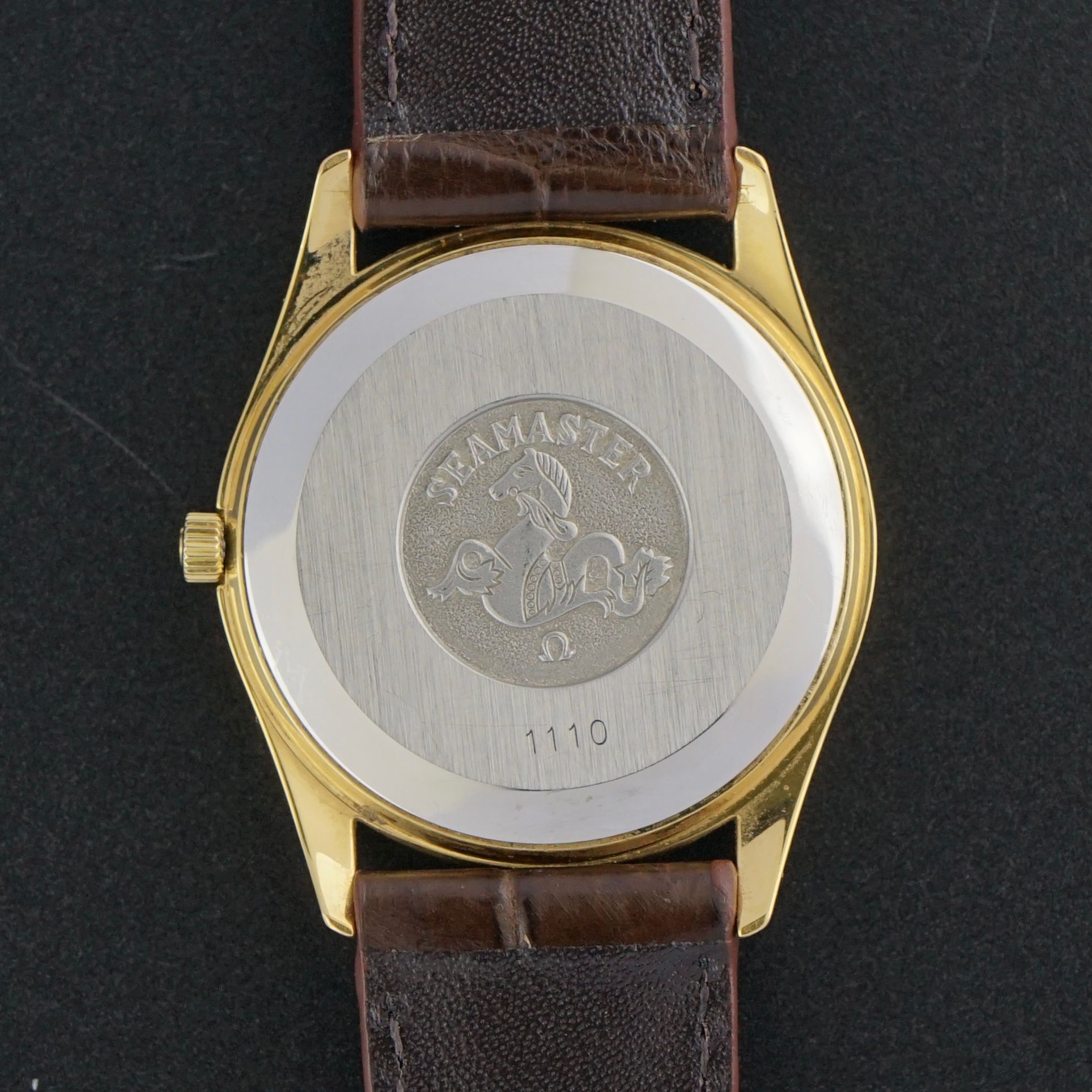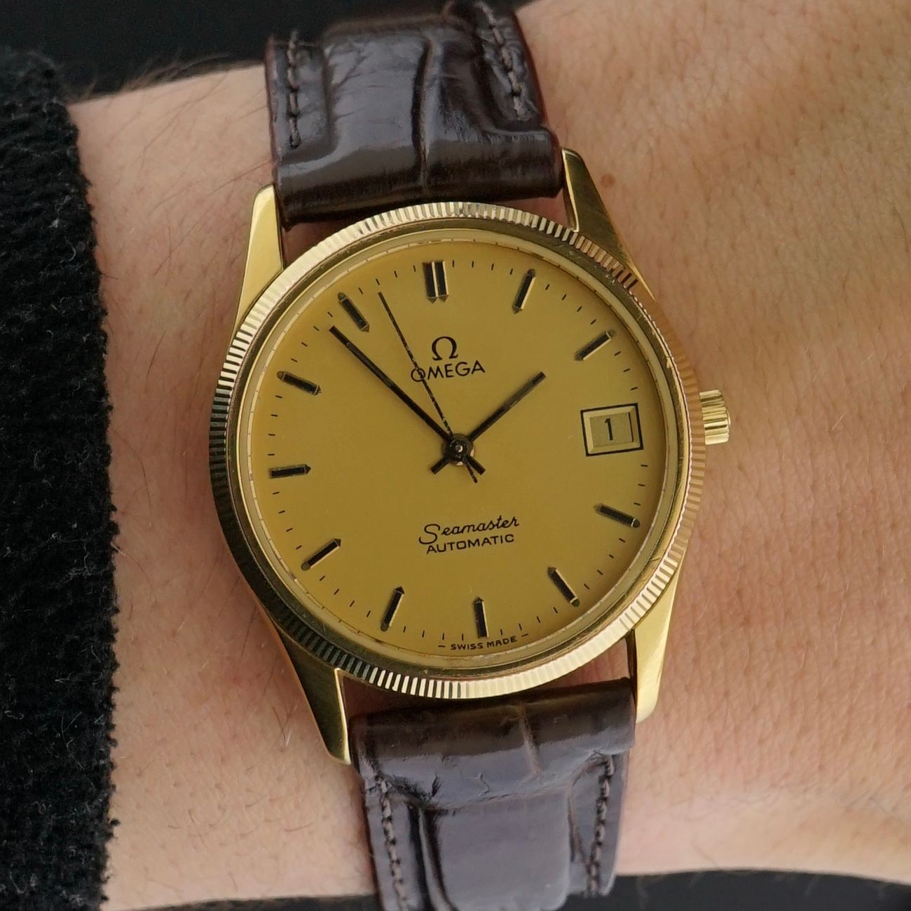 This vintage Omega Seamaster Automatic from 1982 features a beautiful golden dial housed in a steel case with gold plating, of which the original polish remains fully intact. The fluted bezel is also in good condition and complements the elegant design. Inside, it is powered by a caliber 1110 automatic movement, serviced in March 2026, now running and functioning excellently. We have paired this watch with a top grade brown leather strap with a crocodile motif. The overall condition of this piece is beautiful and it would make for a great dress watch.Year of production: 1982