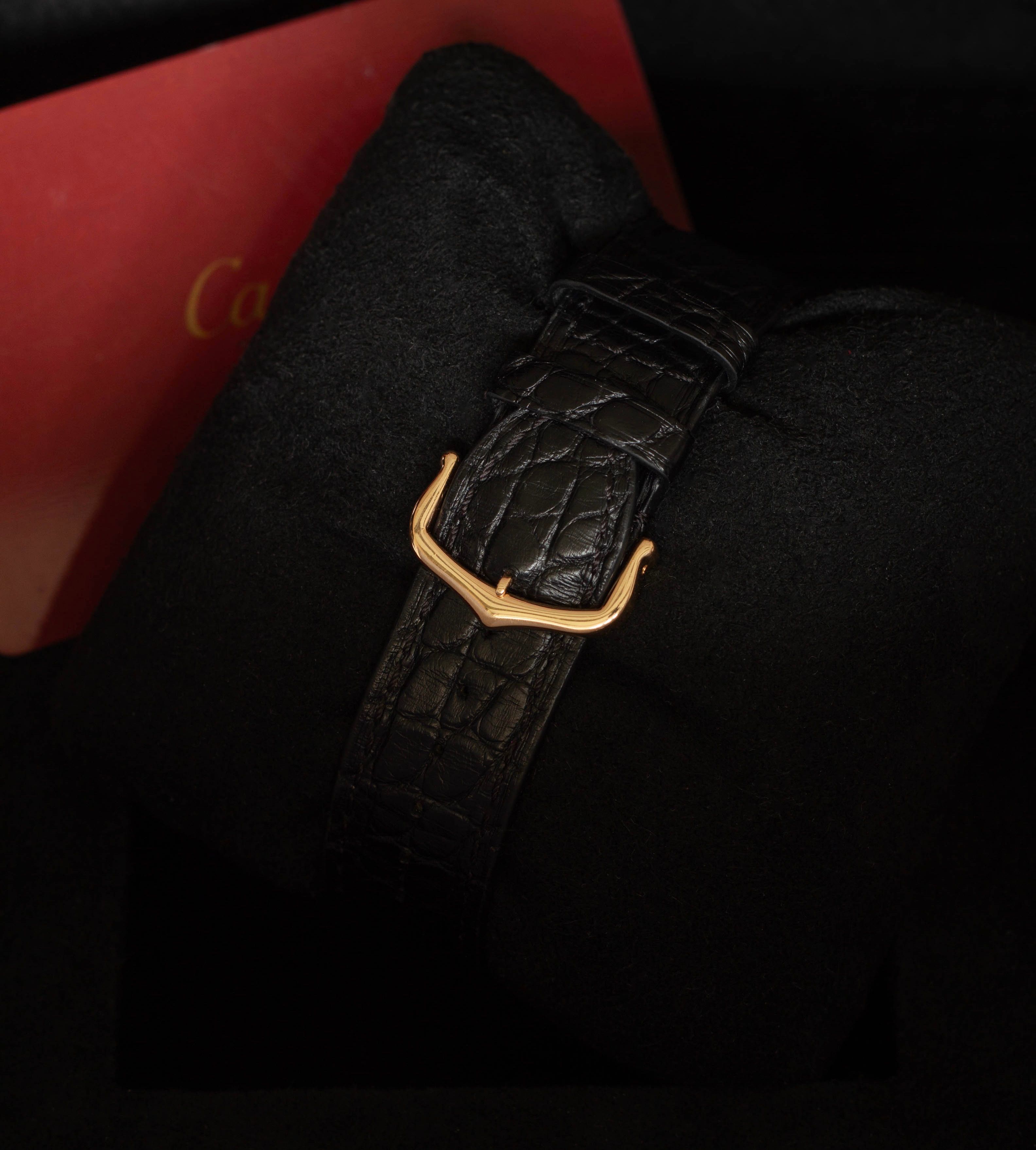 - Black leather strap with 18K yellow gold Cartier buckle
