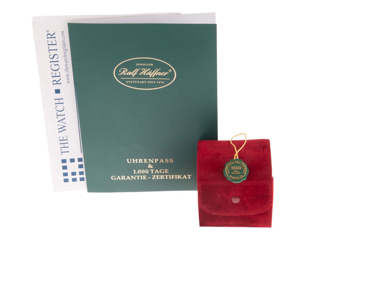 Inklusive certified pre owned Siegel / Uhrenpass mit einem Farbbild, der genauen Beschreibung sowie dem Wiederbeschaffungswert der Uhr über 6900,-€ und 1000 Tage Garantie ab Kaufdatum.