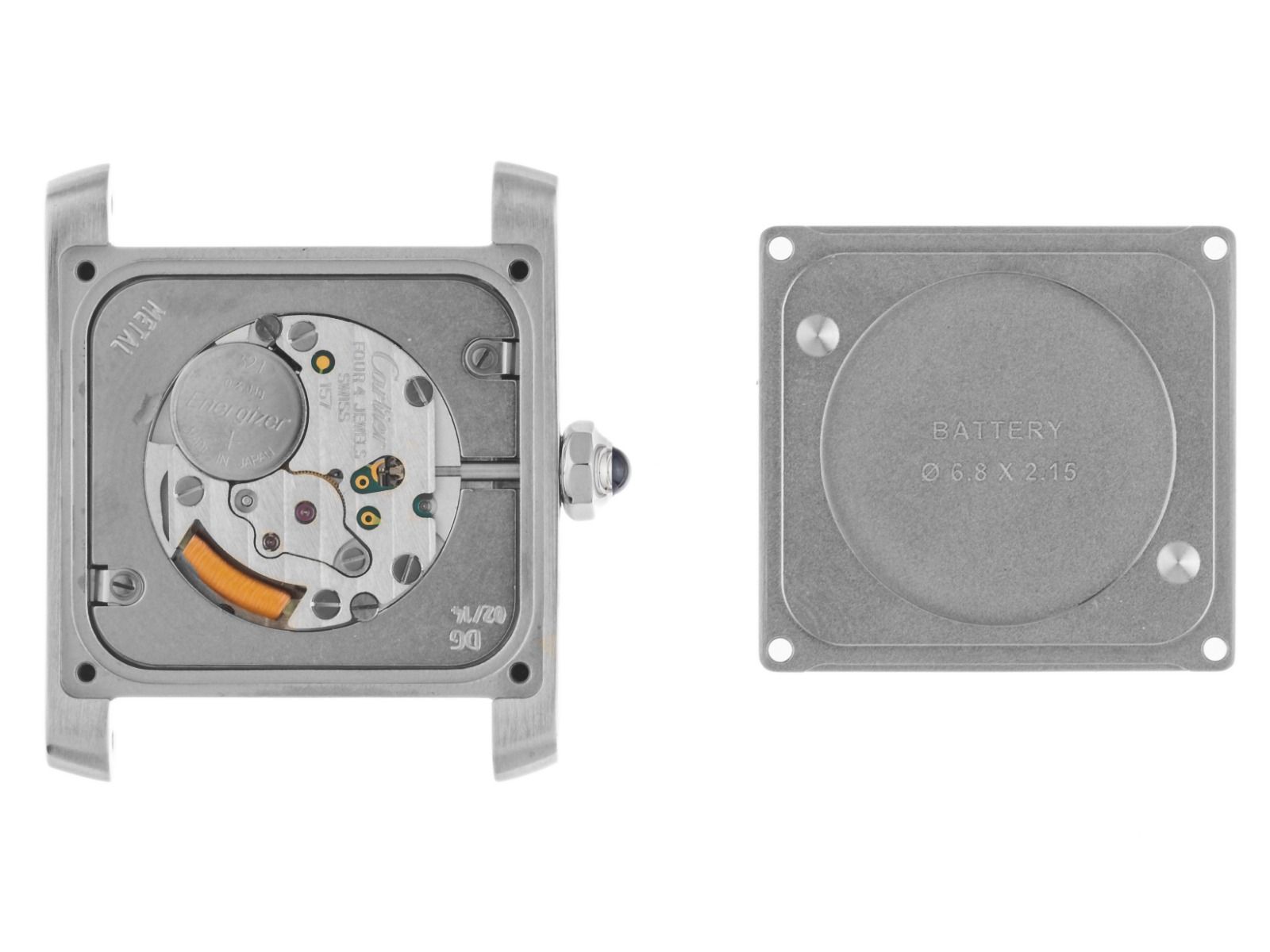 Caja de acero inoxidable pulido y satinado, rectangular, medidas de la caja sin corona (L x An x Al) 30 x 25 x 6,6 mm. Pulsera de acero inoxidable pulido y satinado, cierre desplegable oculto de acero inoxidable. Esfera color plata, guilloché con el número romano 12 en negro y índices de diamante aplicados, así como agujas azules. Movimiento de cuarzo, calibre 157 con 4 piedras preciosas. Indicación de horas y minutos a través de agujas centrales. Cristal de zafiro resistente a los arañazos. Corona con cabujón de zafiro. Fondo de acero inoxidable atornillado en 4 puntos y grabado. Peso del reloj incluyendo la pulsera 80 g, longitud de la pulsera incluyendo la caja 165 mm. Número de referencia: 3751, número de caja: 50967XXX, año de fabricación: 2016, ID: P263167000326HW-6900, número de artículo: 10000084605. Con control de marcha, nueva batería y restauración exterior completa de marzo de 2026. Estuche de viaje original de Cartier y extracto del registro de relojes de marzo de 2026, Certificado de The Watch Register / sin entrada (Base de datos internacional de relojes perdidos o robados). Superoferta, inversión con potencial de revalorización, pieza de colección muy rara, casi sin usar. Muy buen estado. Tiempo de entrega inmediato.