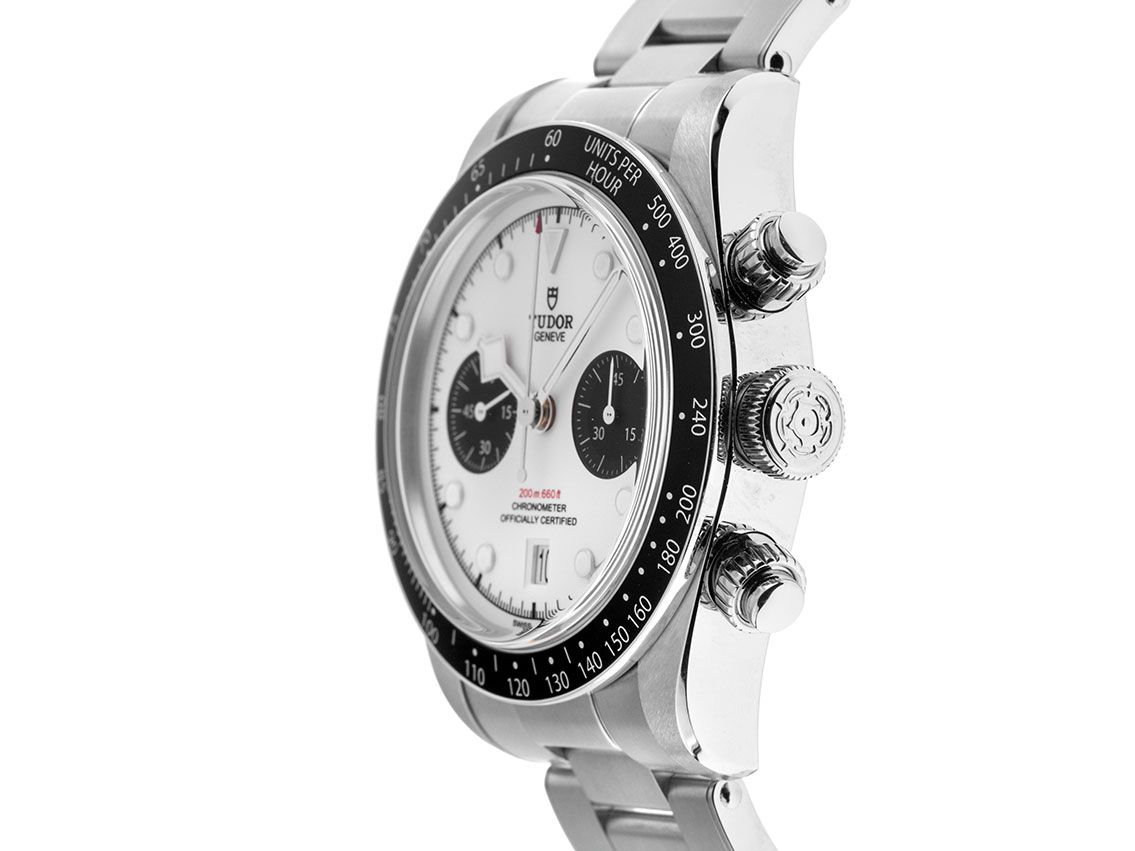 Tudor Black Bay Panda Stahl Automatik Chronograph Armband StahlGehäuse Edelstahl poliert und satiniert, Gehäusedurchmesser ohne Krone 41mm, Gehäusehöhe 14,5mm. Lünette Edelstahl mit schwarzem Inlay und Tachymeterskala. Armband Edelstahl poliert und satiniert, Sicherheitsfaltschließe Edelstahl mit Hersteller-Logo. Zifferblatt silberfarben mit aufgesetzten Edelstahl Leuchtindexen und polierten Edelstahl Leuchtzeigern. Uhrwerk Automatik Chronograph, Chronometer mit Zeugnis, Manufakturkaliber Tudor MT5813. Anzeige von Stunde und Minute über Zeiger aus der Mitte, kleine Sekunde mit Sekundenstopp zur sekundengenauen Einstellung der Uhrzeit bei 9 Uhr. Saphirglas kratzfest. Krone verschraubbar mit Hersteller-Logo. Boden Edelstahl verschraubt und graviert. Gewicht der Uhr inklusive Armband 185g, Länge des Armbandes inklusive Gehäuse 205mm. Wasserdicht bis 20 ATM. Referenznummer: M79360N-0012, ID: P246470000326H-6120, Artikelnummer: 10000085059. Original Tudor Box mit Umkarton und Garantie Papiere von Januar 2022 sowie Watchregister Auszug von März 2026, The Watch Register Zertifikat / ohne Eintrag (Internationale Datenbank für verlorene oder gestohlene Uhren), Full Set. Wie Neu. Lieferzeit sofort.