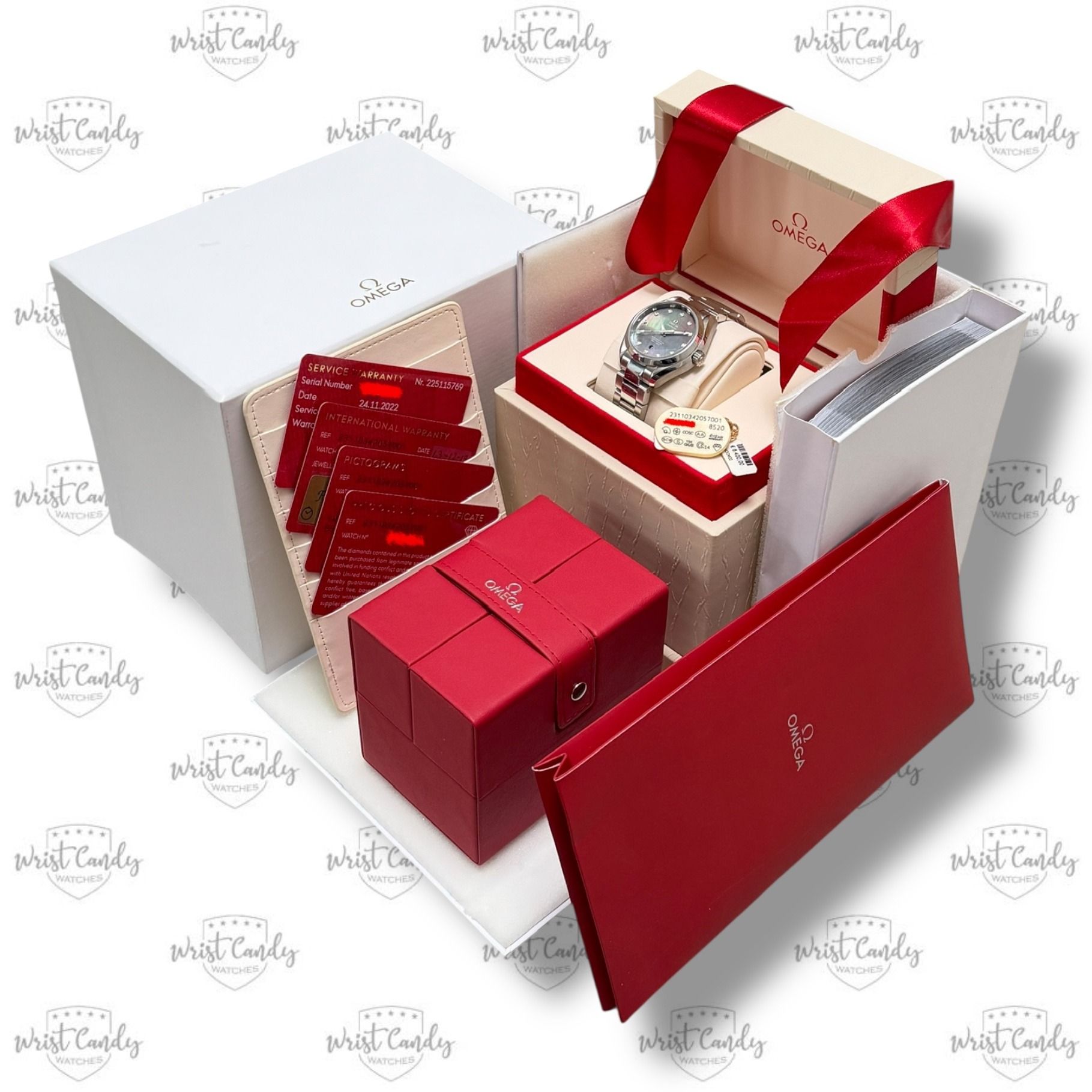 incluido • set completo con tarjetas de servicio Omega, caja de servicio y factura de compra original Driessen Haarlem